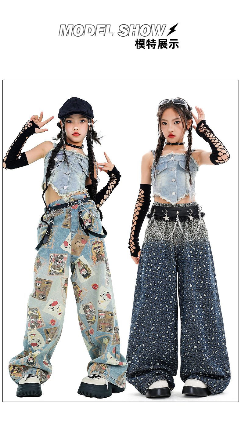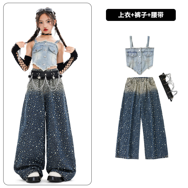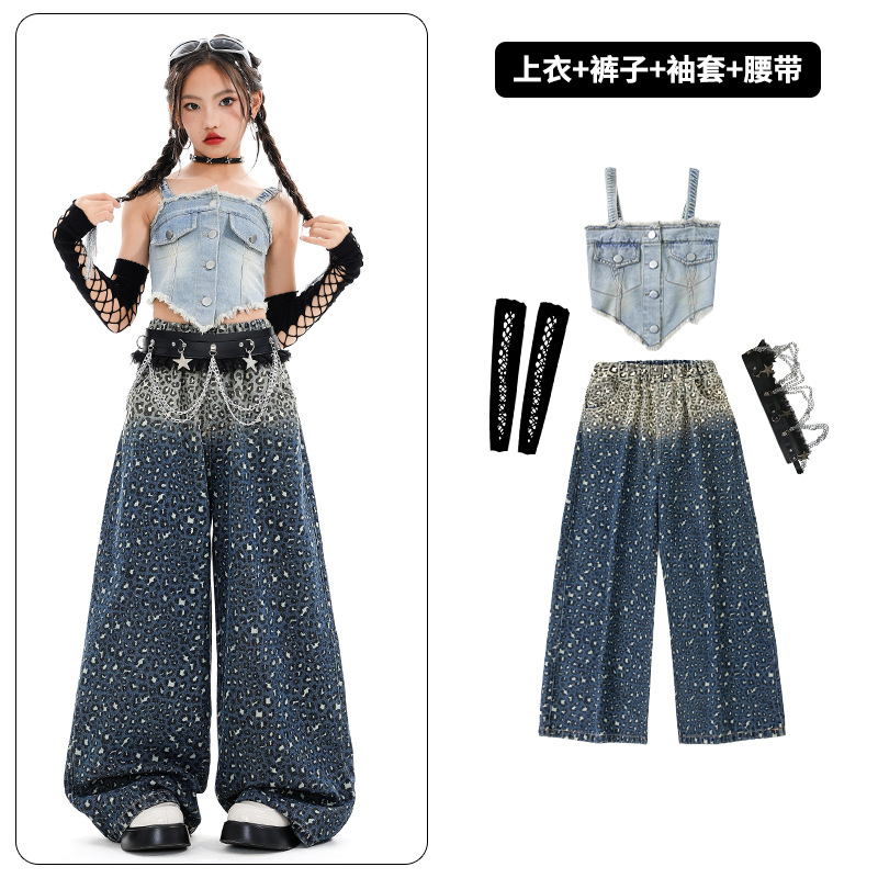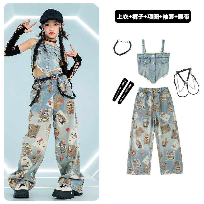여자 재즈 댄스 스트리트 댄스 의류 여름 배꼽 스트랩 데님 슈트 여자 패션쇼 유행 의류 재즈 댄스 의류