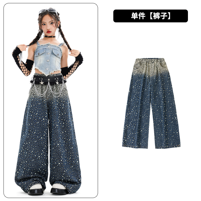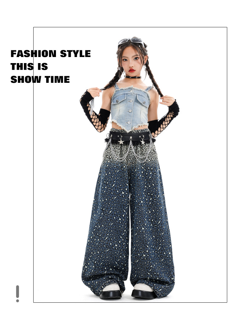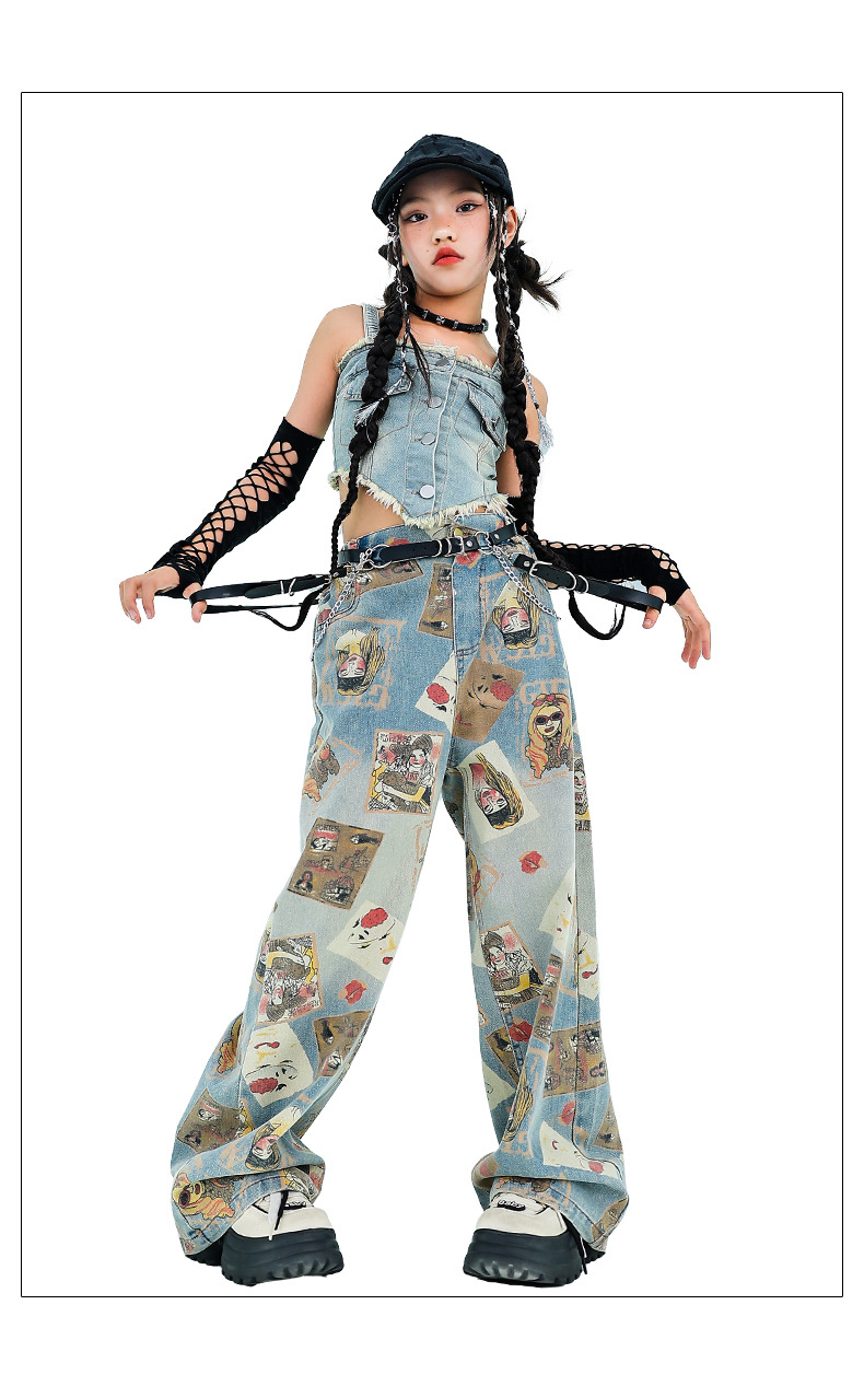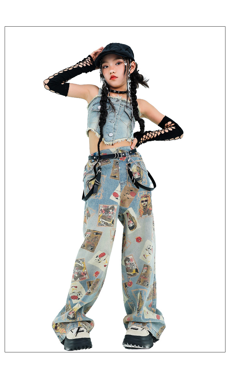 여자 재즈 댄스 스트리트 댄스 의류 여름 배꼽 스트랩 데님 슈트 여자 패션쇼 유행 의류 재즈 댄스 의류
