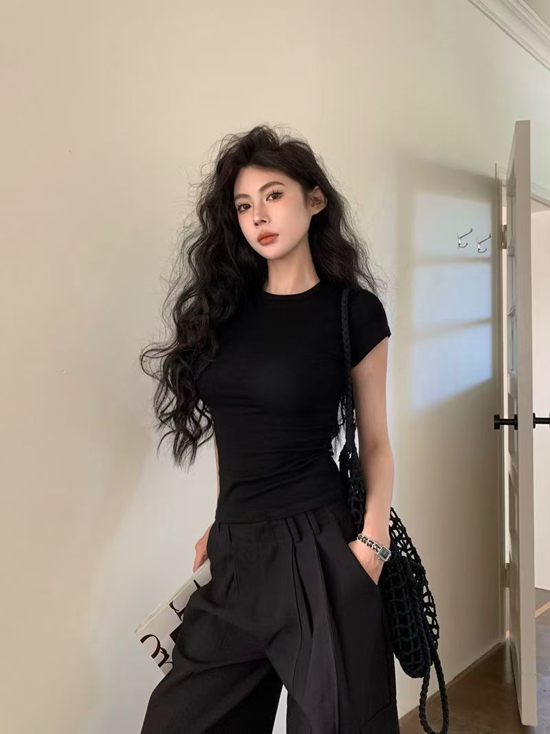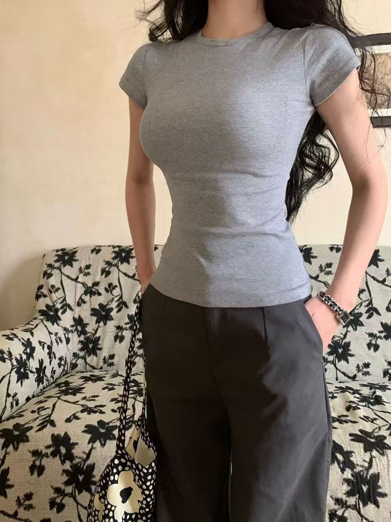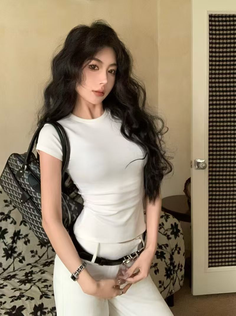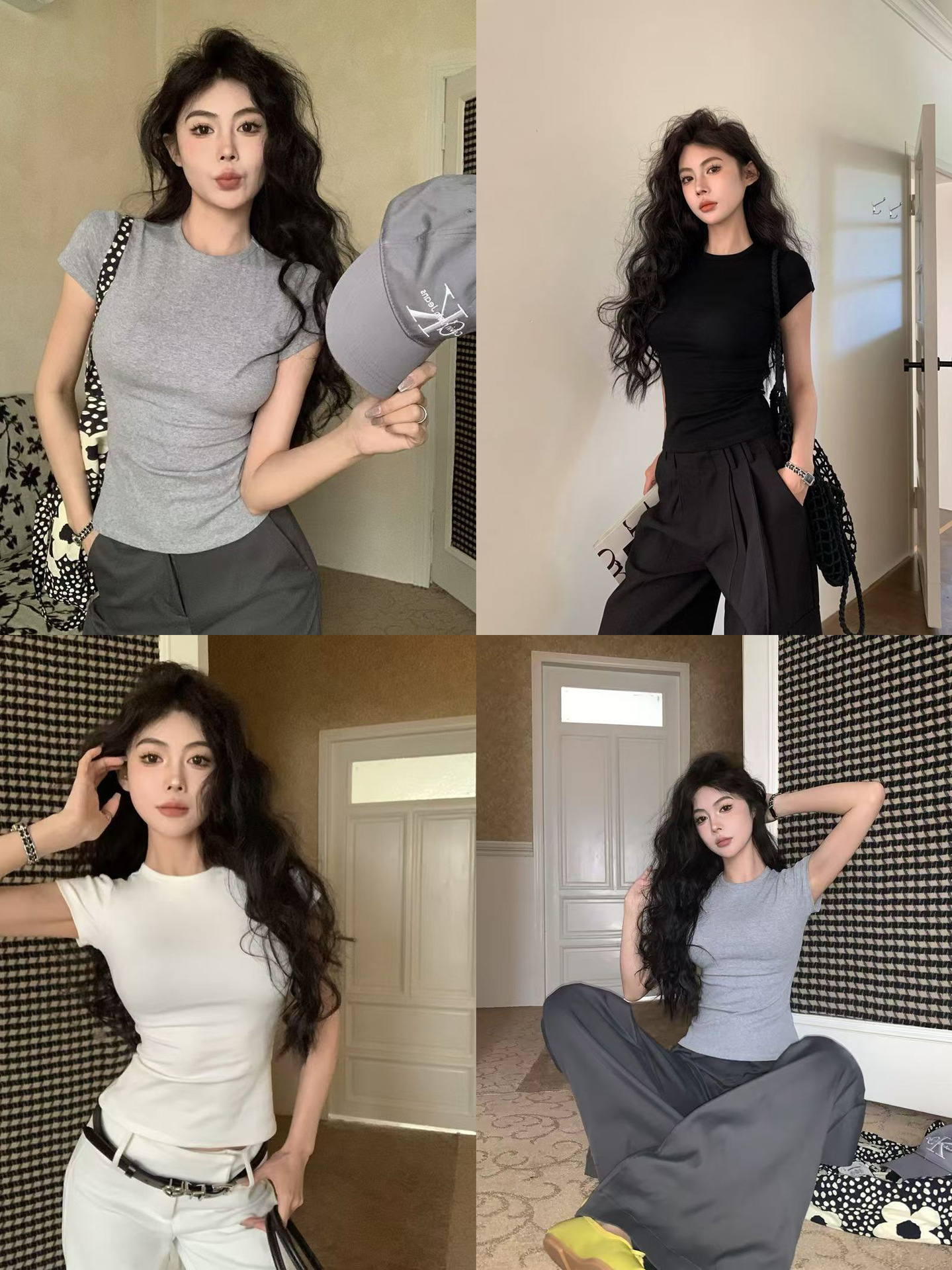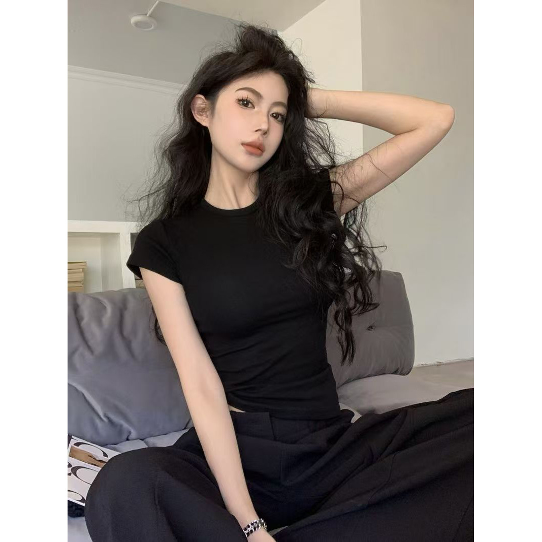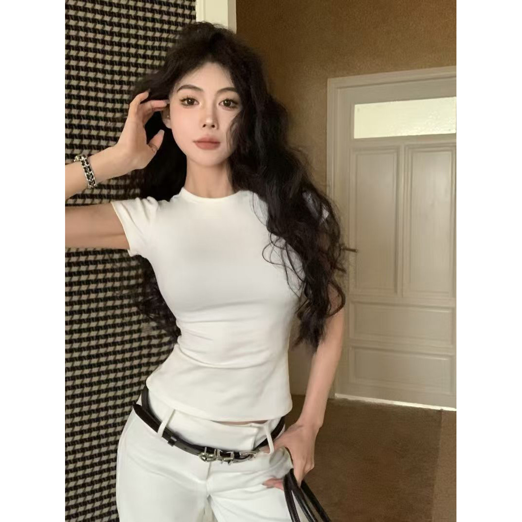 여성을위한 오른쪽 어깨 허리 반팔 티셔츠 2025 여름 새로운 스타일 짧은 슬림 피트 솔리드 컬러 동남 아시아 여성상의스토어 가기