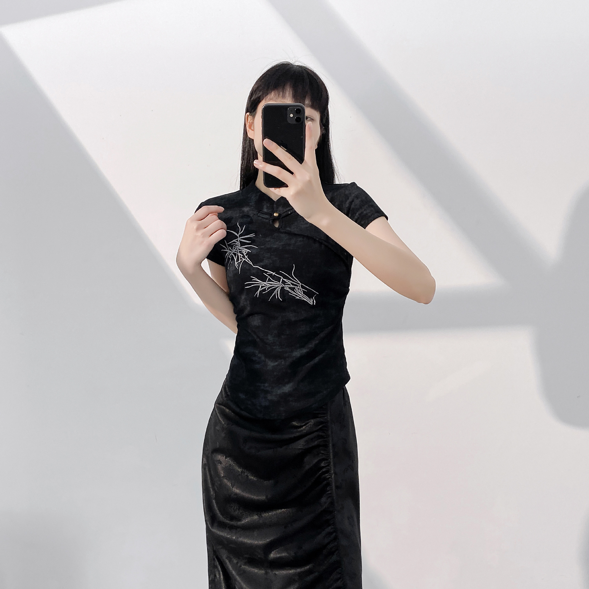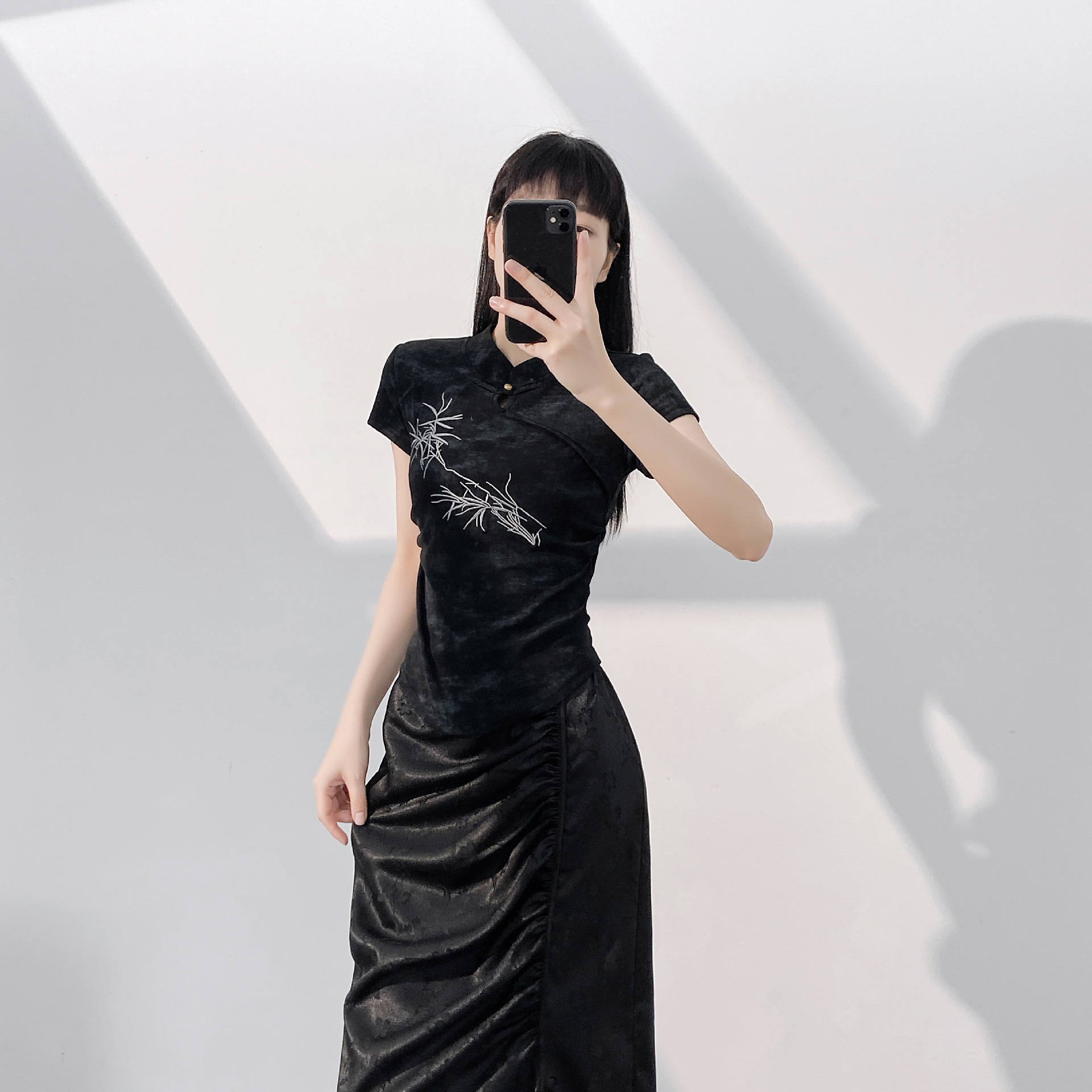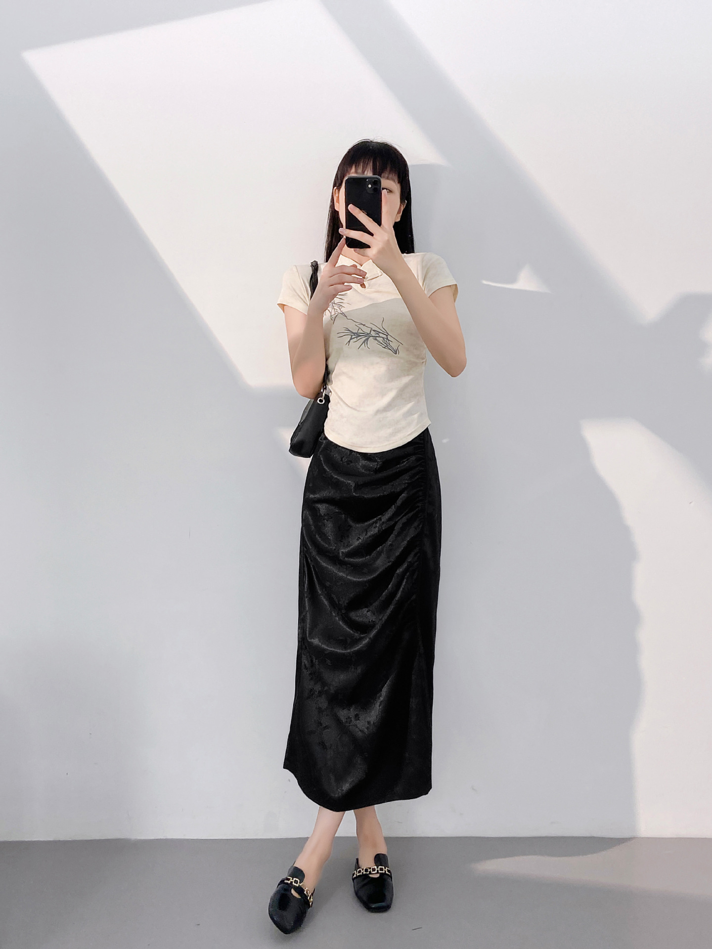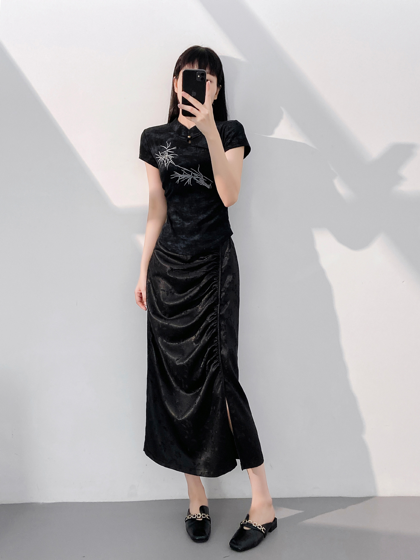 2025 여름 새로운 중국 스타일 정장 여성 허리 슬리밍 짧은 소매 새틴 자카드 하이 엔드 스커트스토어 가기