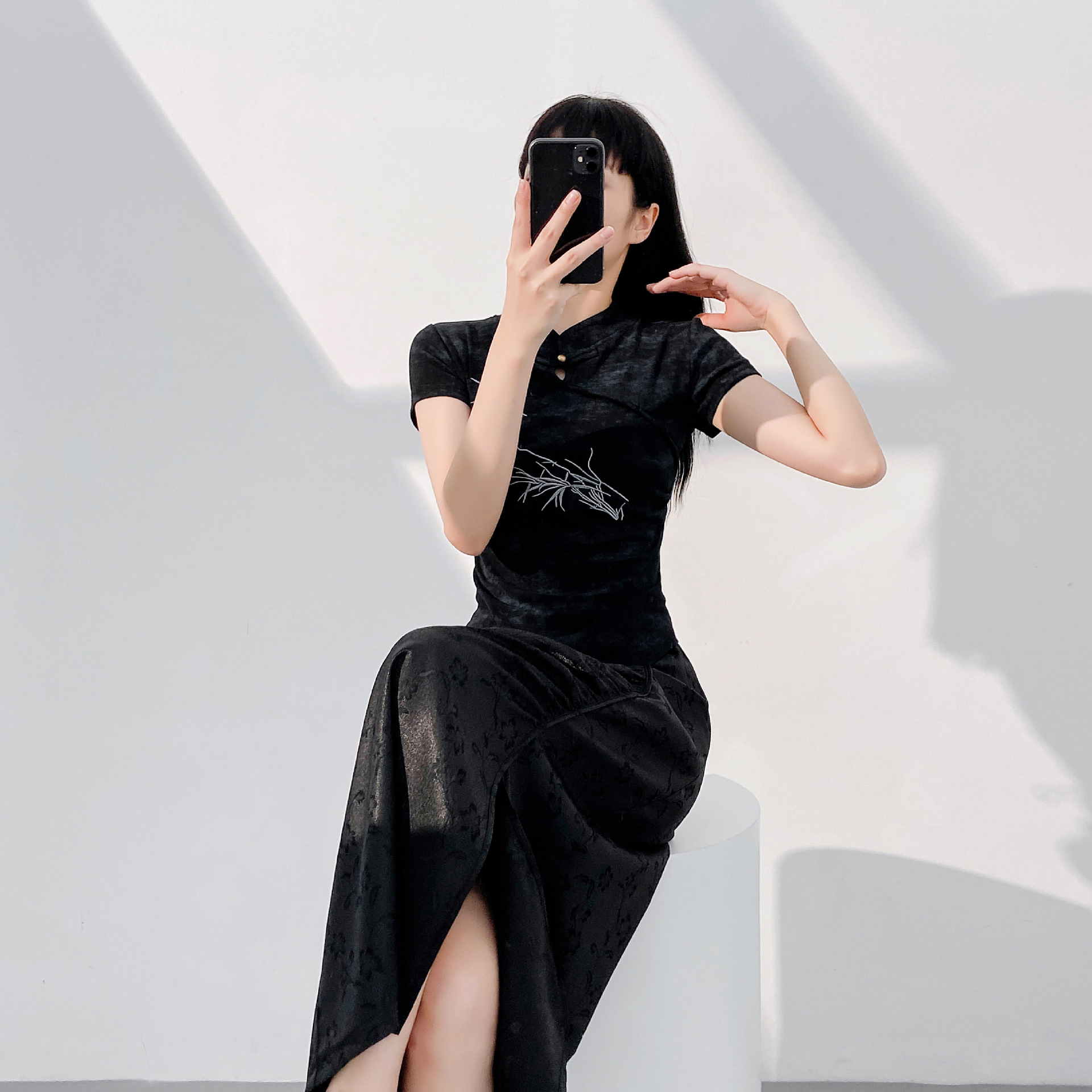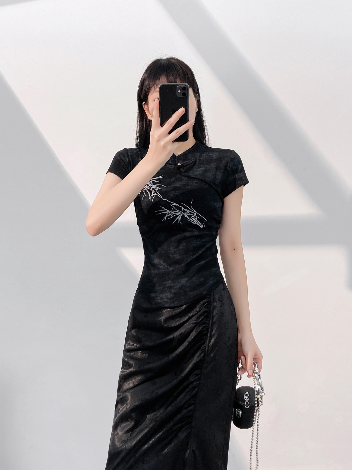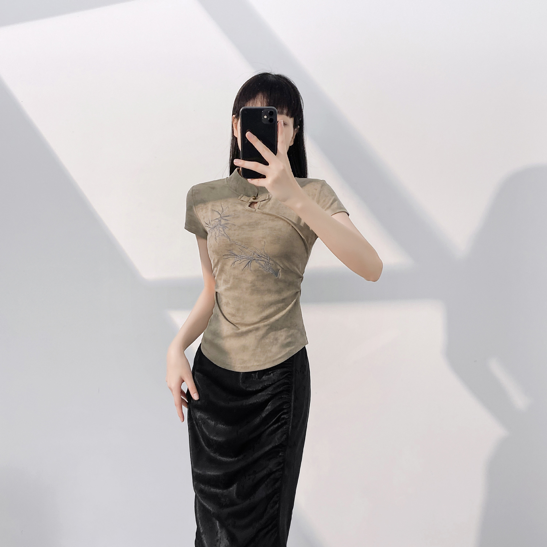 2025 여름 새로운 중국 스타일 정장 여성 허리 슬리밍 짧은 소매 새틴 자카드 하이 엔드 스커트스토어 가기