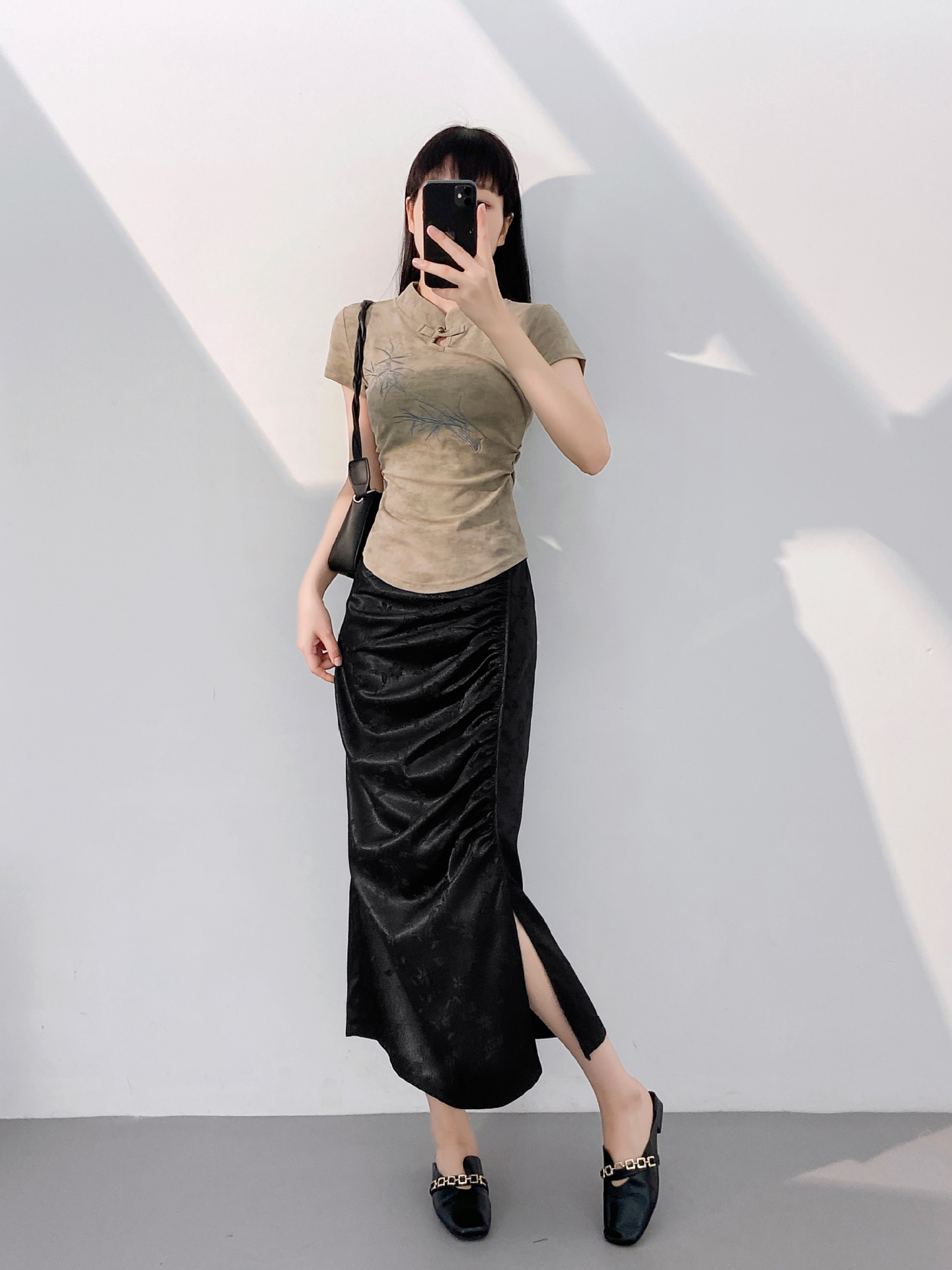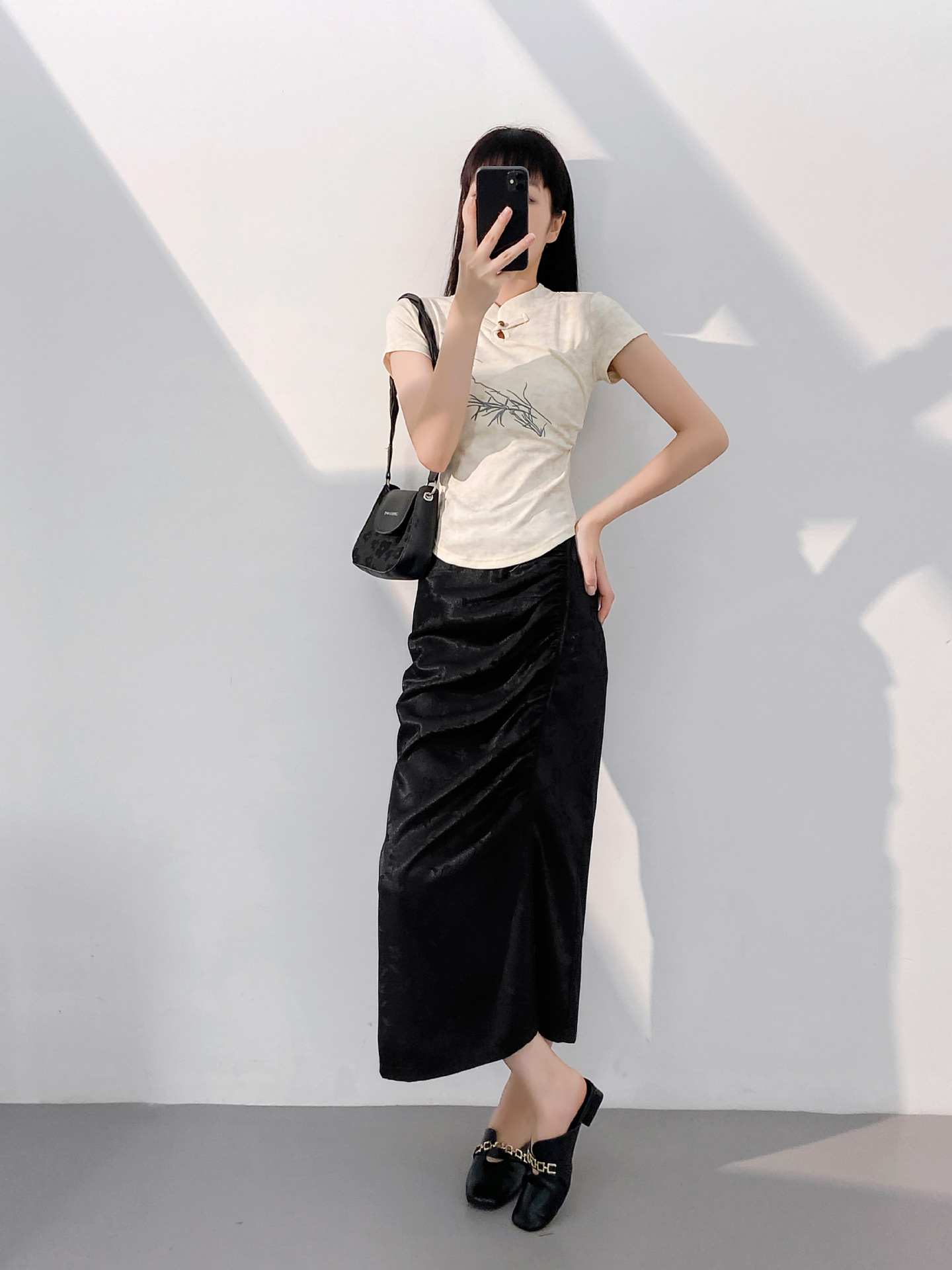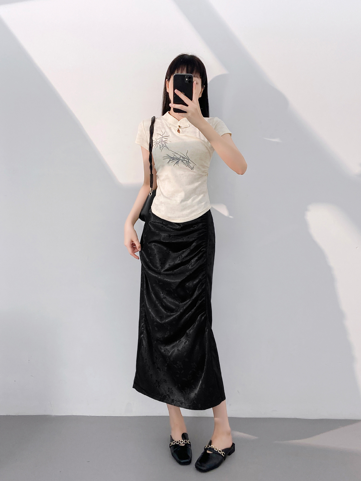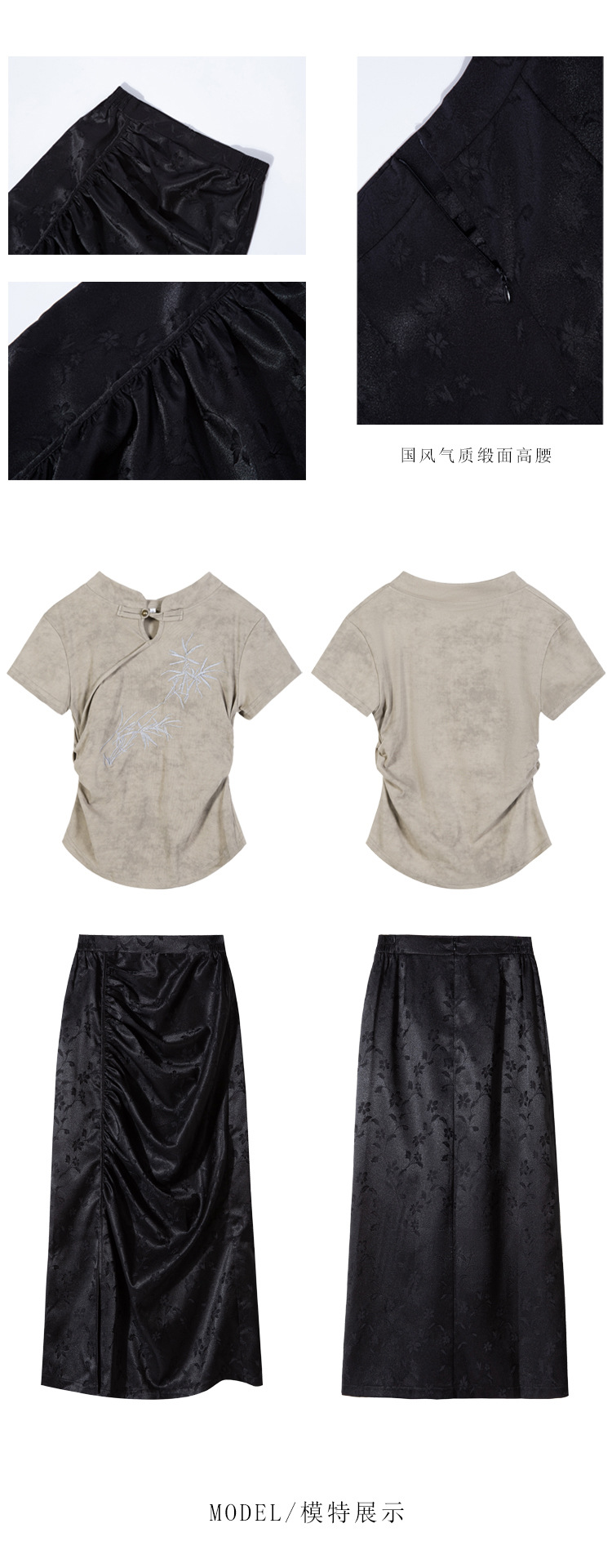 2025 여름 새로운 중국 스타일 정장 여성 허리 슬리밍 짧은 소매 새틴 자카드 하이 엔드 스커트