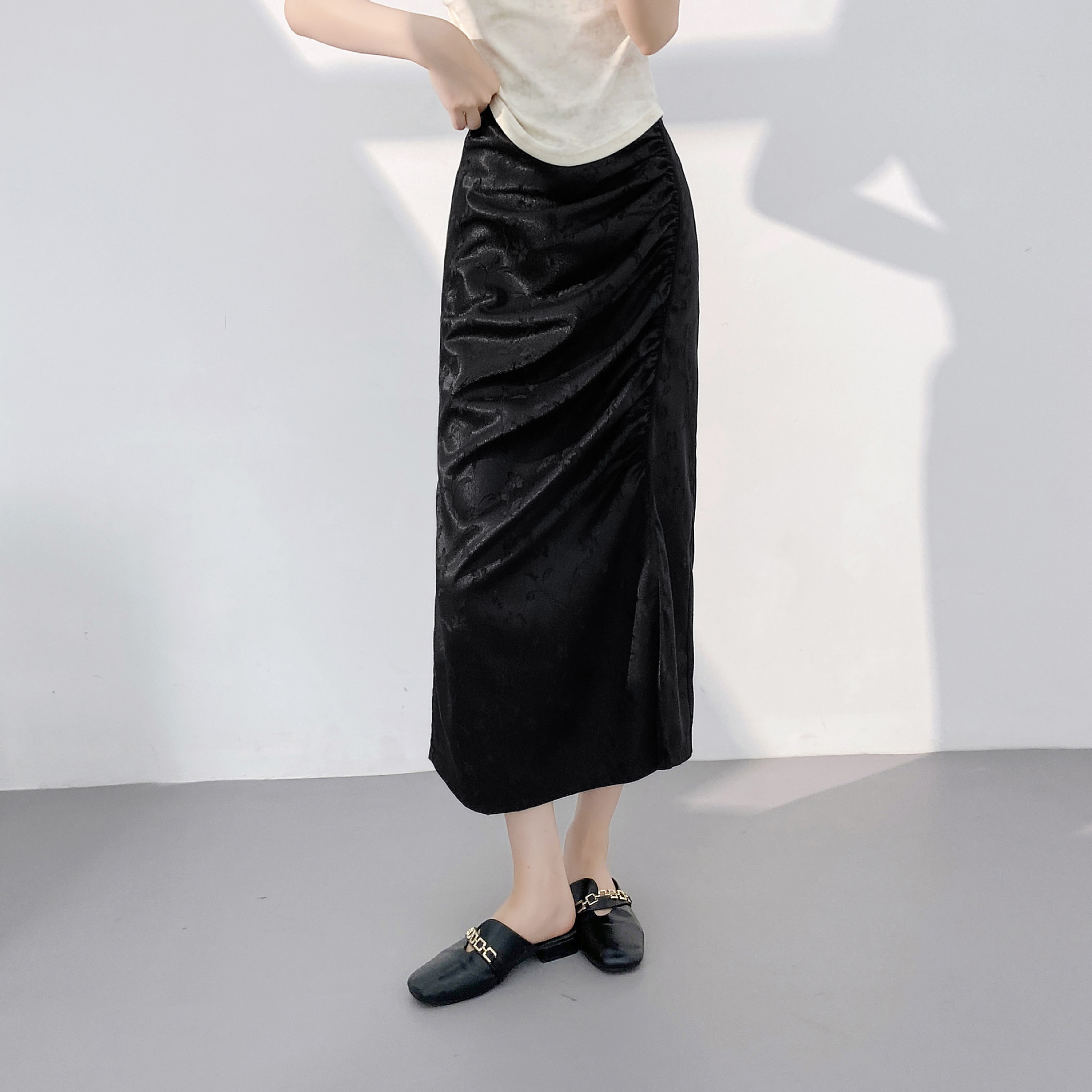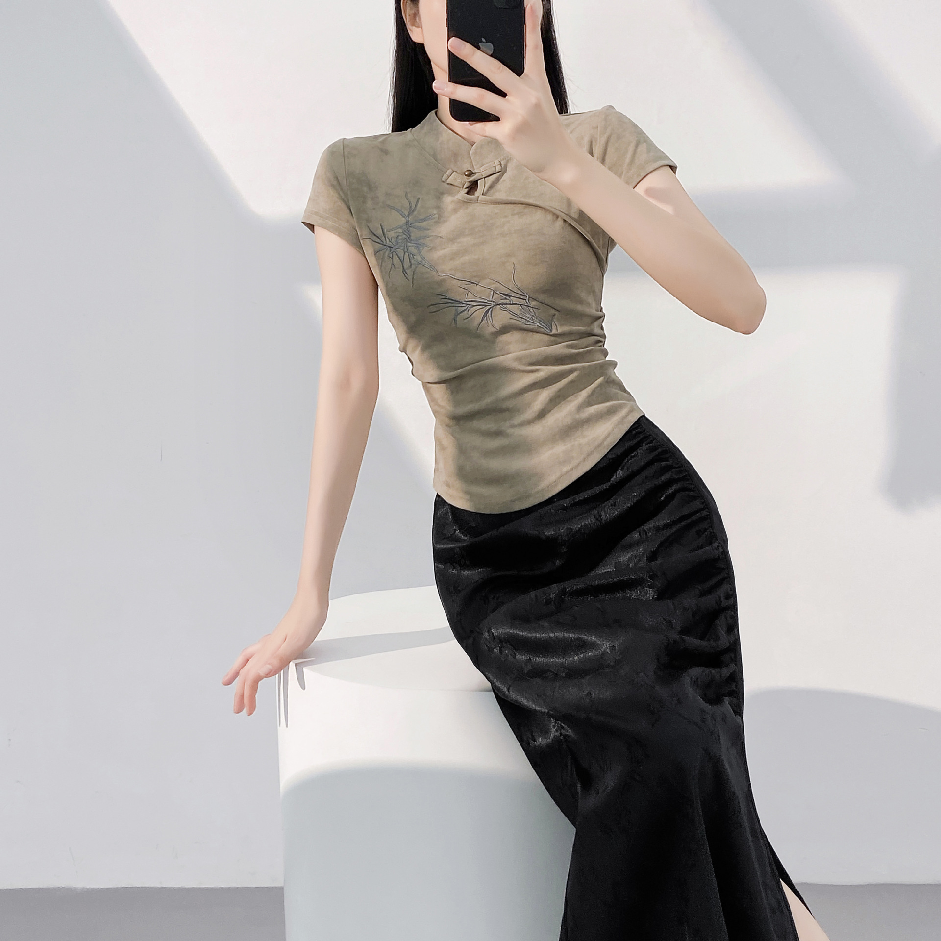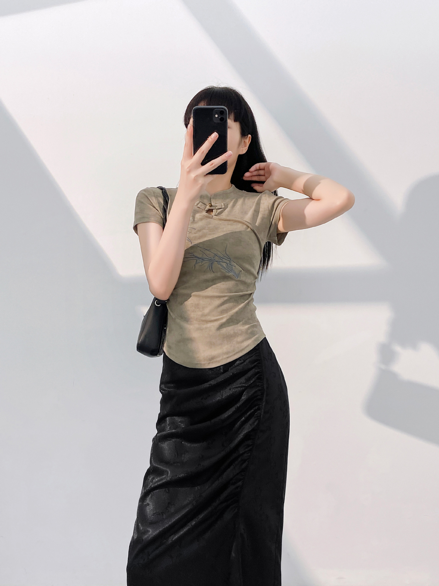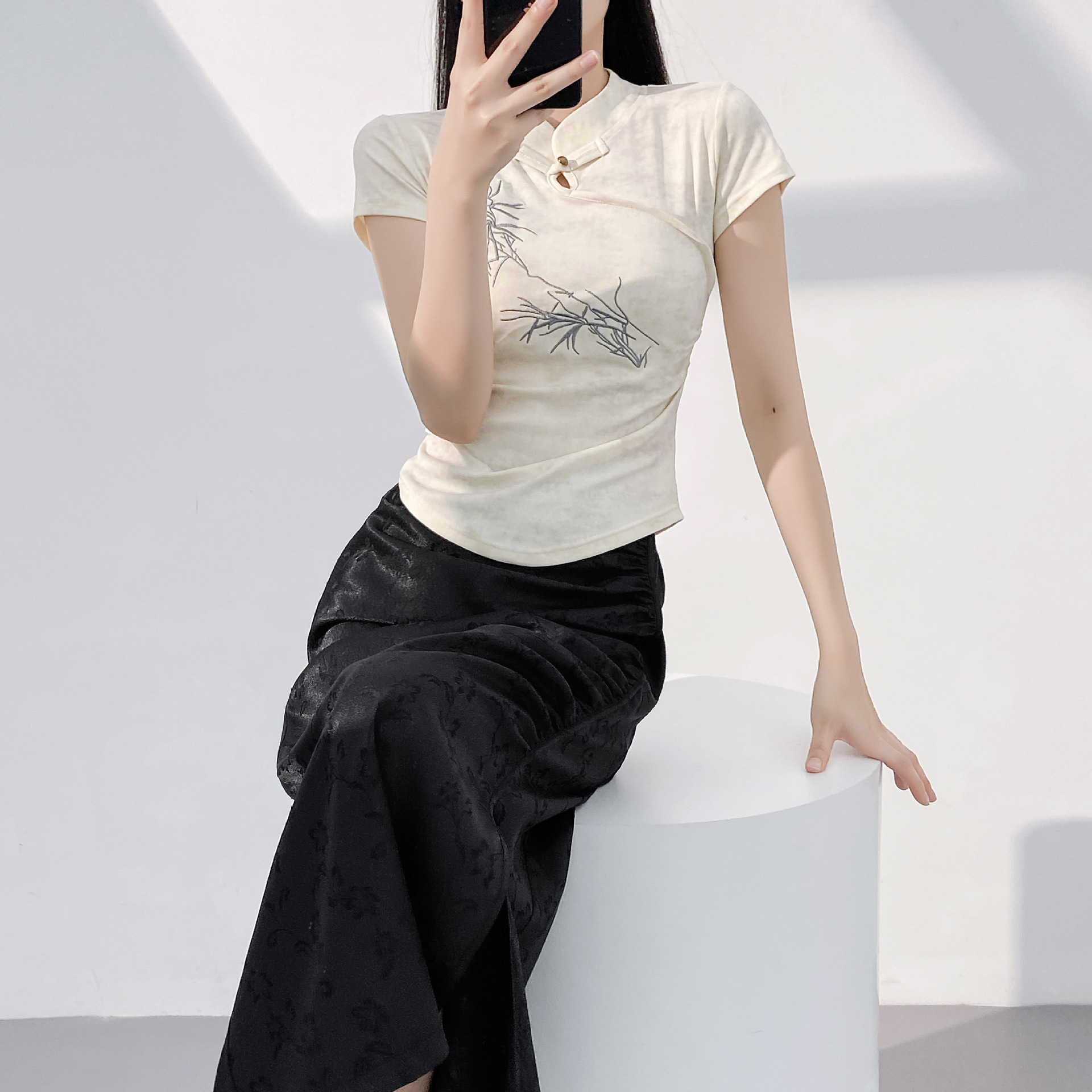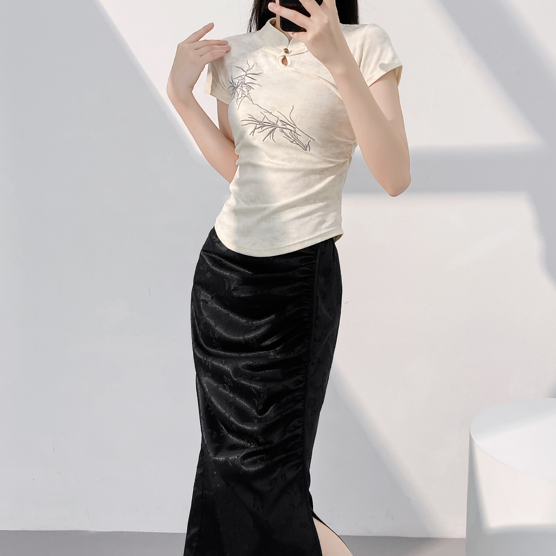 2025 여름 새로운 중국 스타일 정장 여성 허리 슬리밍 짧은 소매 새틴 자카드 하이 엔드 스커트