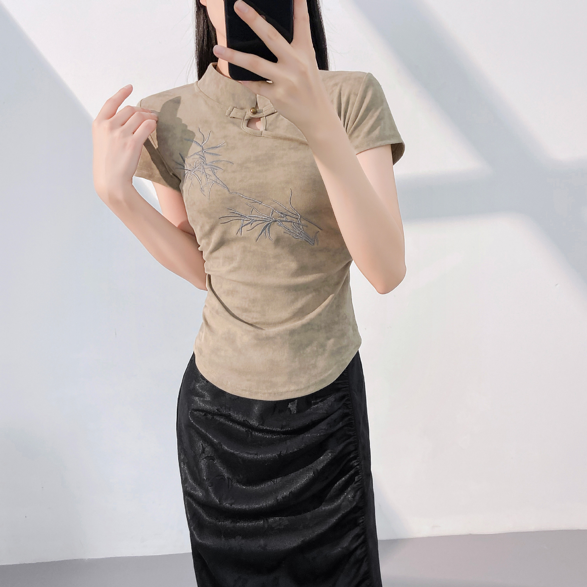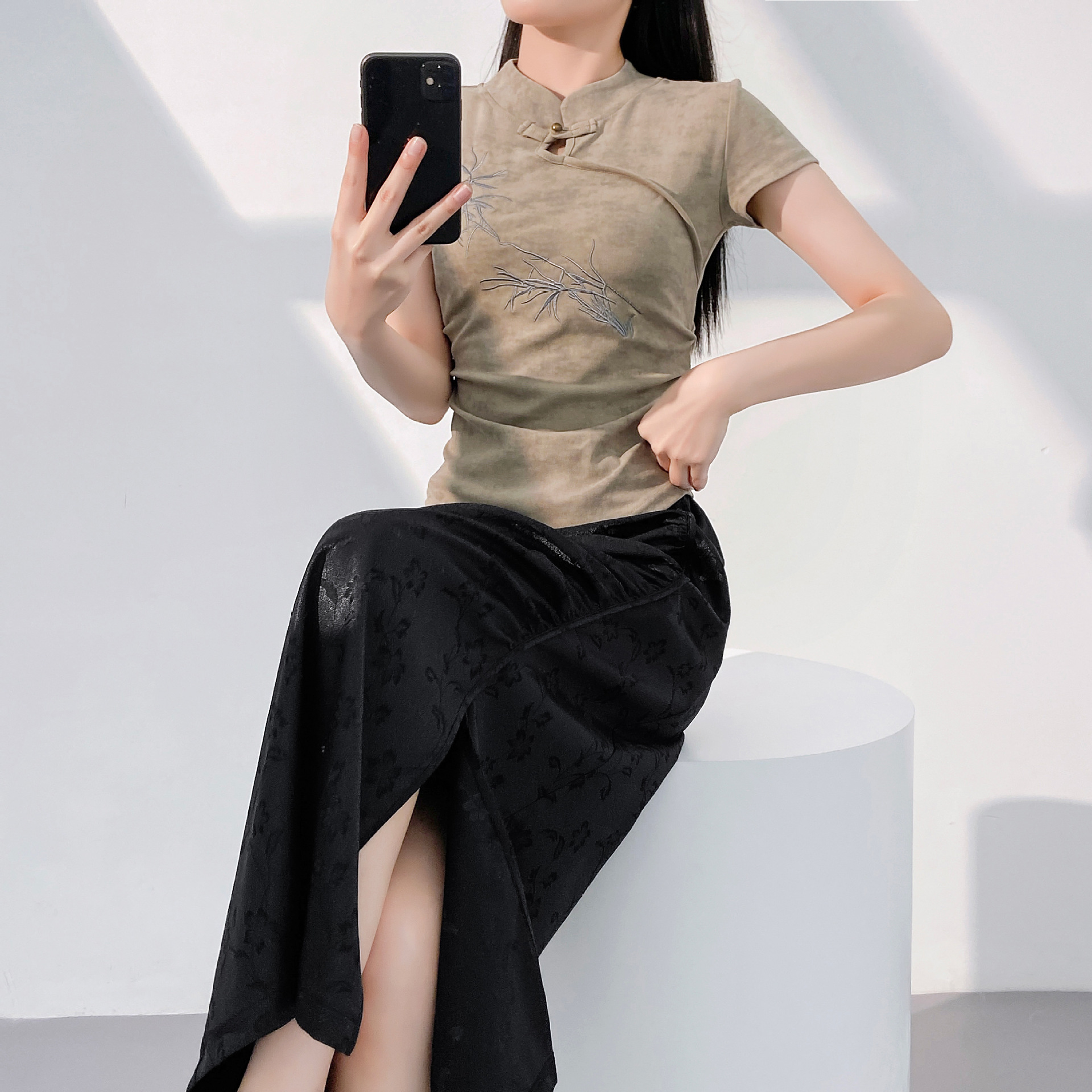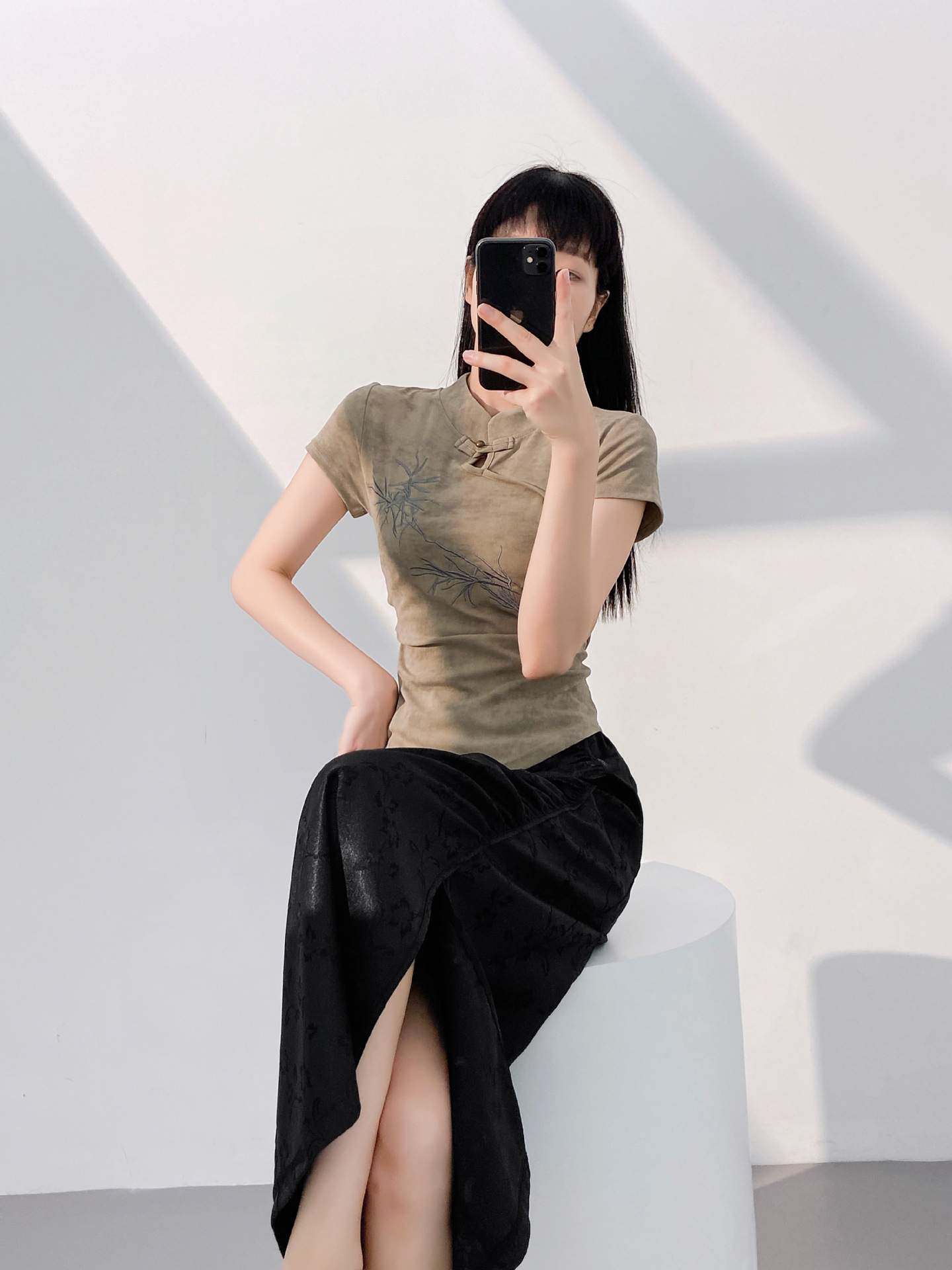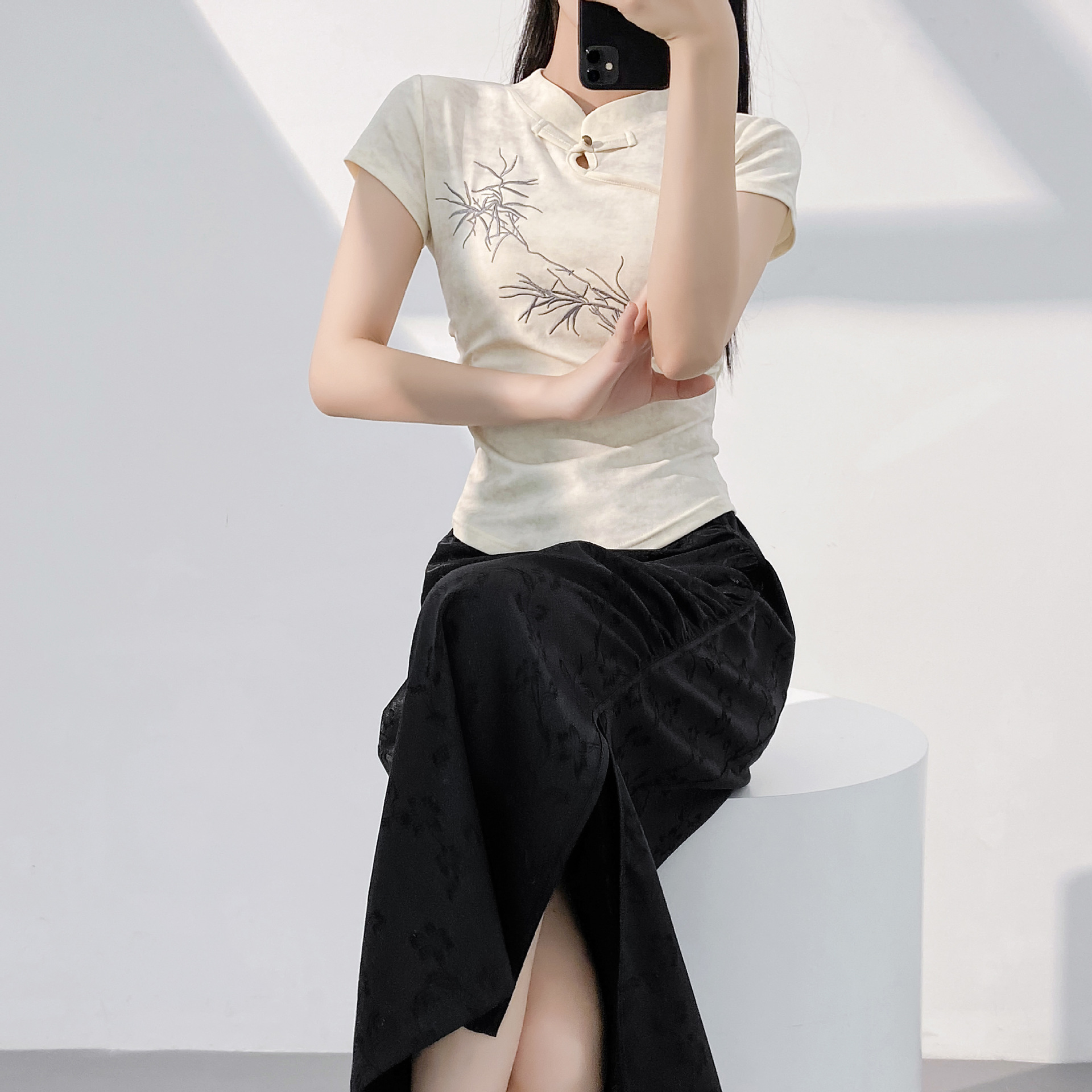 2025 여름 새로운 중국 스타일 정장 여성 허리 슬리밍 짧은 소매 새틴 자카드 하이 엔드 스커트