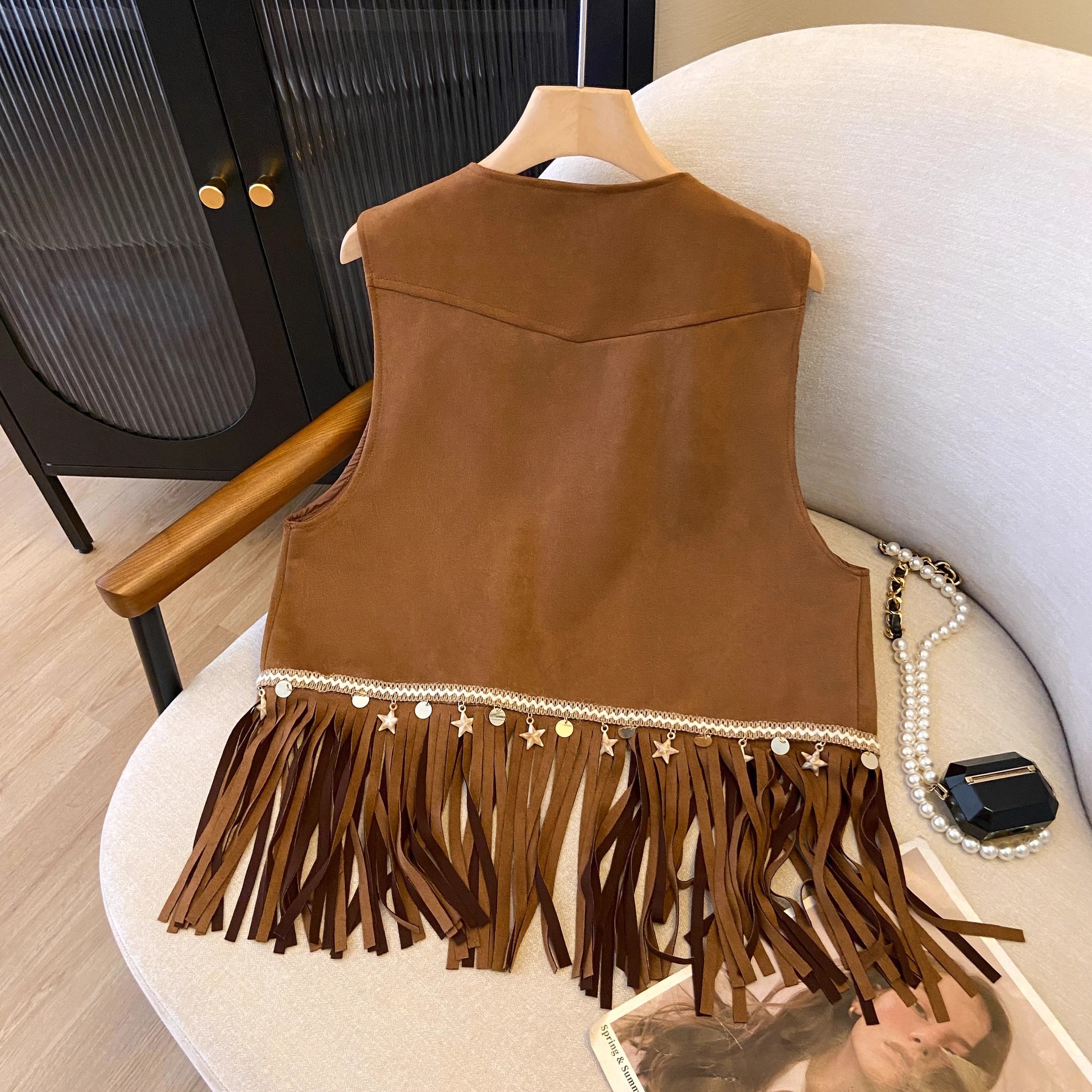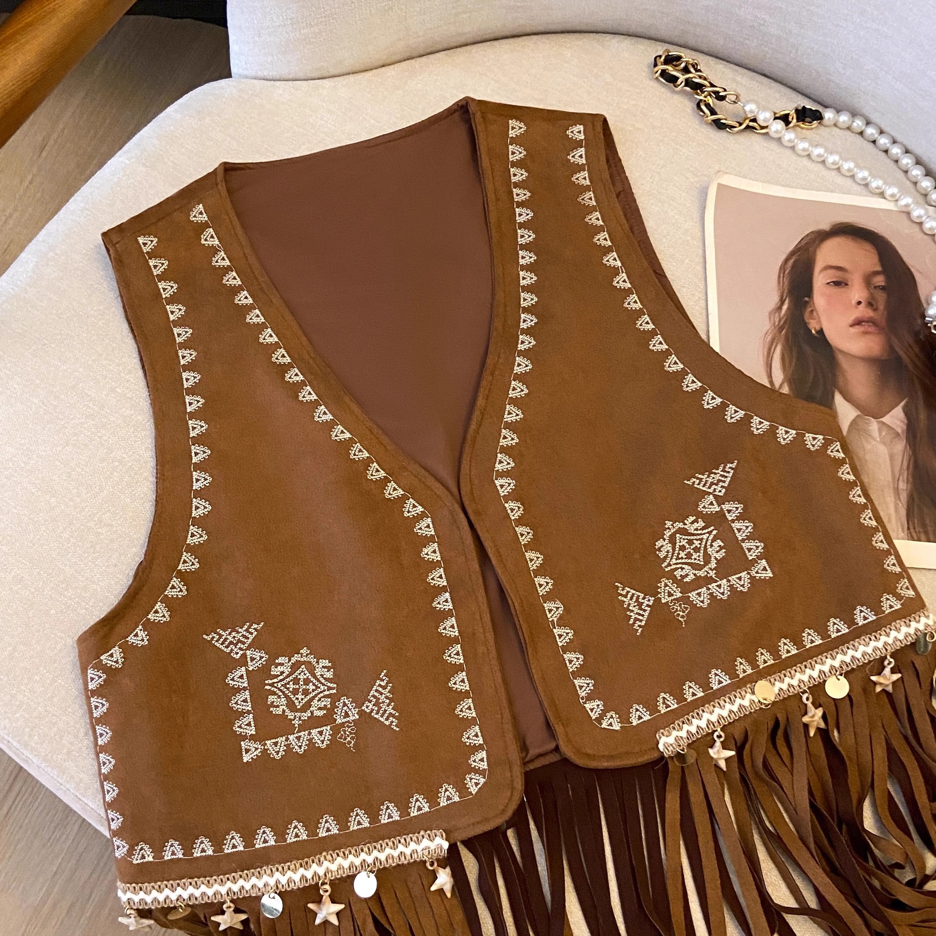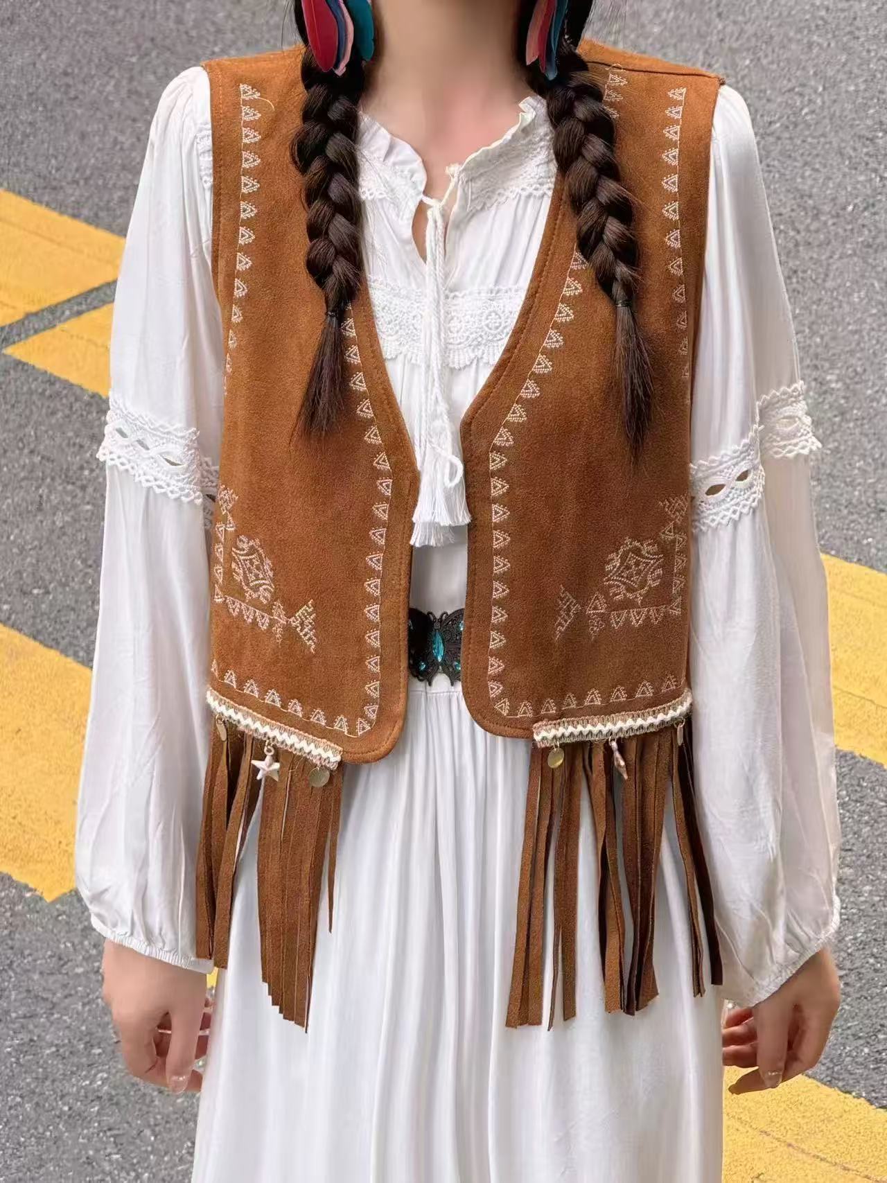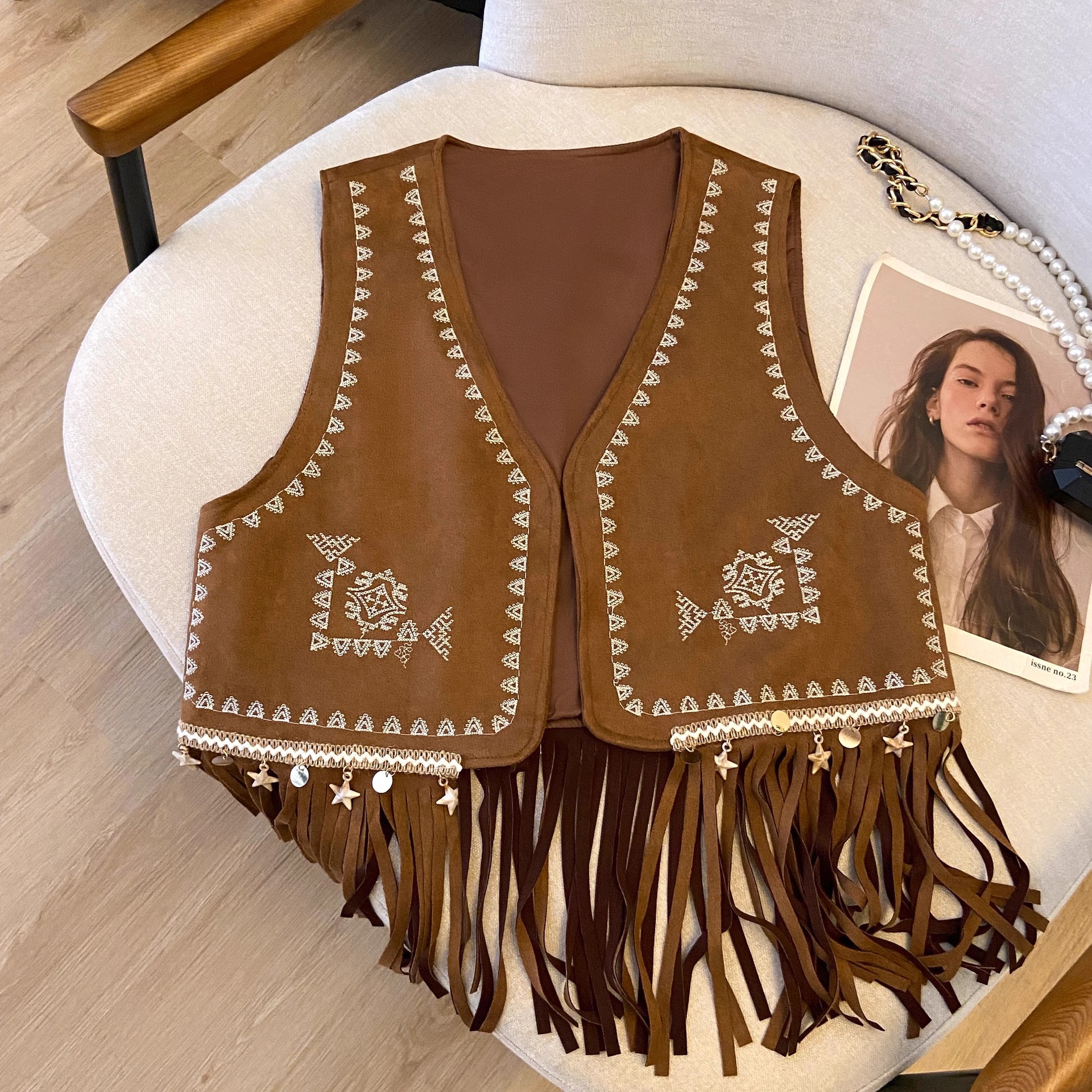 여성용 운남 서부 휴가 복고풍 술 조끼, 스웨이드 레이어드 민소매 탑, 에스닉 스타일 자수 아우터