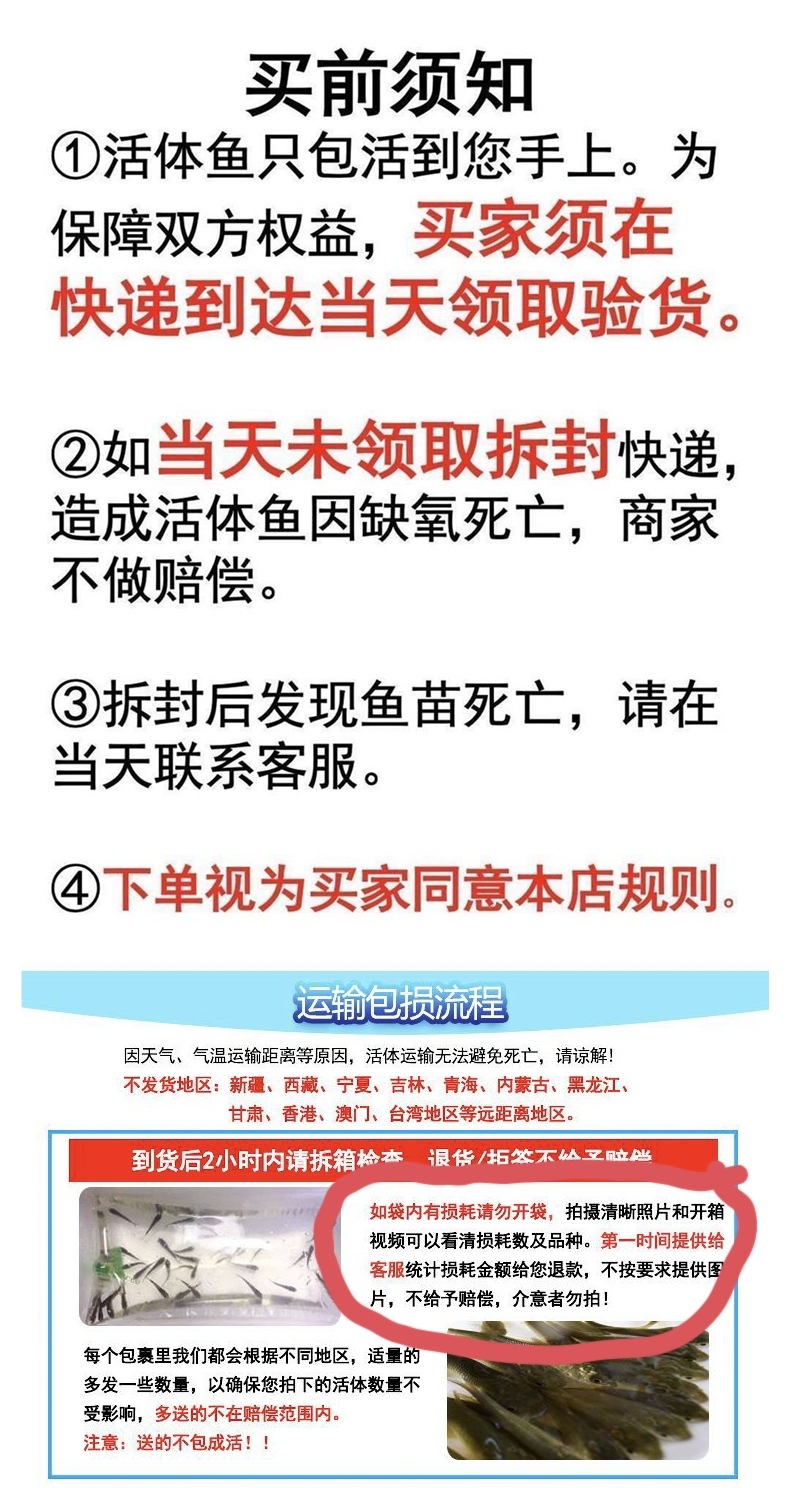 • 6~7cm의 먹이 물고기 100마리, 도로 손상 방지를 위해 5% 무료 제공