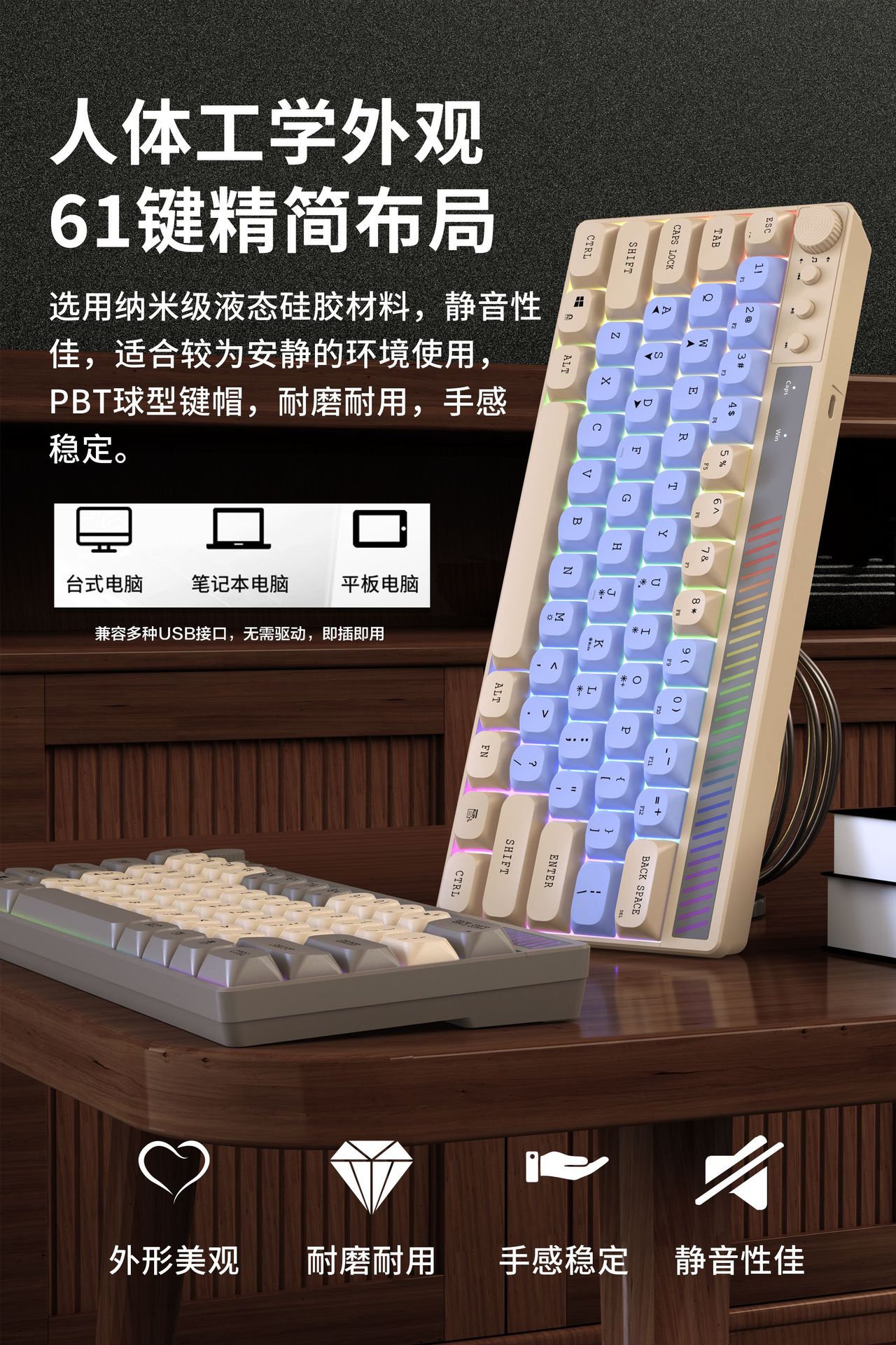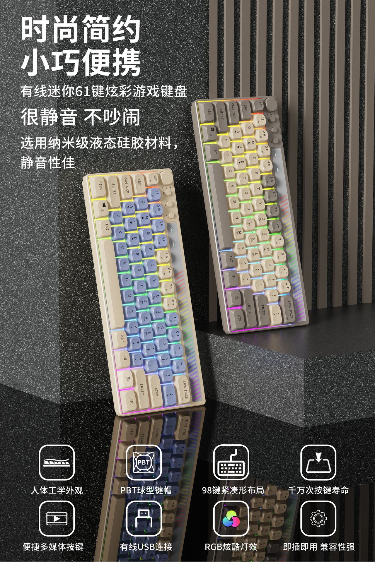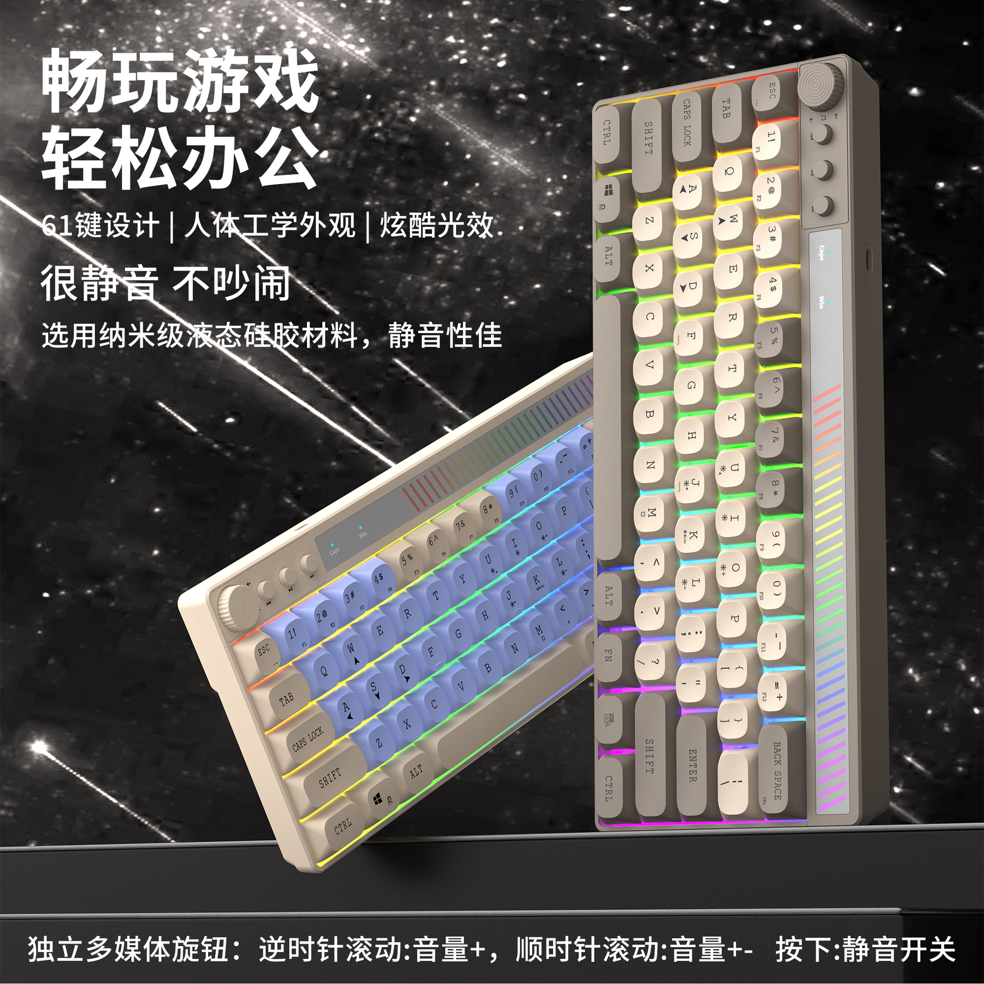 Senronni K21 유선 RGB 유선 61키 컬러 매칭 다채로운 발광 게임 키보드 라이트 사운드 멀티미디어 키보드