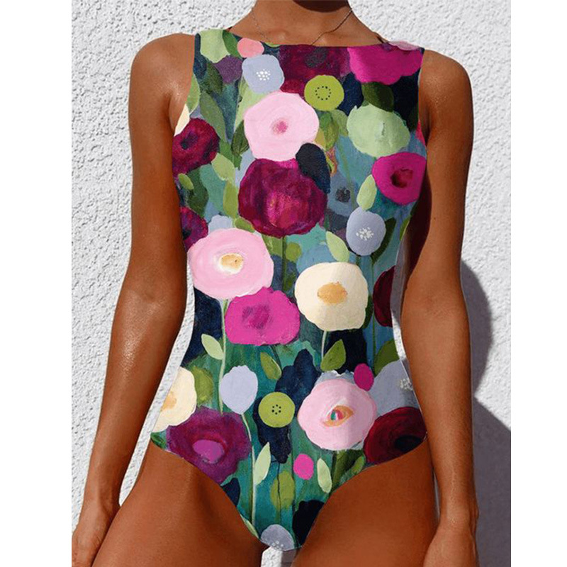 유럽과 미국의 국경 간 예술 유화 꽃 프린트 민소매 원피스 수영복 대외 무역 밝은 목가적 스타일 여성용 비치 수영복
