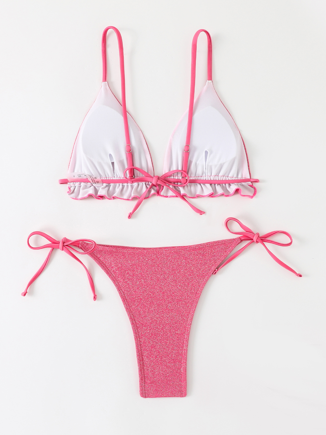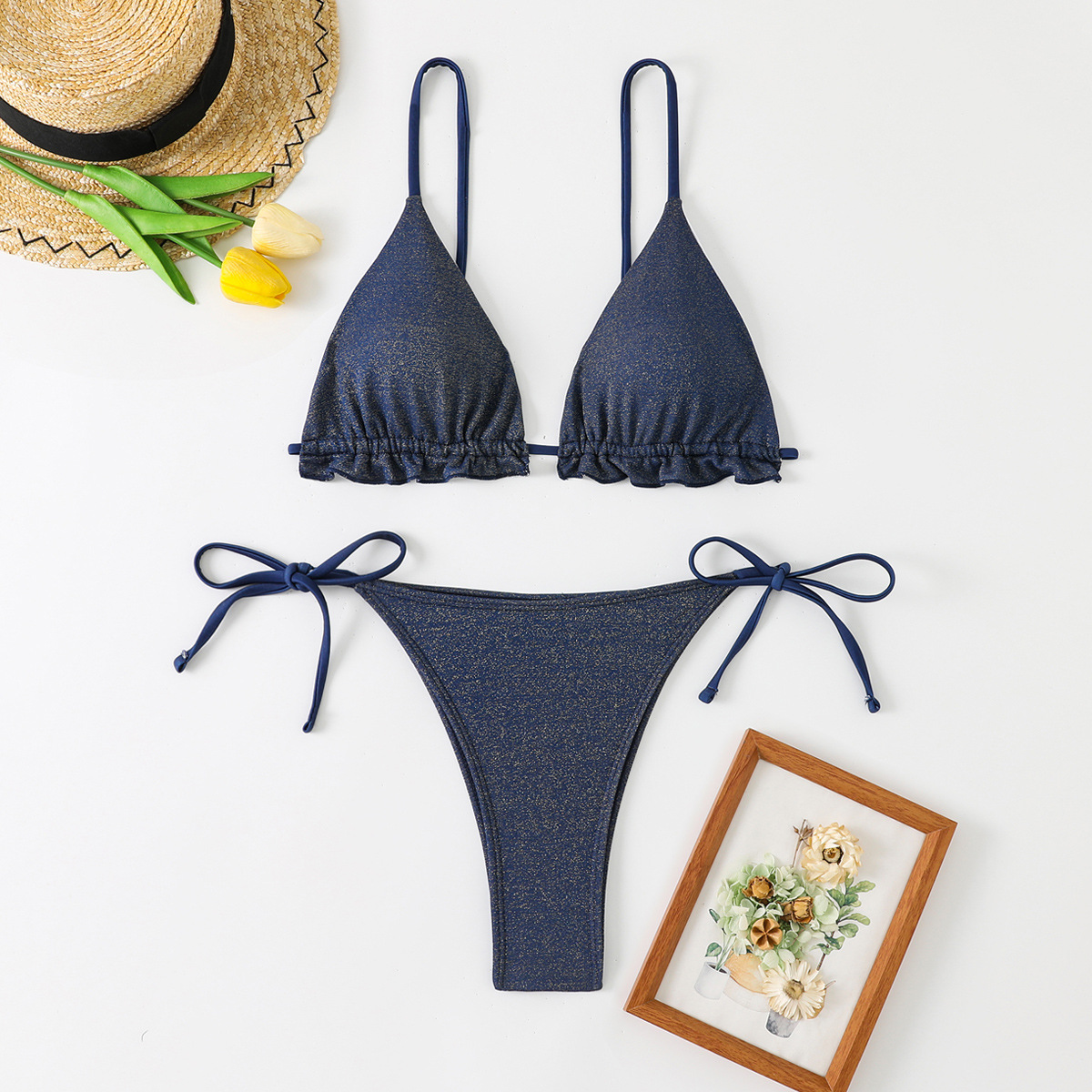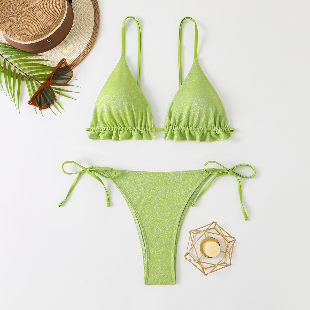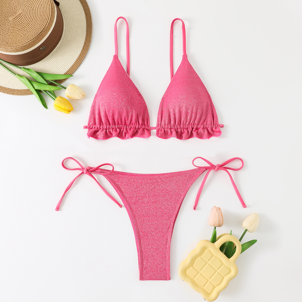 크로스보더 2025 유럽 및 미국 대외 무역 3점 수영복 솔리드 컬러 레이스업 스플릿 수영복 러플 아마존 비키니