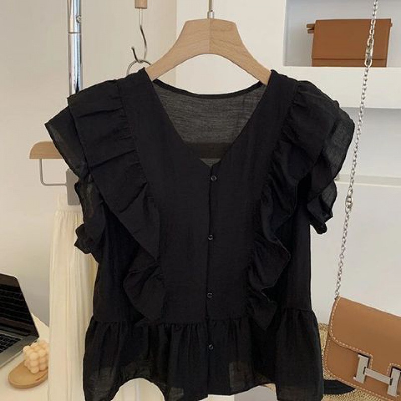 여성용 러플 브이넥 짧은 쉬폰 셔츠 2023 여름 신작 한국 스타일 다용도 연령 감소 인형 셔츠 블랙 탑