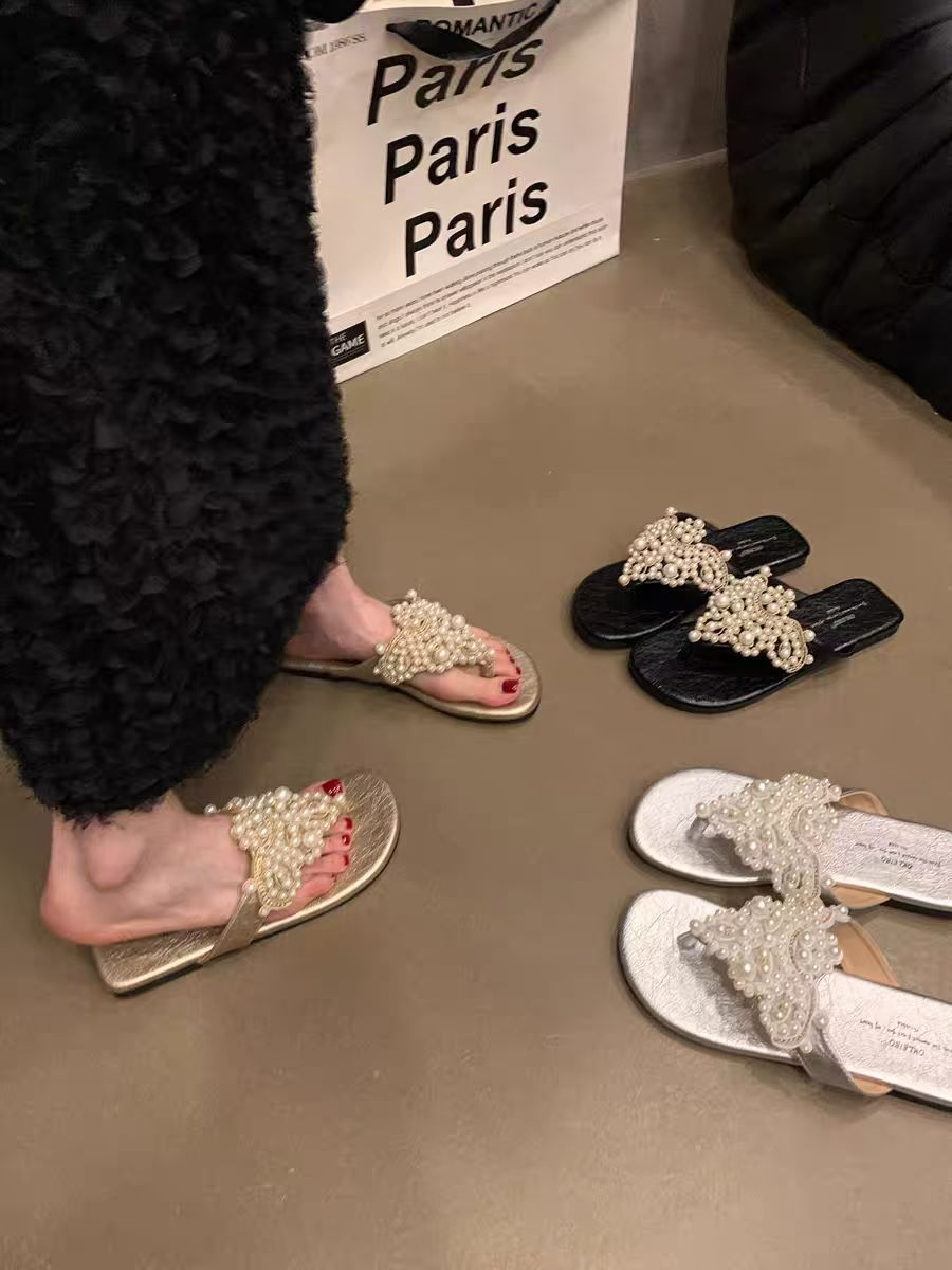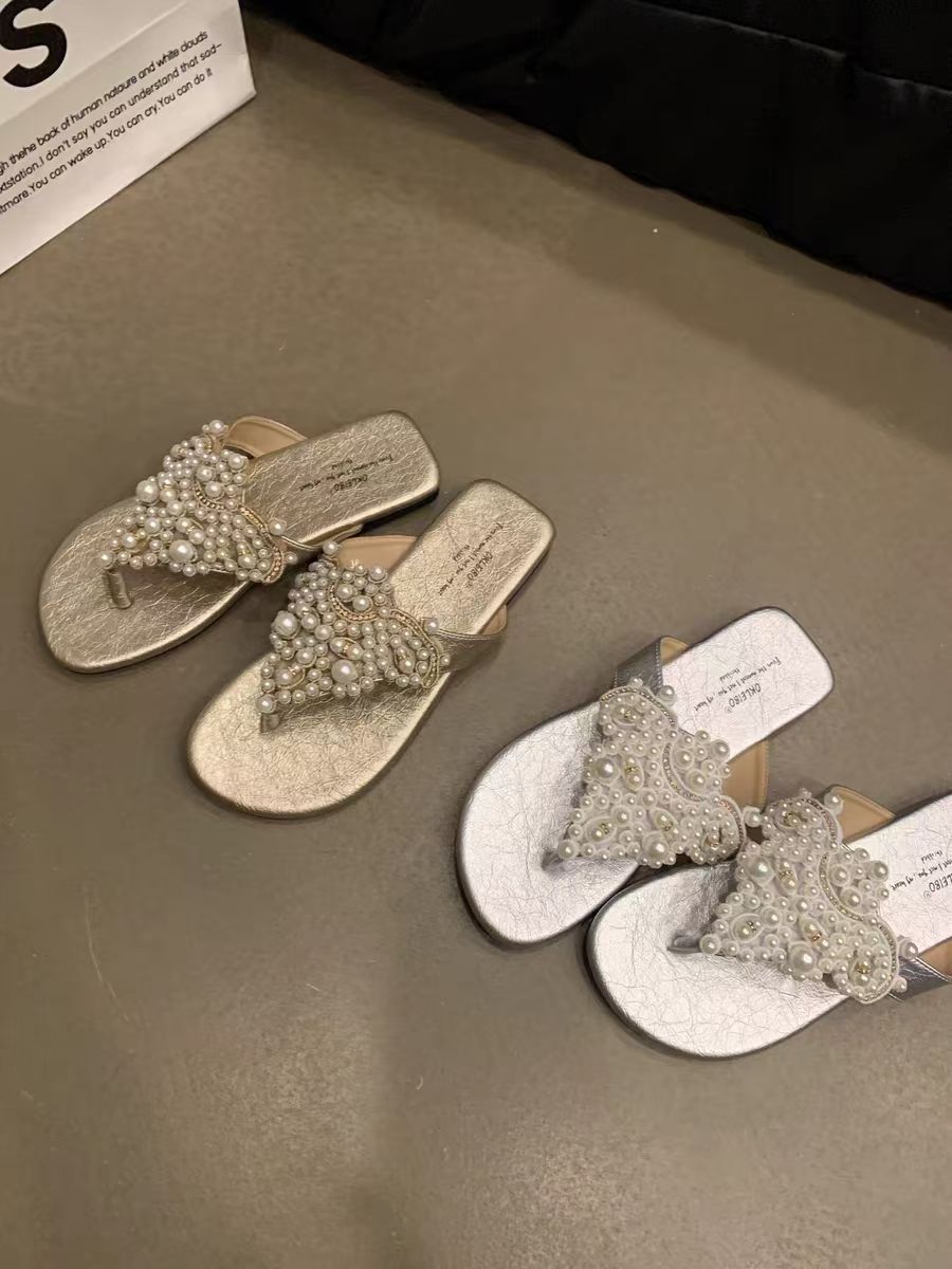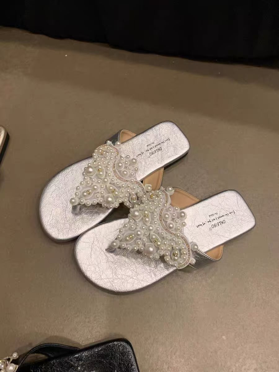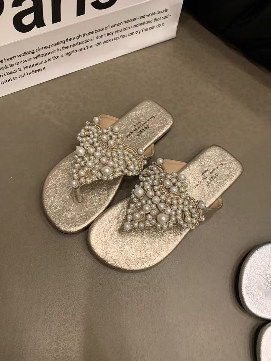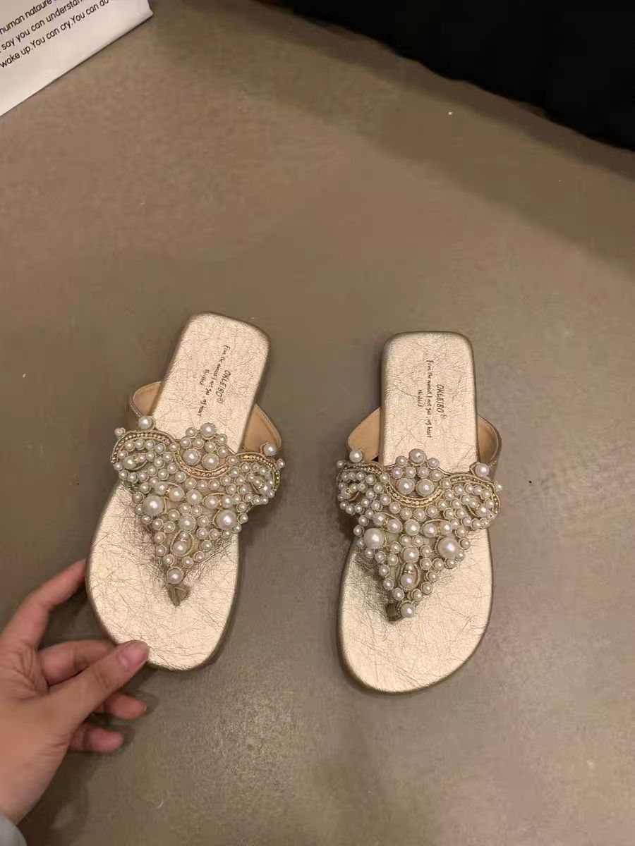 여성 여름 아우터웨어를위한 부드러운 요정 스타일 플립 플롭 새로운 진주 비치 보헤미안 샌들스토어 가기