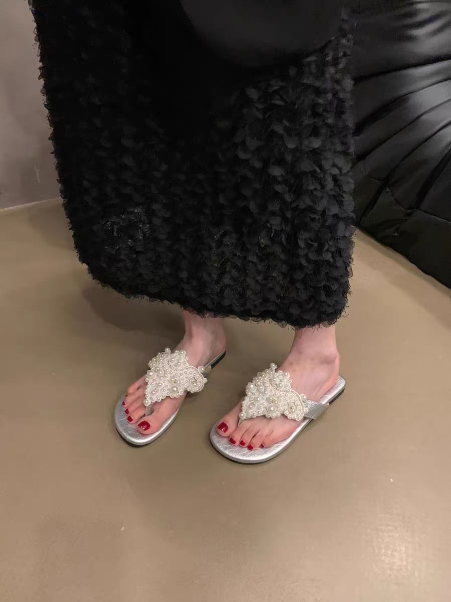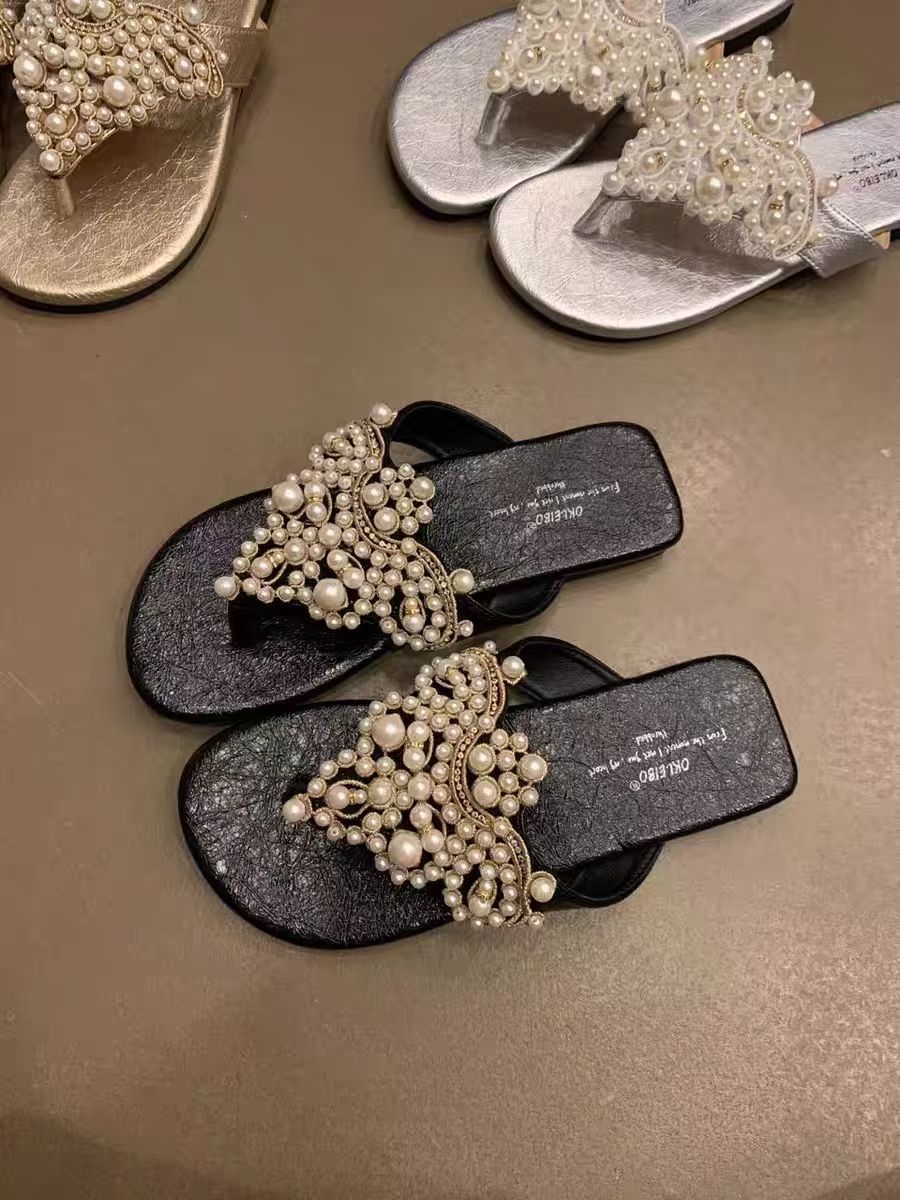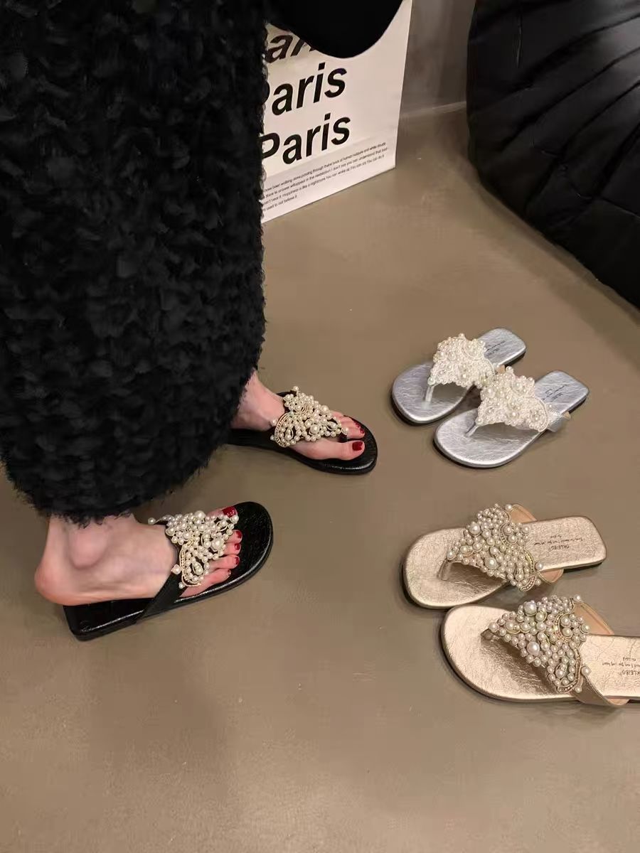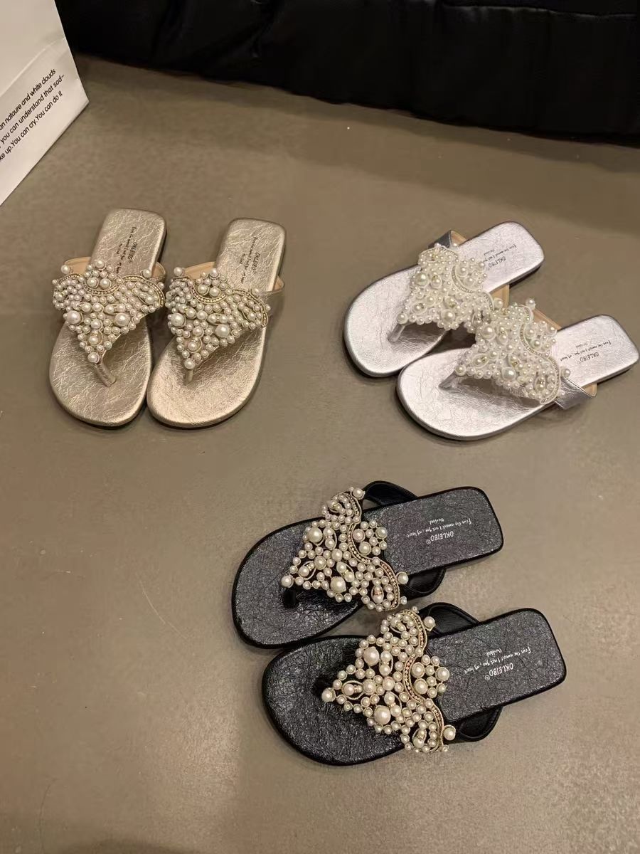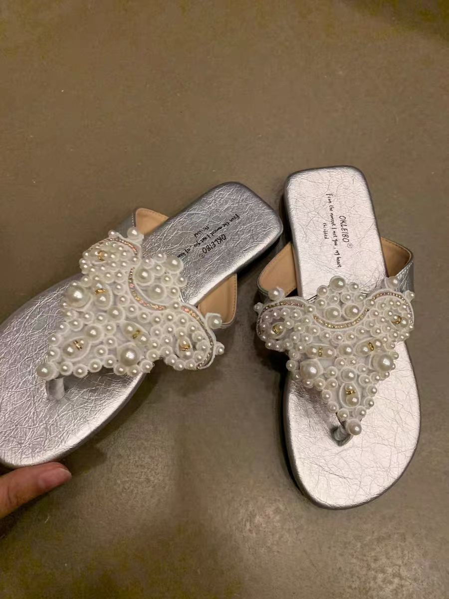 여성 여름 아우터웨어를위한 부드러운 요정 스타일 플립 플롭 새로운 진주 비치 보헤미안 샌들스토어 가기