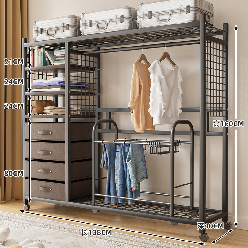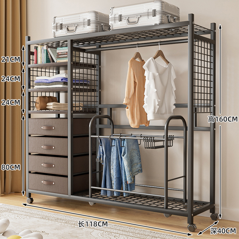 • 118cm 망사 커튼형 스틸 우드 옷장 (블랙, 서랍 + 바지 걸이 포함)