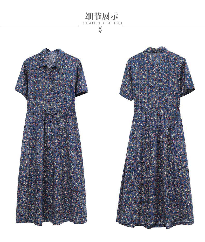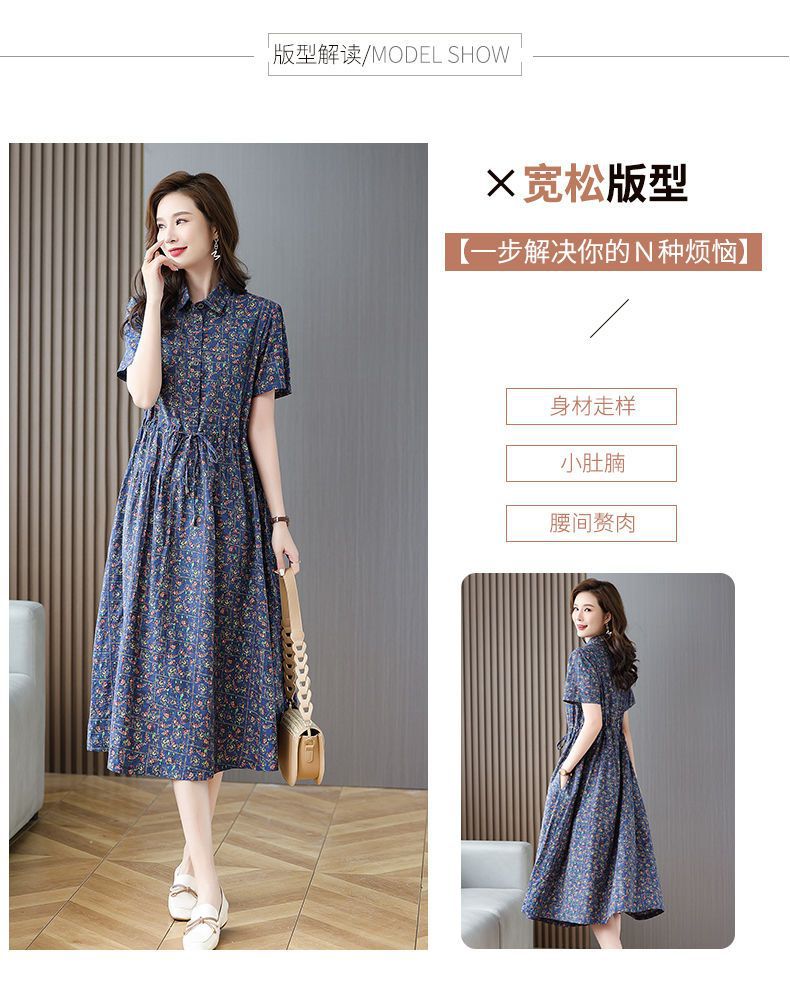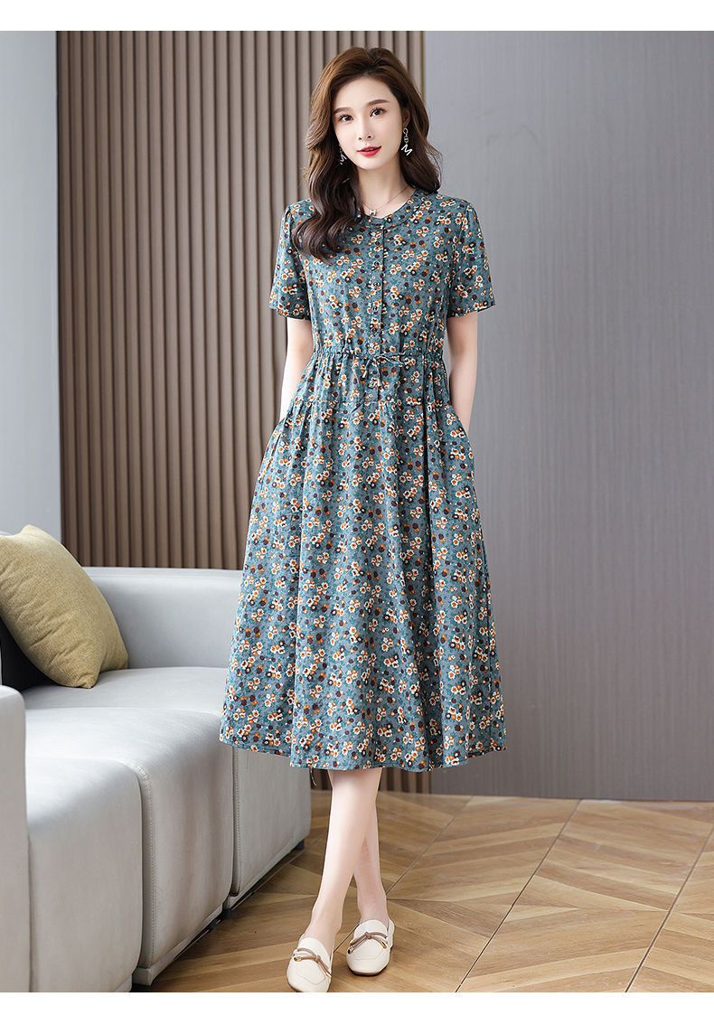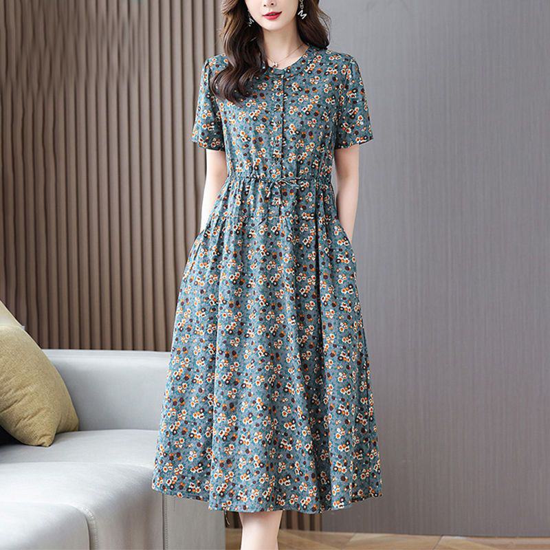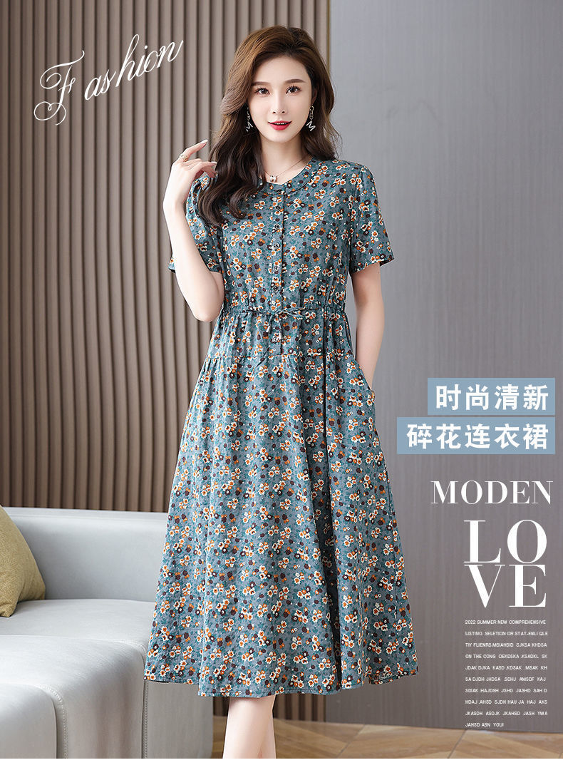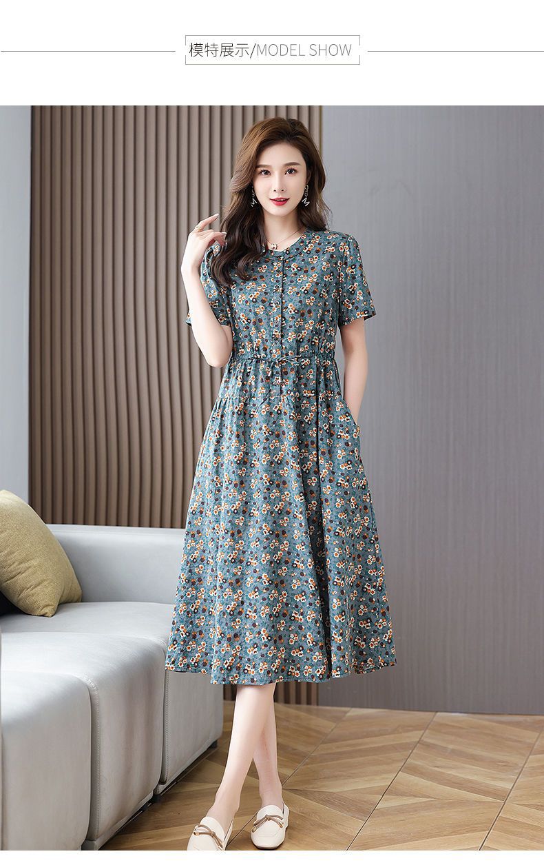 여성을위한 코튼과 린넨 꽃무늬 드레스 2025 여름 새로운 느슨한 허리 슬리밍 어머니 복장 연령 감소 반팔 스커트