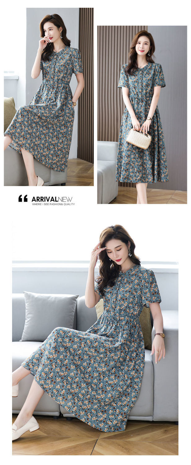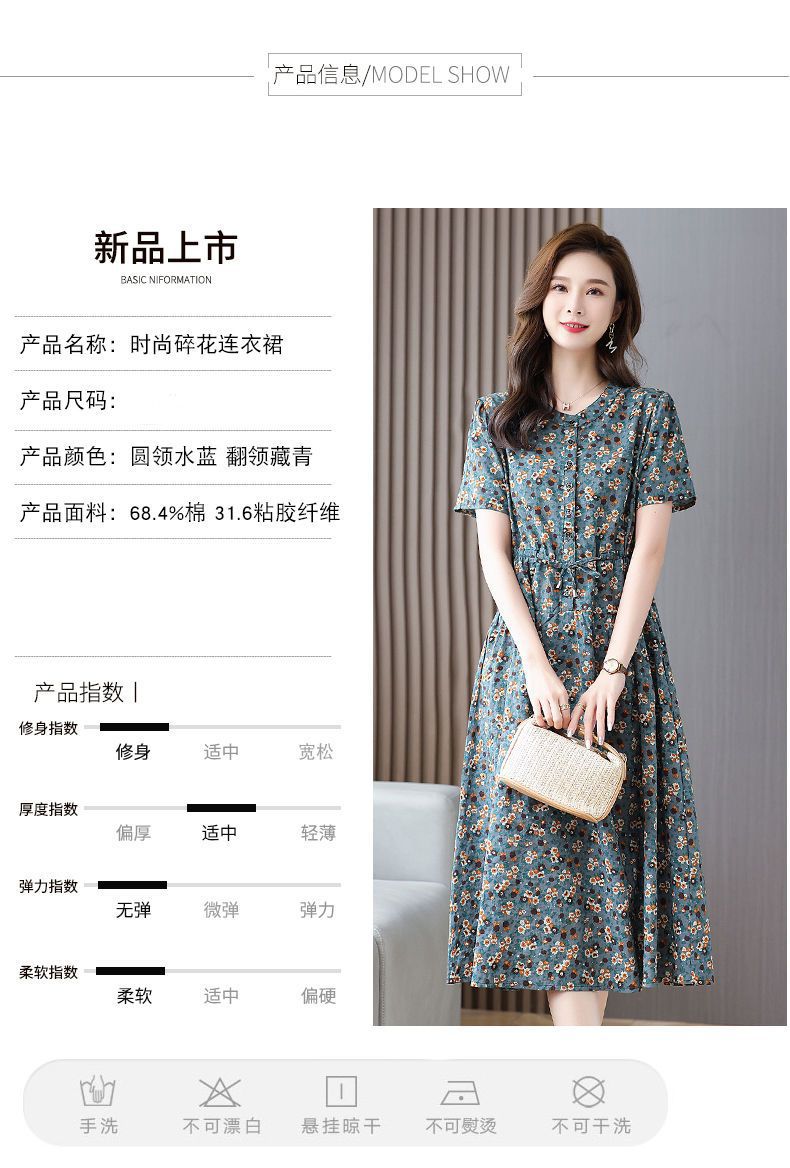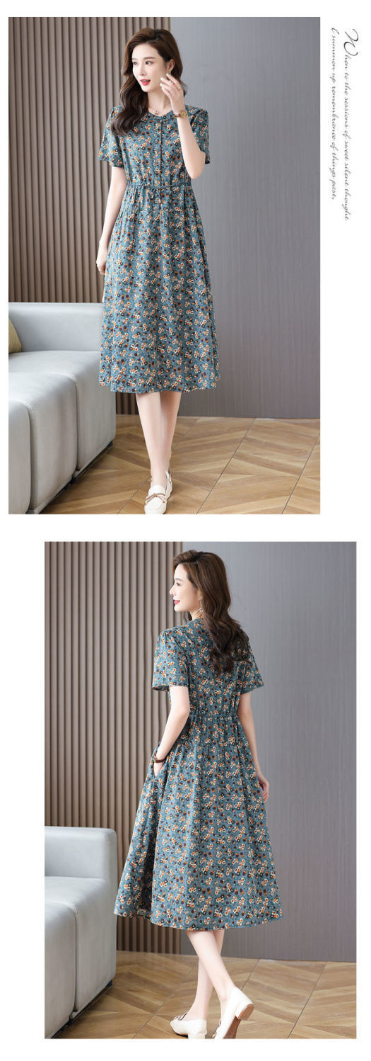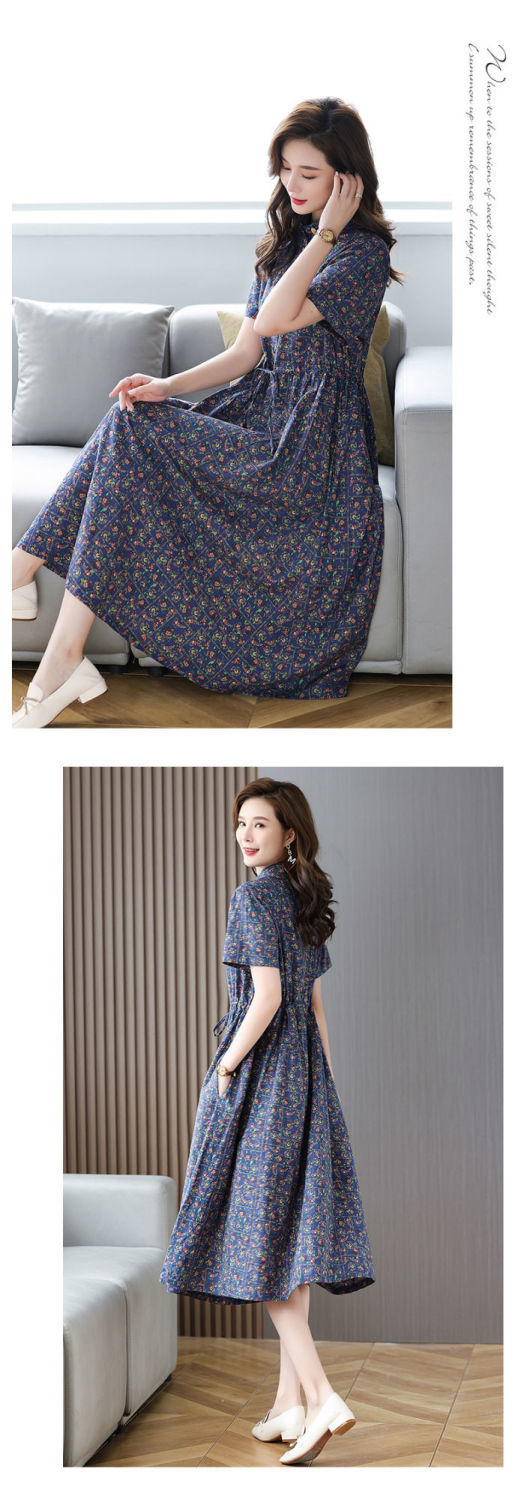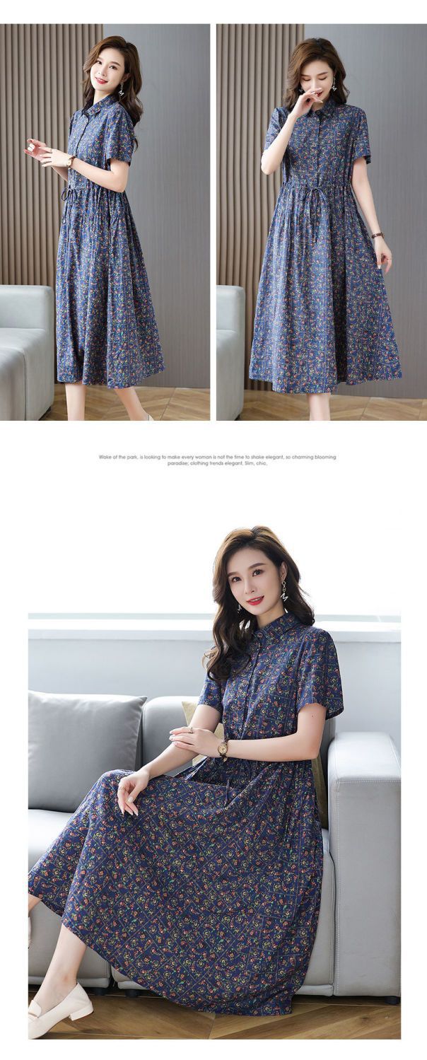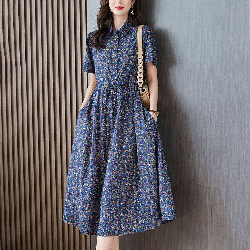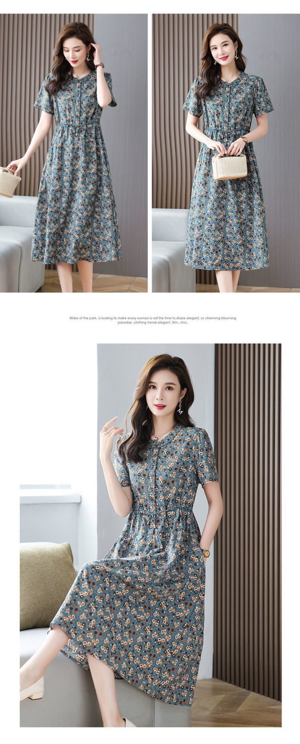 여성을위한 코튼과 린넨 꽃무늬 드레스 2025 여름 새로운 느슨한 허리 슬리밍 어머니 복장 연령 감소 반팔 스커트