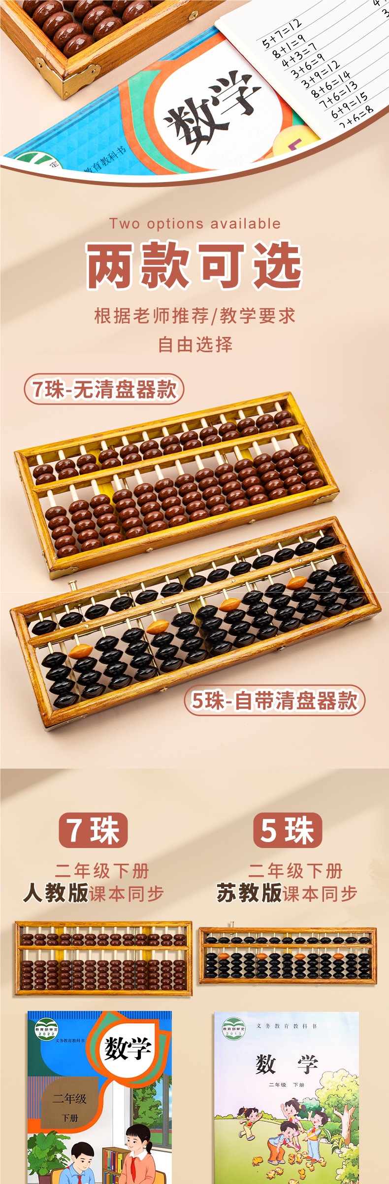 초등학생 2학년을 위한 나무 5구 7구 주판, 13단계 및 15단계 수학 교구, 어린이 학습을 위한 Jiangsu 교육판