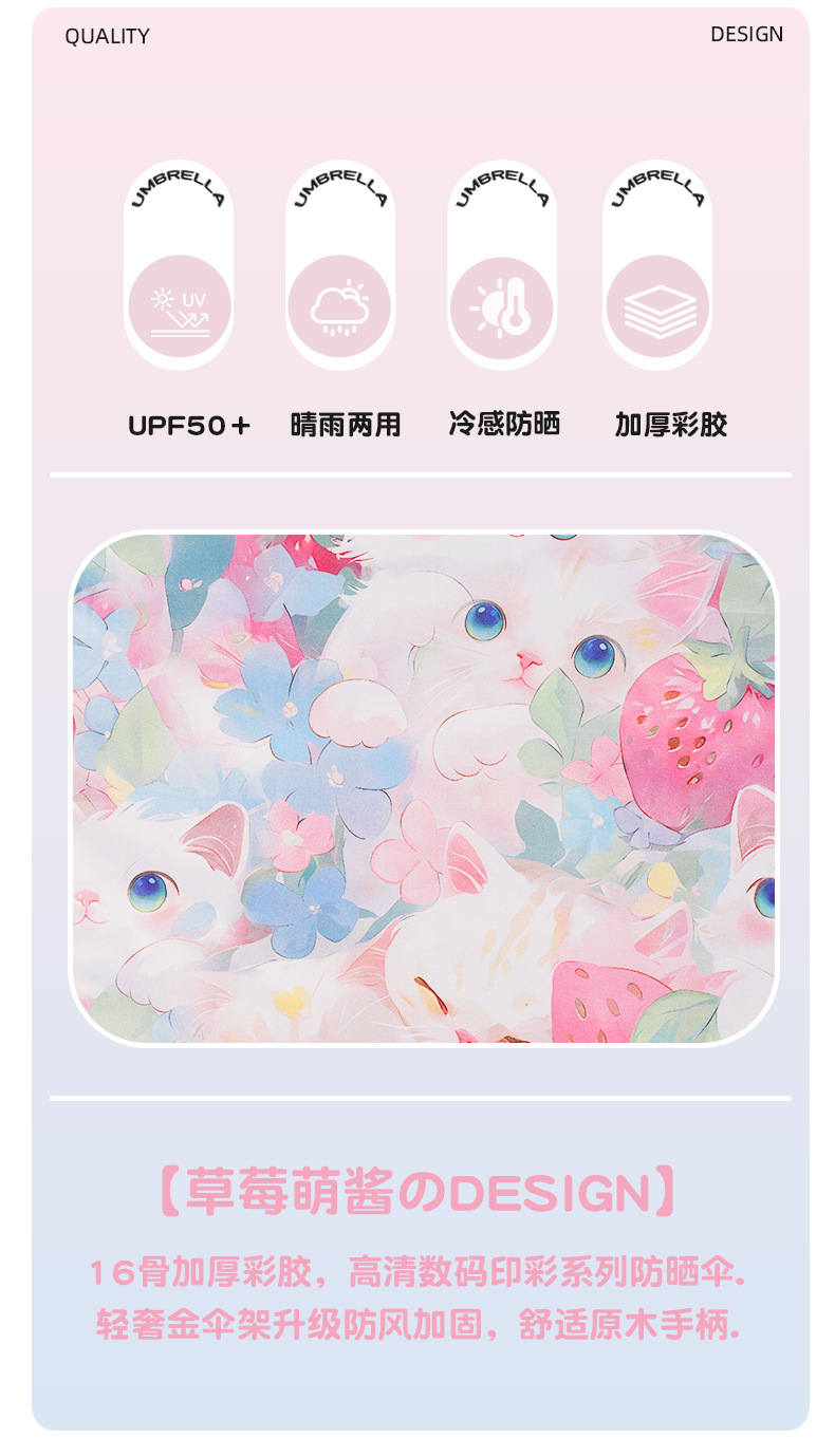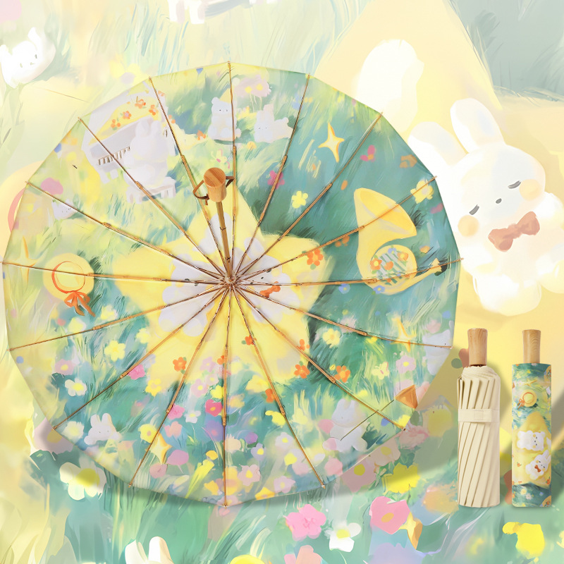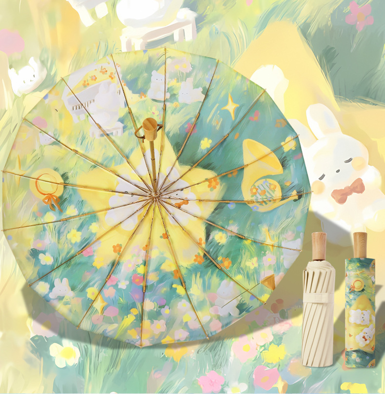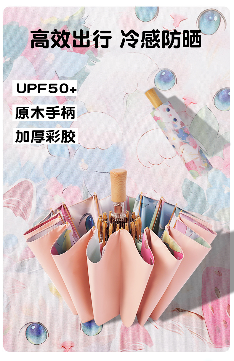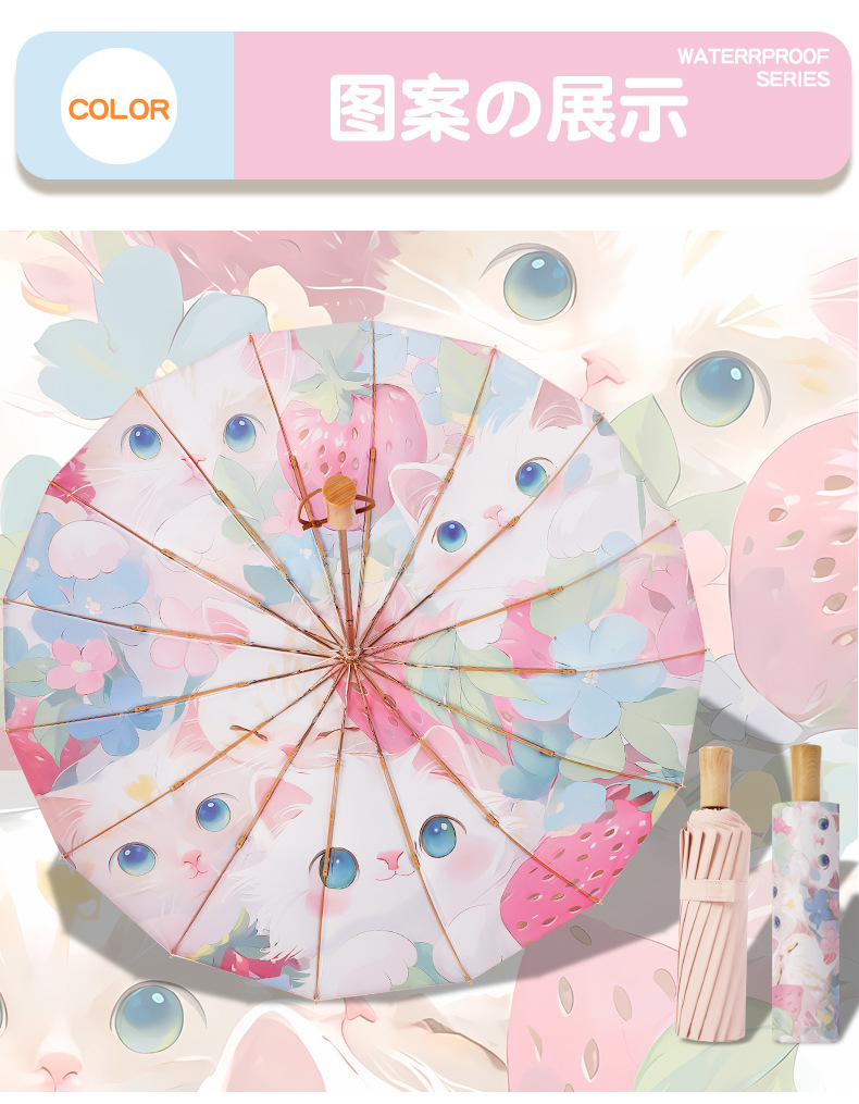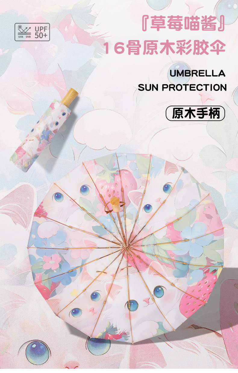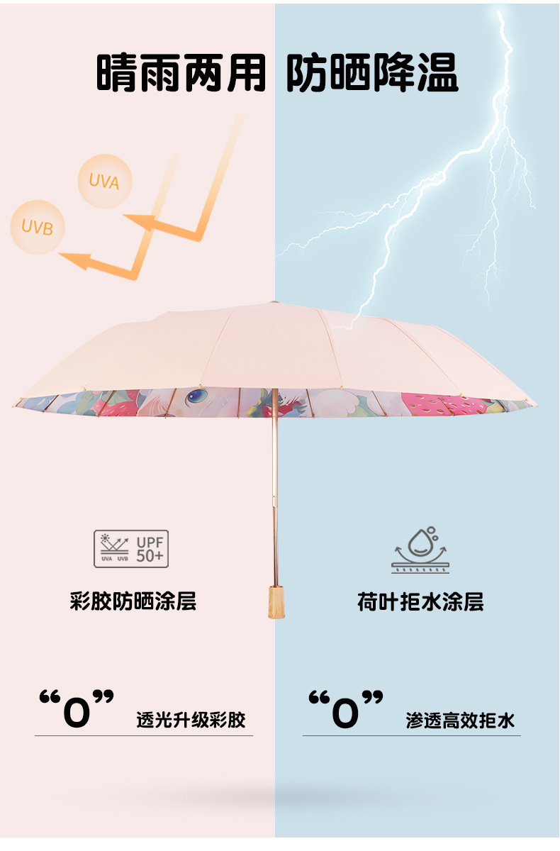 여성용 16본 우산, 자외선 차단 70% off 자외선 컬러 접착제 태양 우산, 비 또는 빛, 강화된 차양 만화 우산