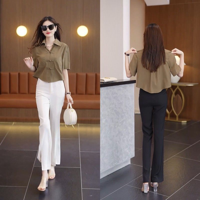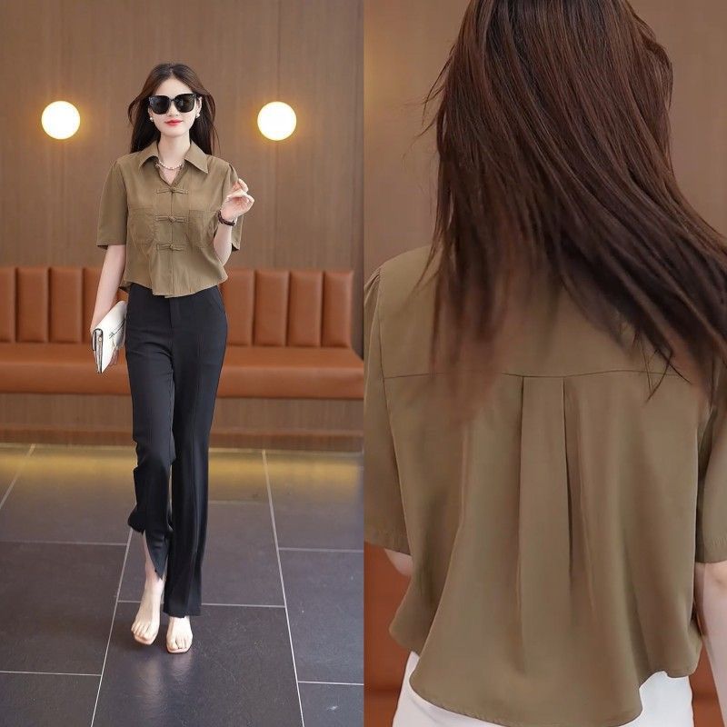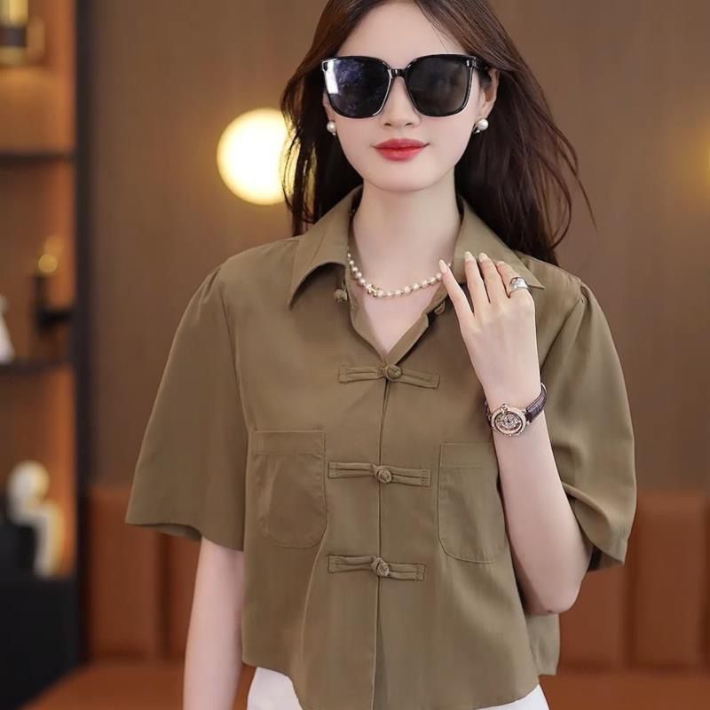여성을위한 유럽 복고풍 쉬폰 셔츠 여름 2025 새로운 스타일 중국 스타일 버튼 셔츠 퍼프 슬리브 짧은 탑 솔리드 컬러