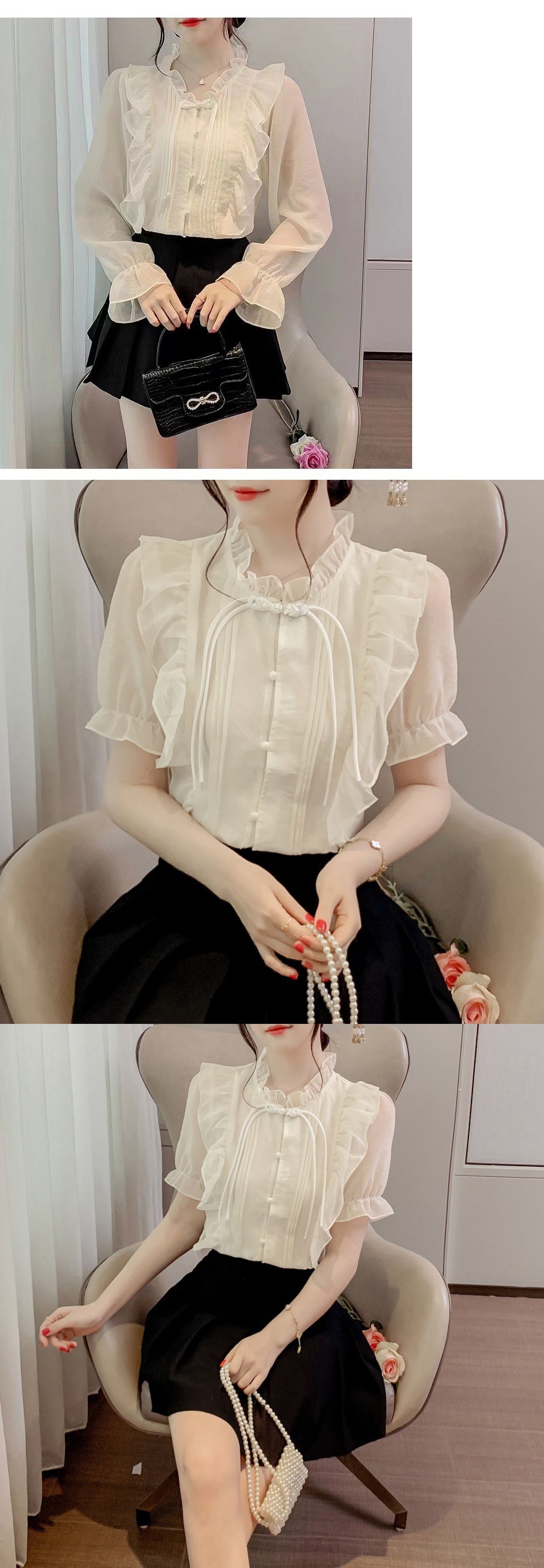 새로운 중국 스타일 버클 프렌치 러플 레이스 부드러운 쉬폰 셔츠 2024 새로운 디자인 작은 셔츠 서양식 탑스토어 가기
