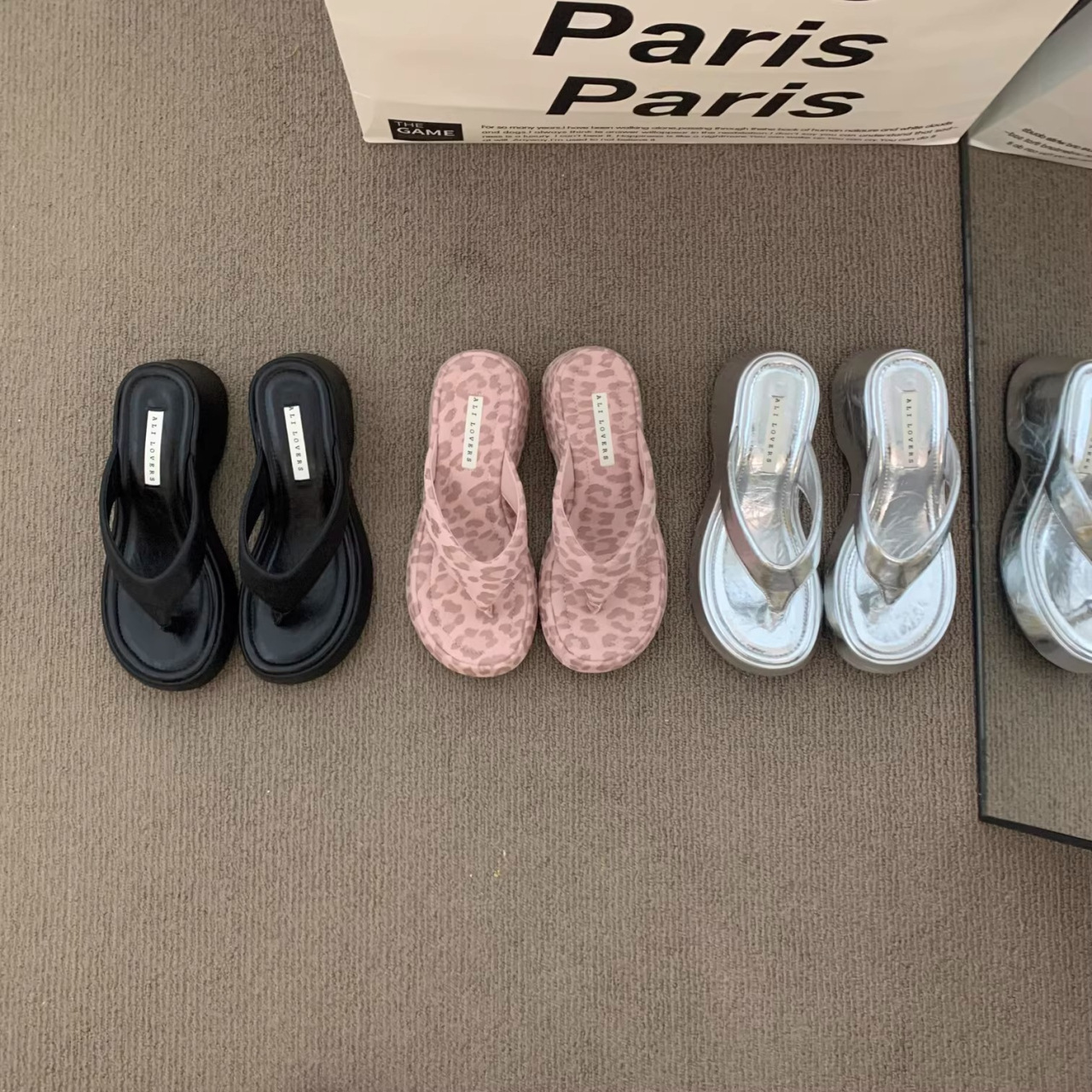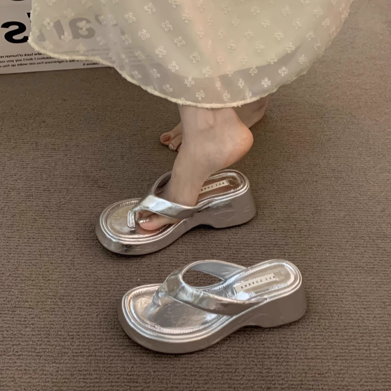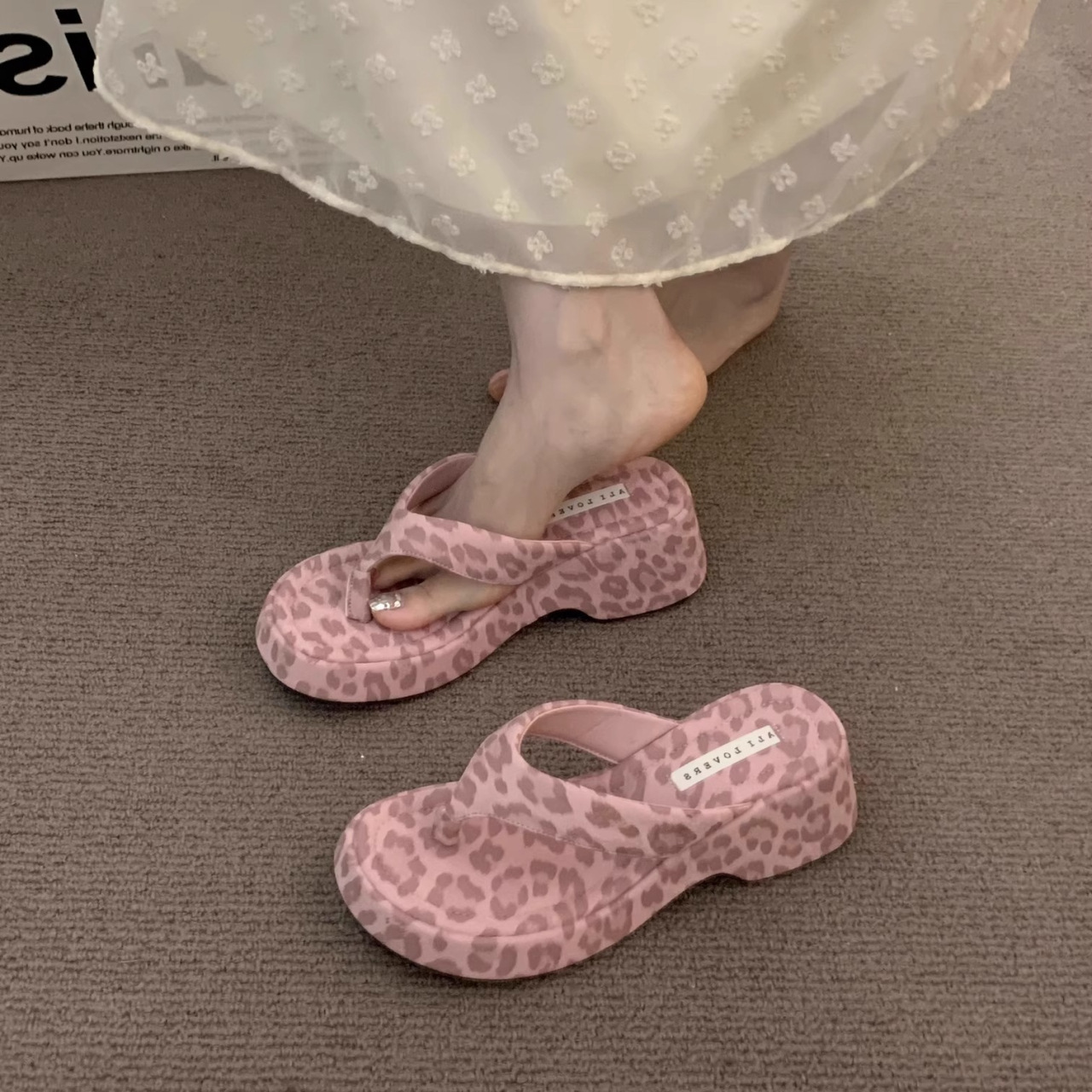 달콤한 레오파드 프린트 하이힐 플립플롭 2025 새로운 프렌치 스타일 우아한 스커트 플립플롭 웨지 샌들스토어 가기