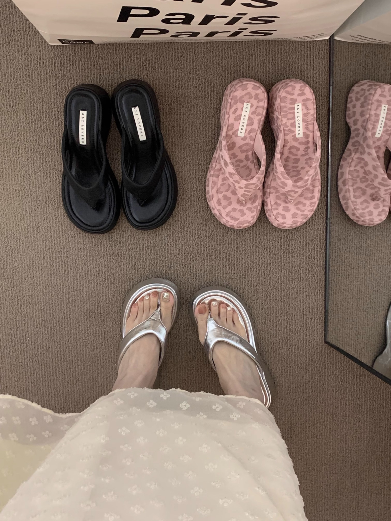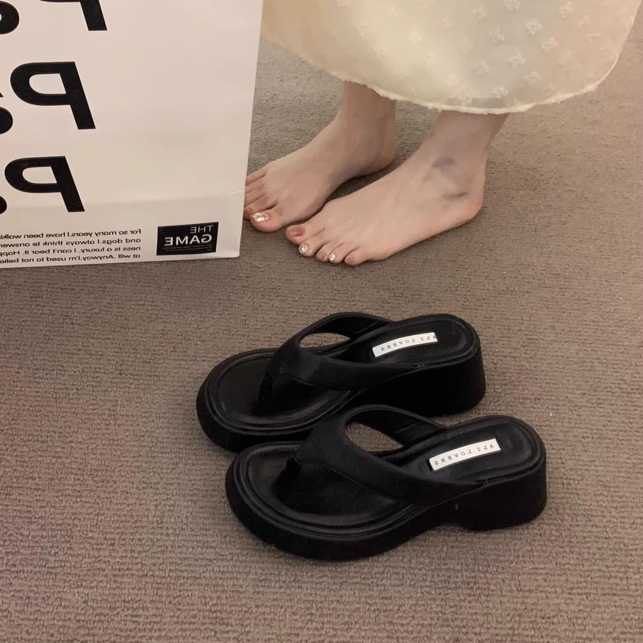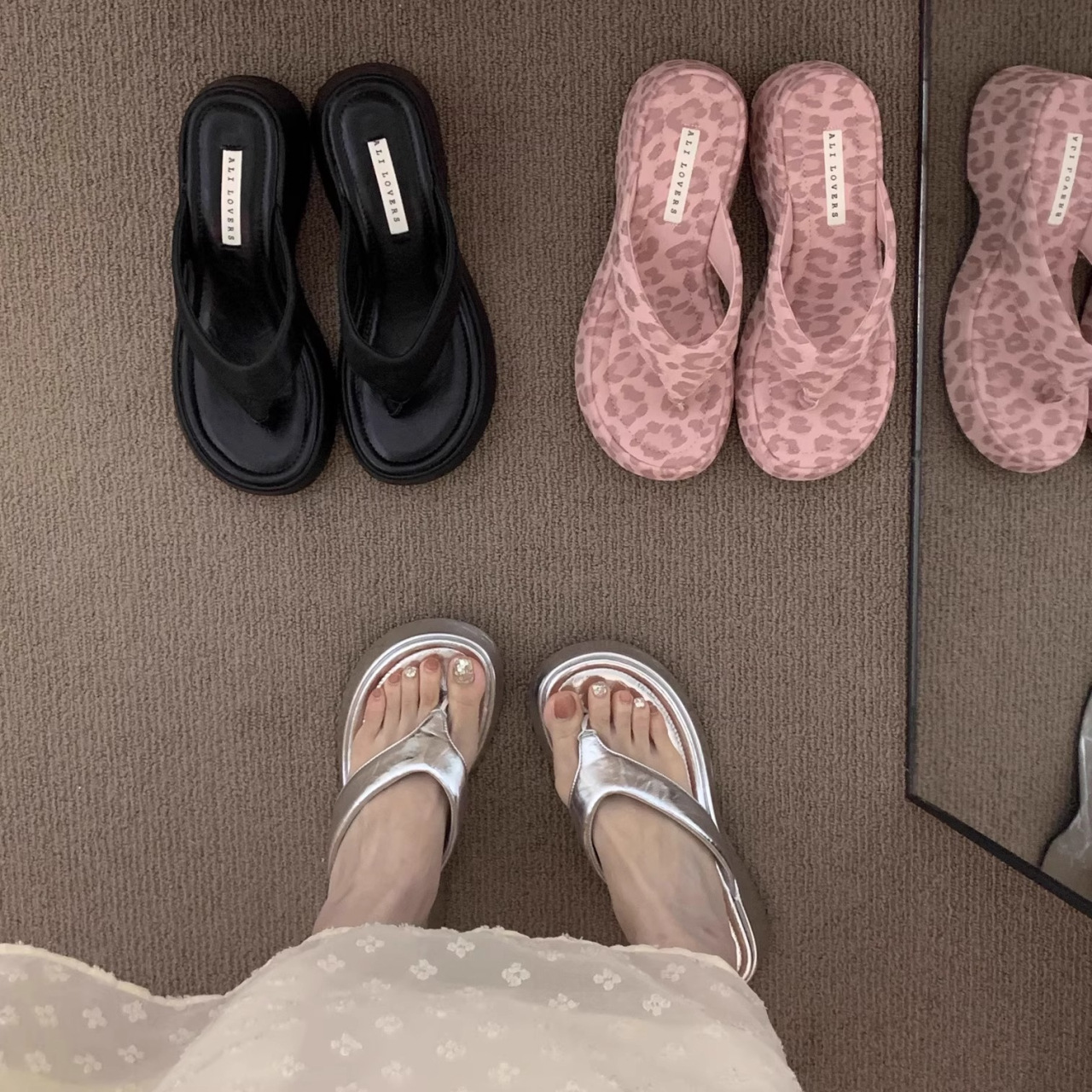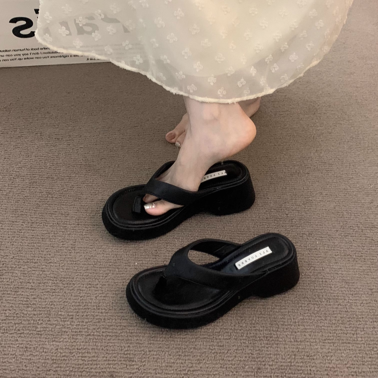 달콤한 레오파드 프린트 하이힐 플립플롭 2025 새로운 프렌치 스타일 우아한 스커트 플립플롭 웨지 샌들스토어 가기