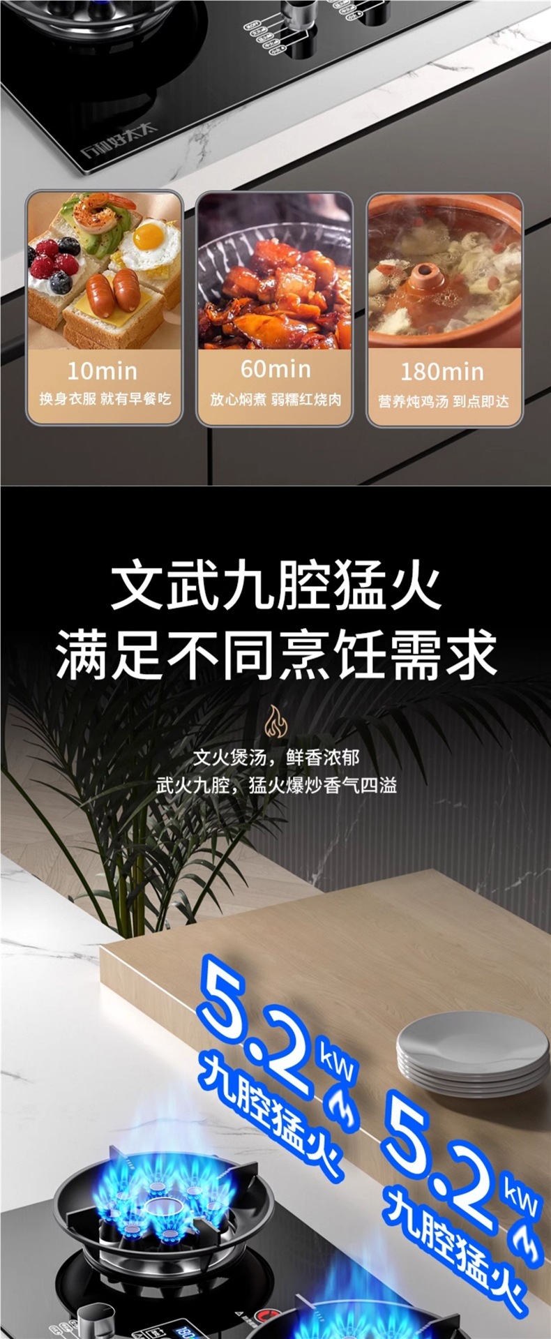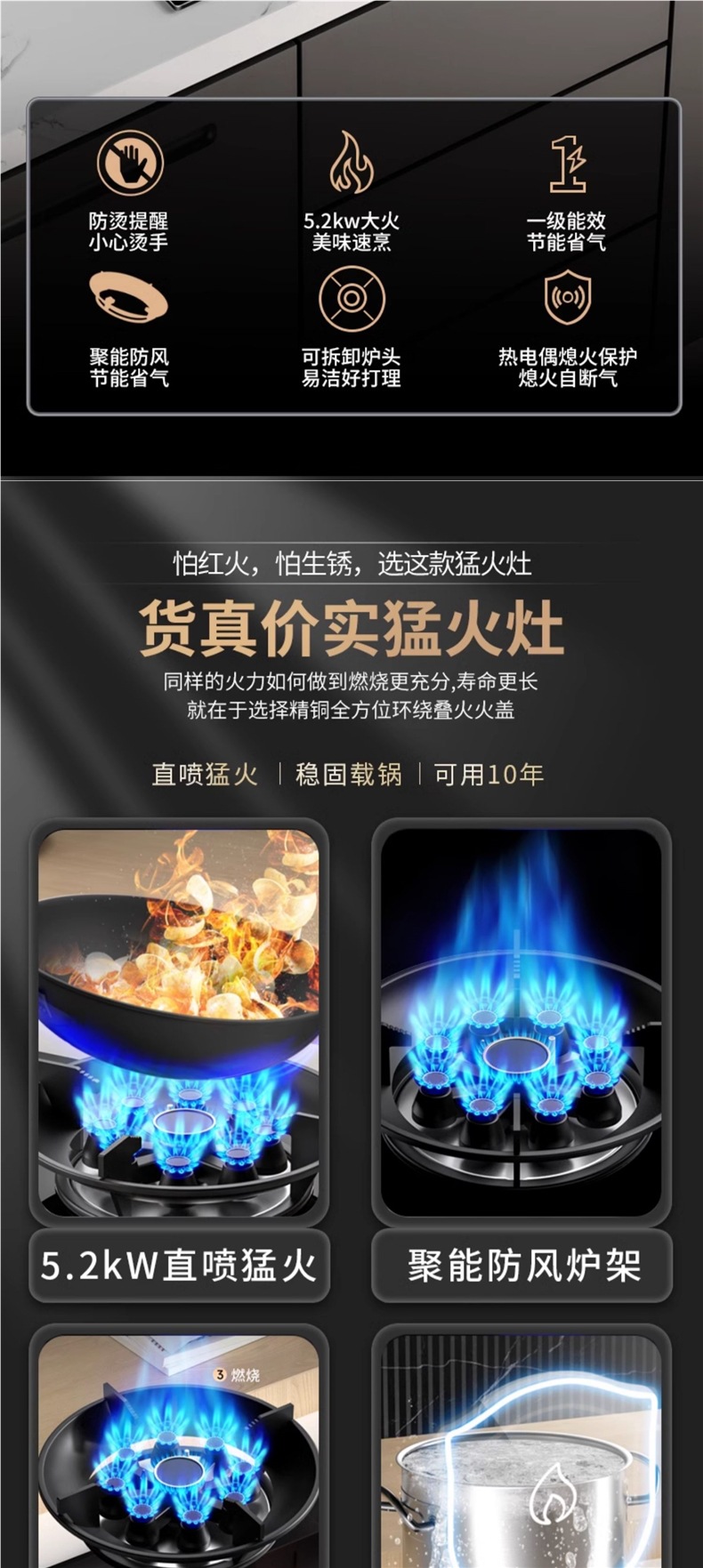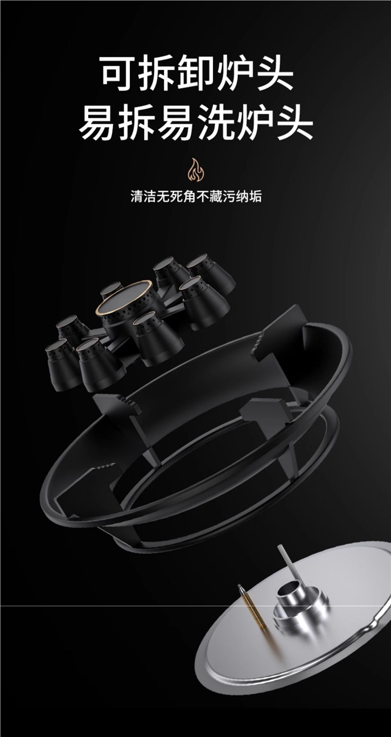 • 5.2KW 순수 구리 타이밍 이중 9 캐비티 + 에너지 수집 링 스토브 프레임 + 두꺼운 스테인레스 스틸
