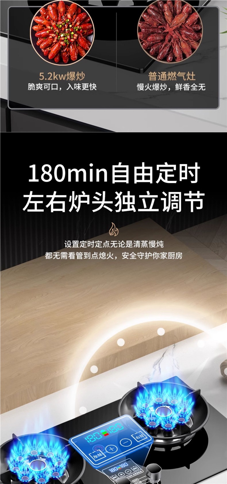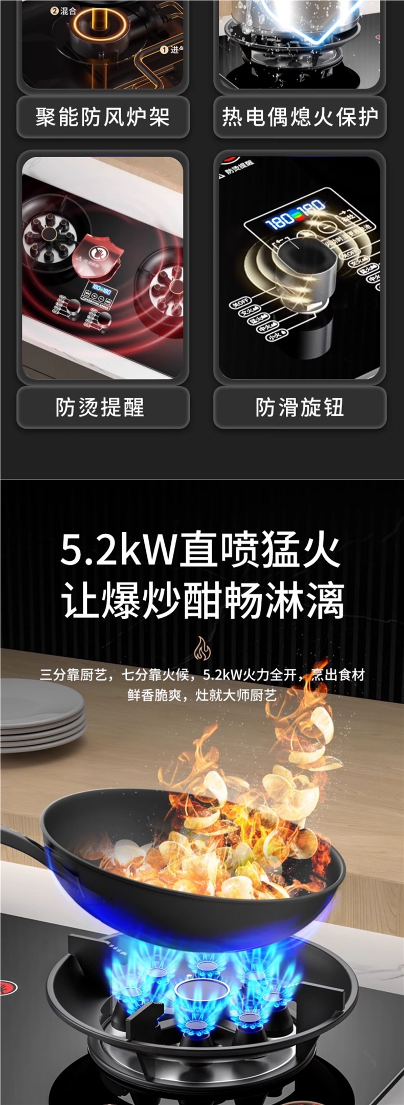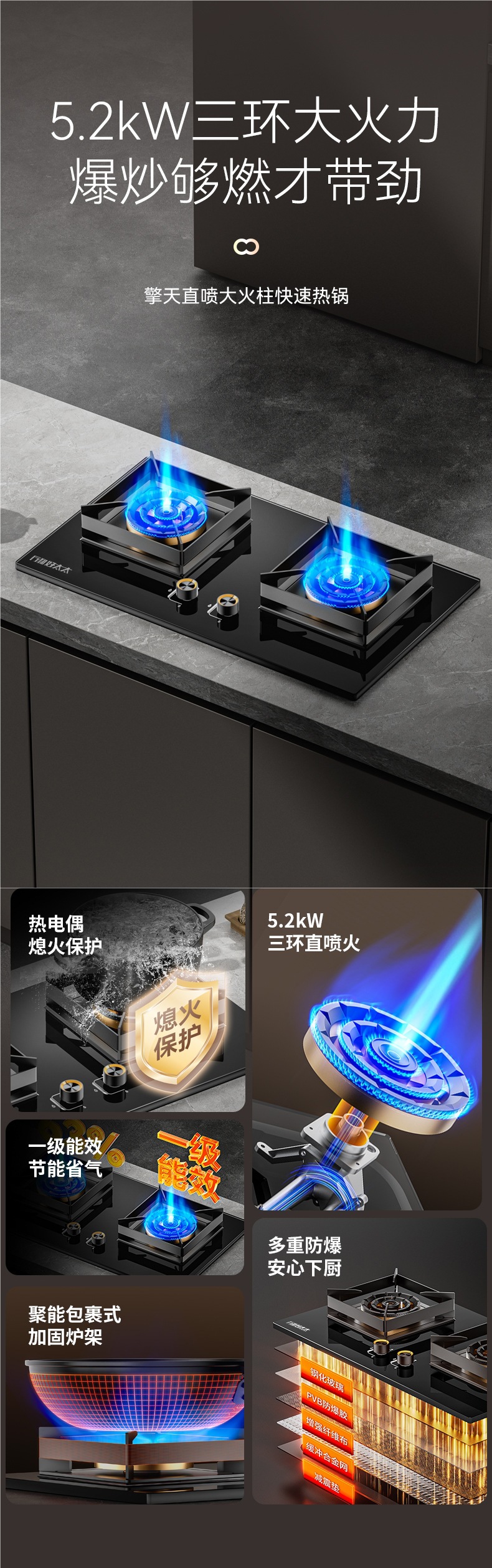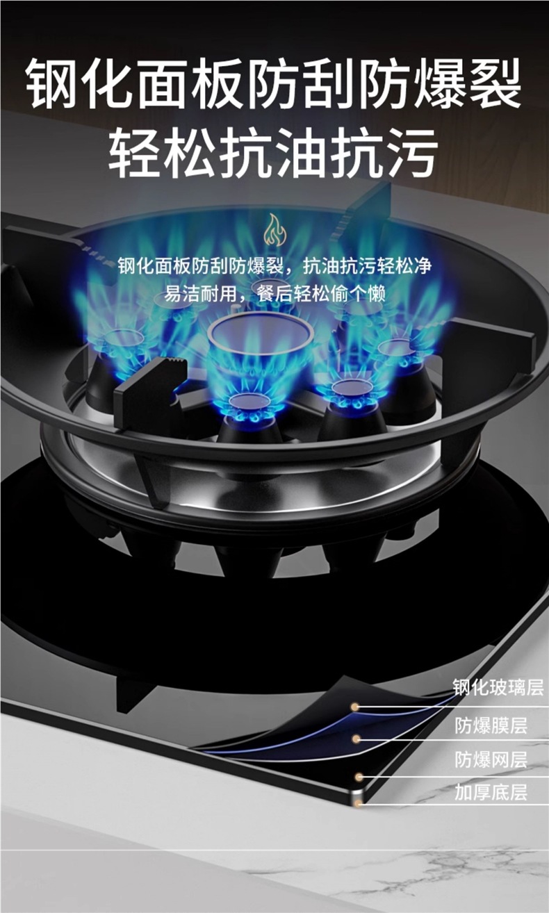 • 5.2KW 순수 구리 타이밍 이중 9 캐비티 + 에너지 수집 링 스토브 프레임 + 방폭 강화 유리