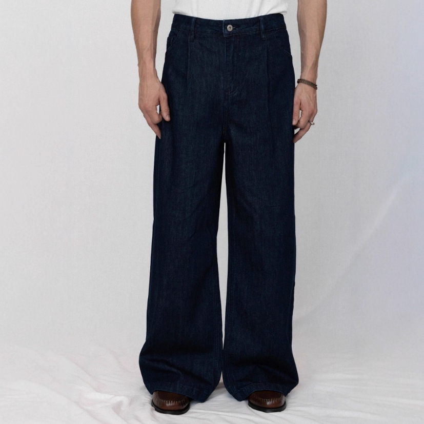 아메리칸 스타일 와이드 레그 남성 청바지 패션 루즈한 바닥 길이 청바지 진한 파란색 트렌디 바지 스트레이트 레그