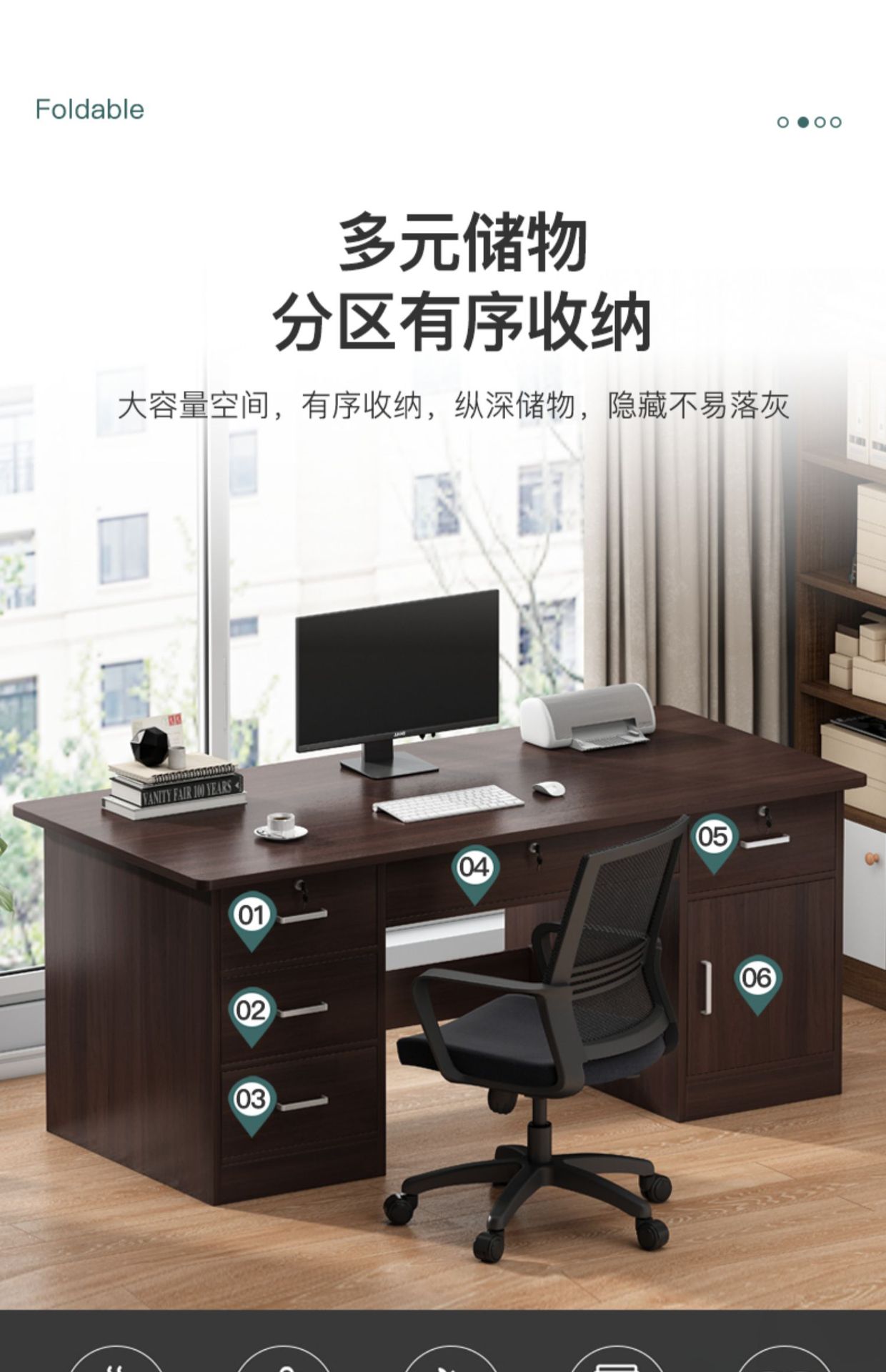 • 140cm 서랍 5개, 문 1개, 다크월넛 + 회전의자 사진을 찍어 상품 수령 후 20위안 할인을 받으세요!