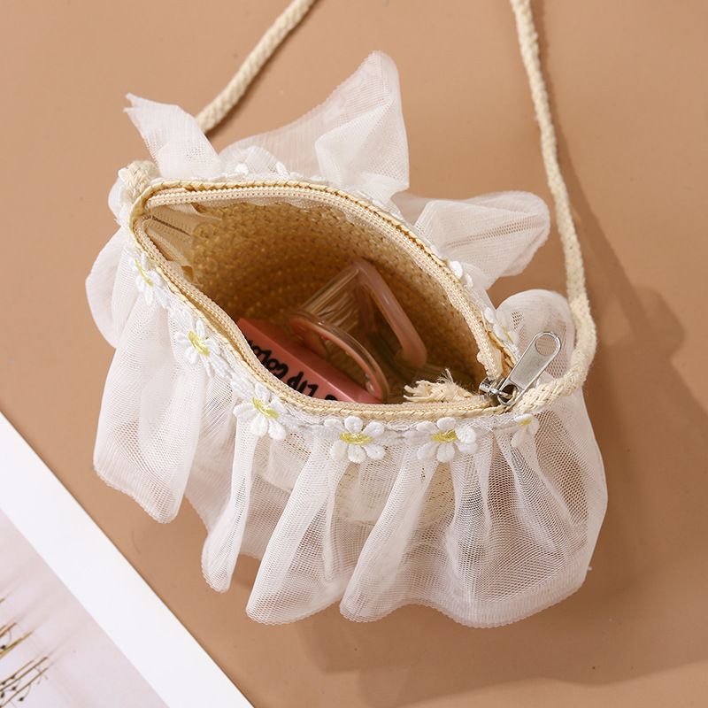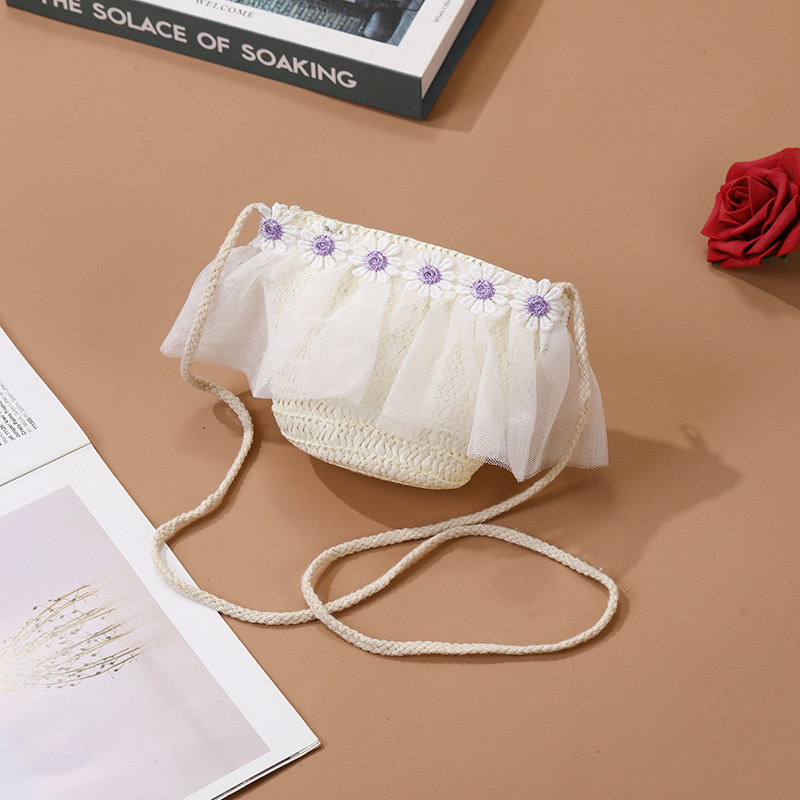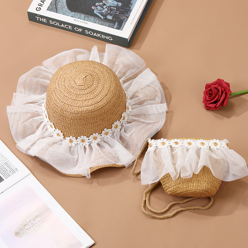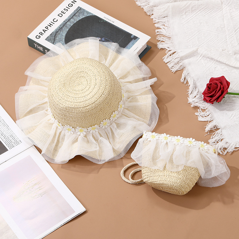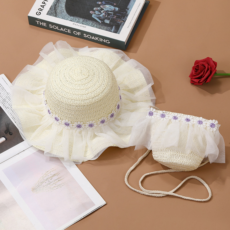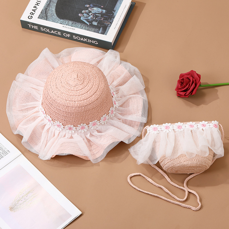 어린이 레이스 꽃 태양 보호 태양 모자 아기 여름 태양 모자 소녀 큰 챙 밀짚 모자 어린이 가방 모자