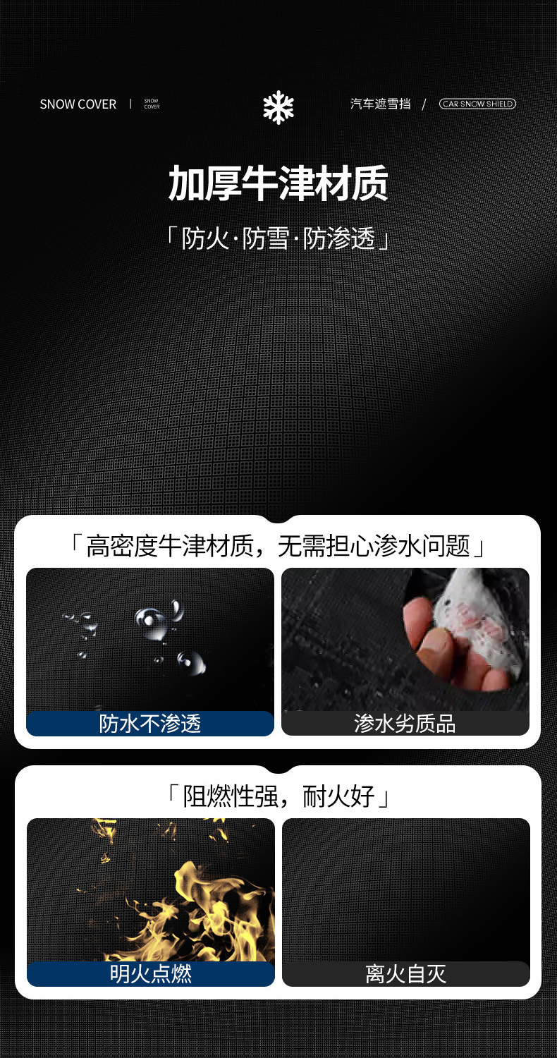 1、牛津布材质,不伤车漆,防晒、隔热、防雨雪、防风尘、防划痕、抗拉力强。