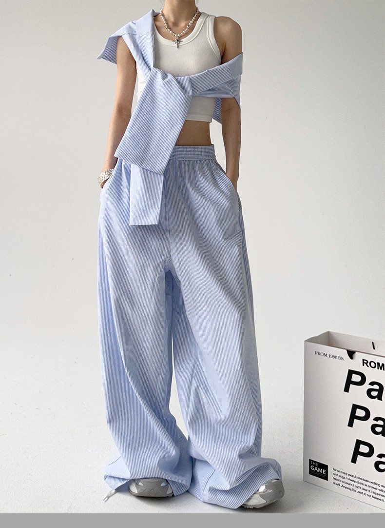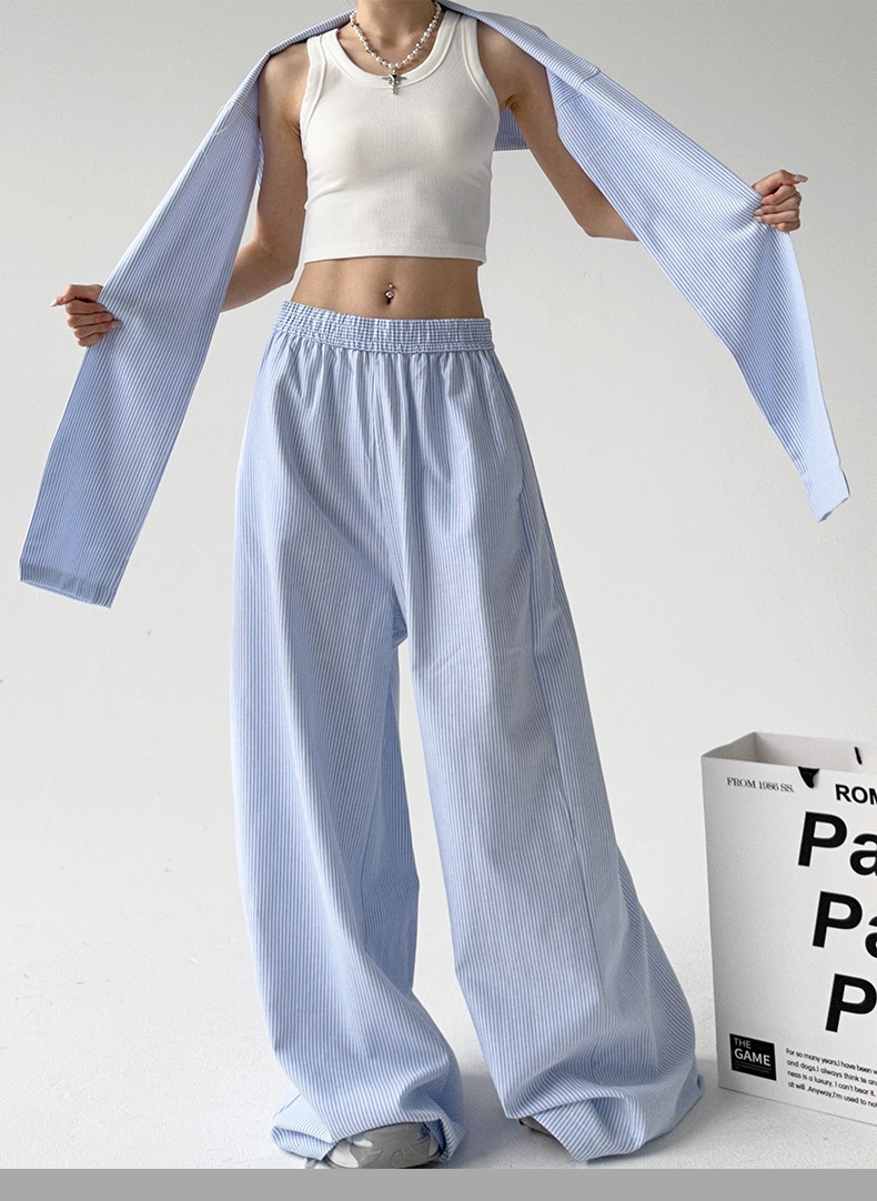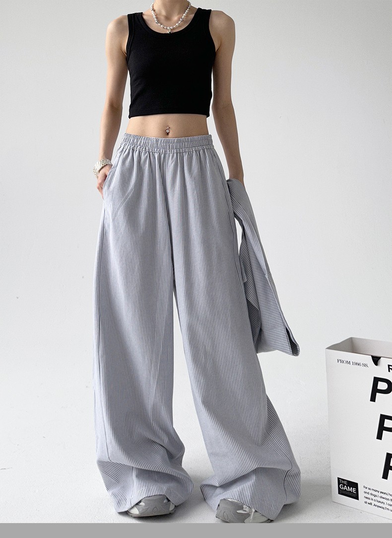 여성용 스트라이프 캐주얼 팬츠 2025 봄 가을 신상 스트랩 허리밴드 루즈 스트레이트 와이드 팬츠 디자인 바닥 길이 팬츠스토어 가기