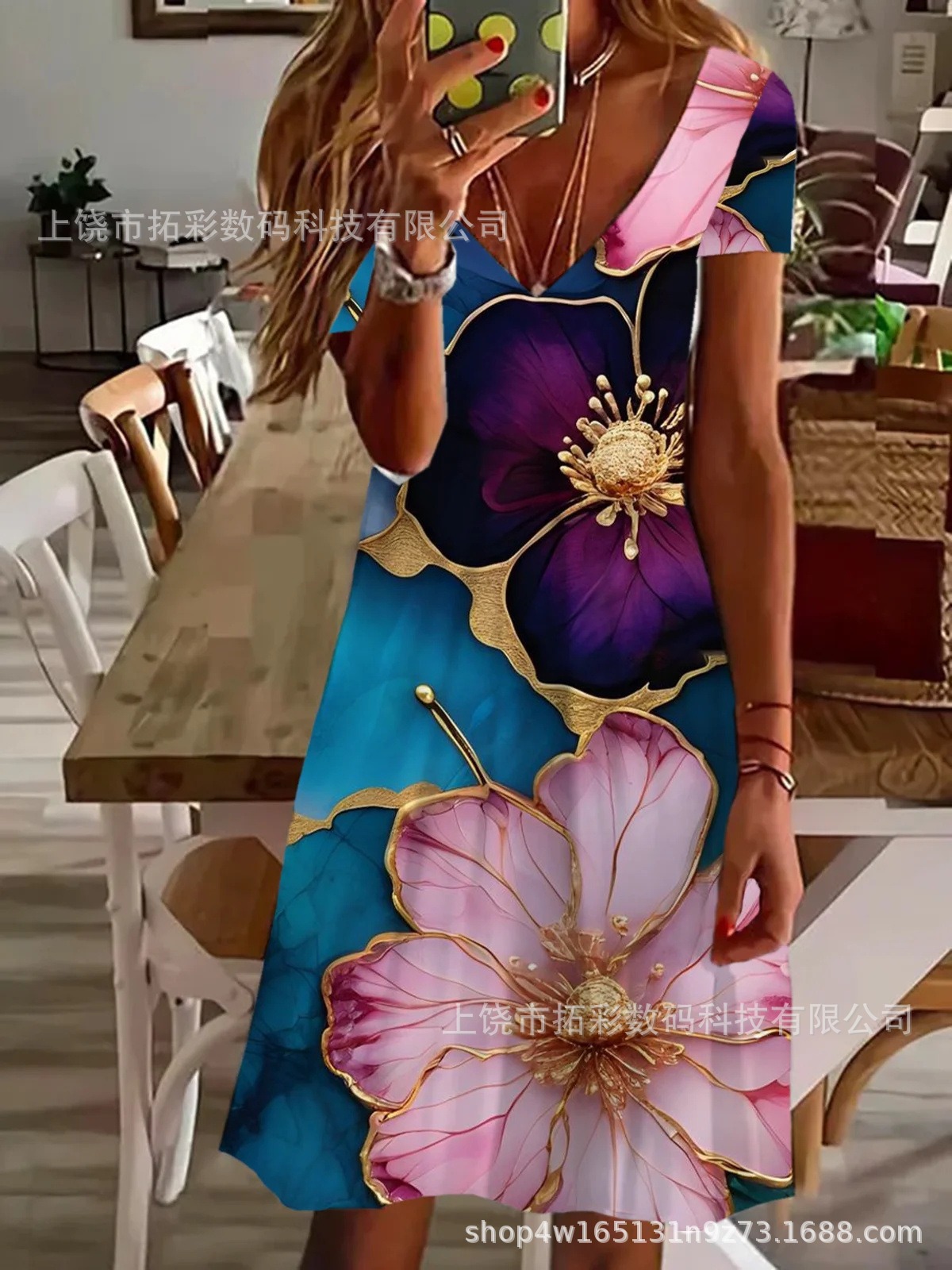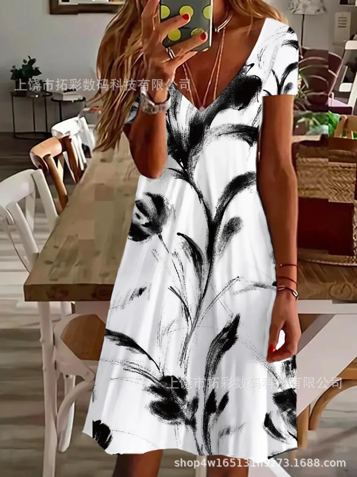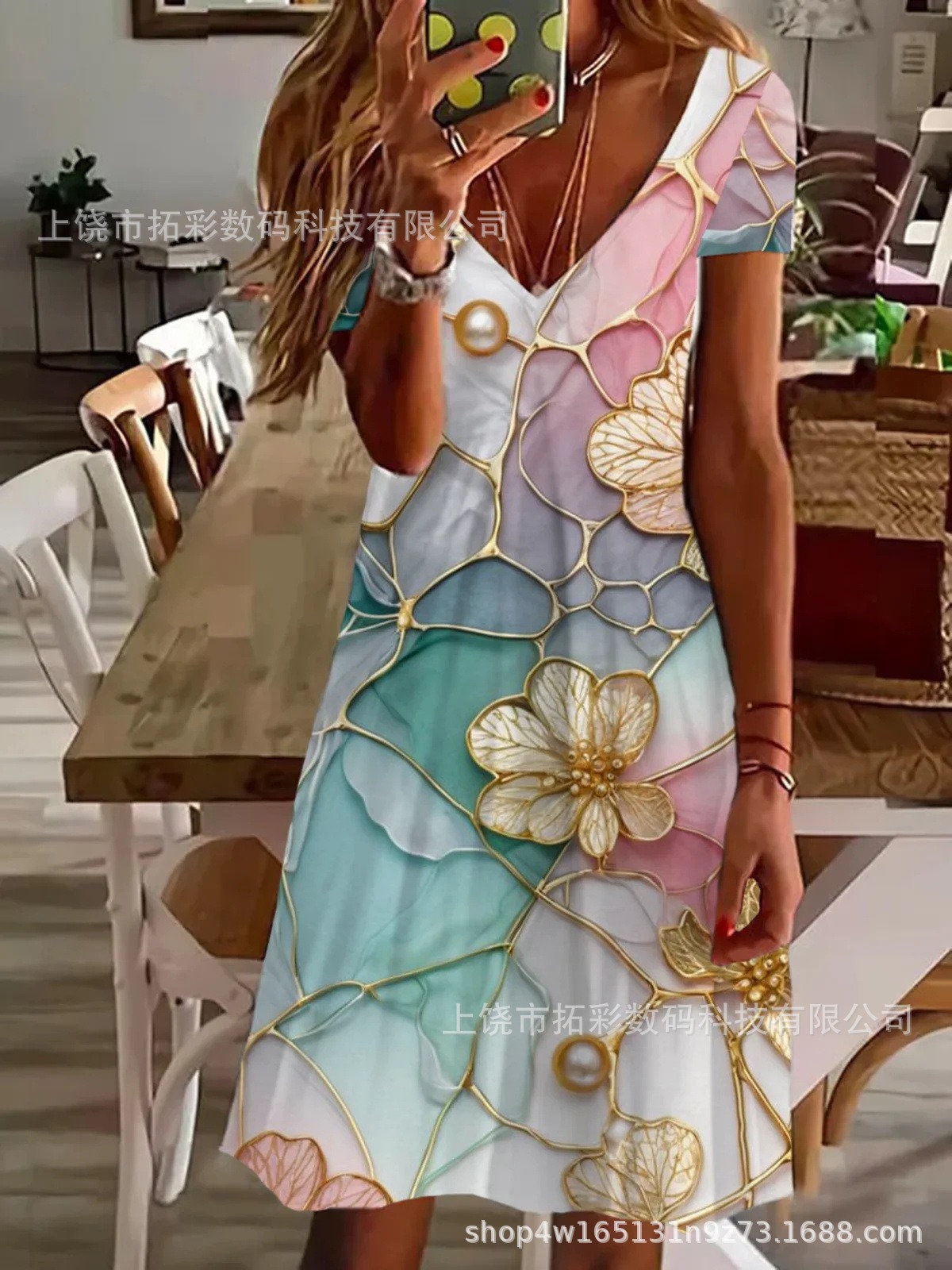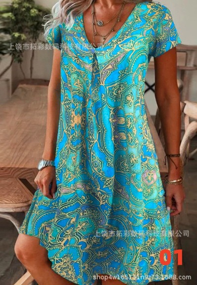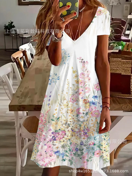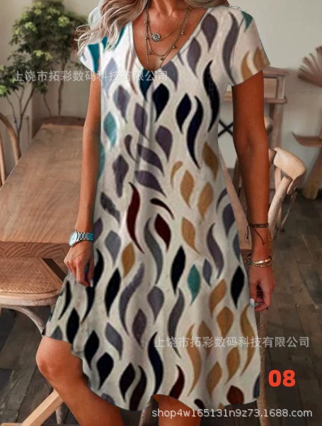봄 여름 새로운 크로스보더 아마존 독립 스테이션 여성의 느슨한 패션 V 넥 3D 프린트 반소매 드레스스토어 가기