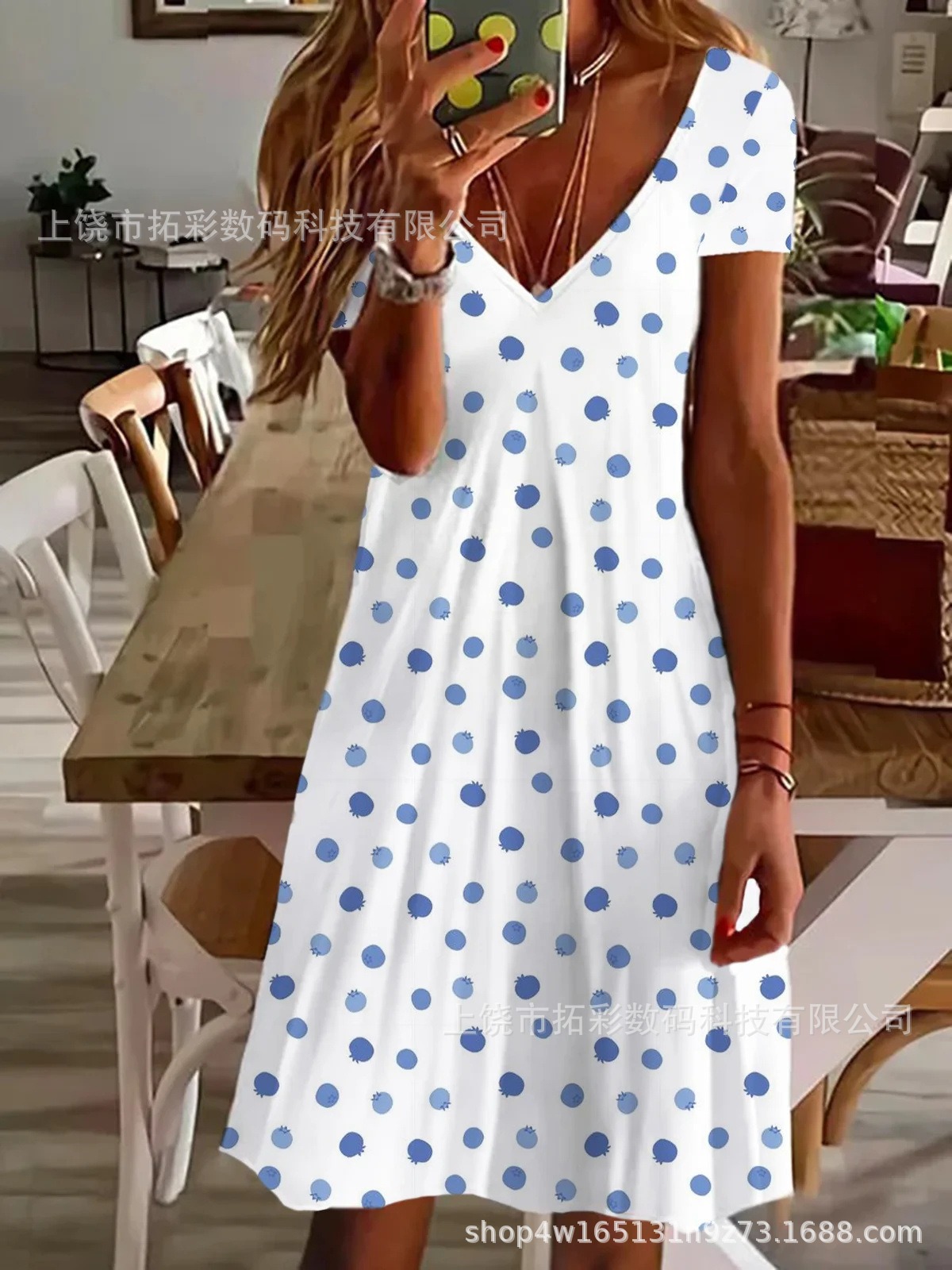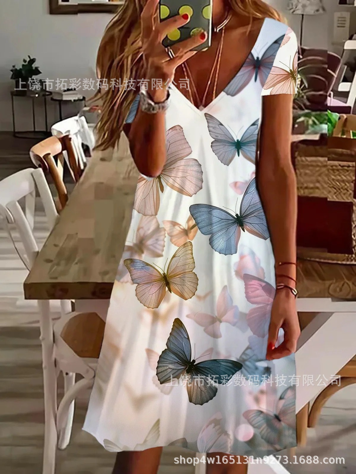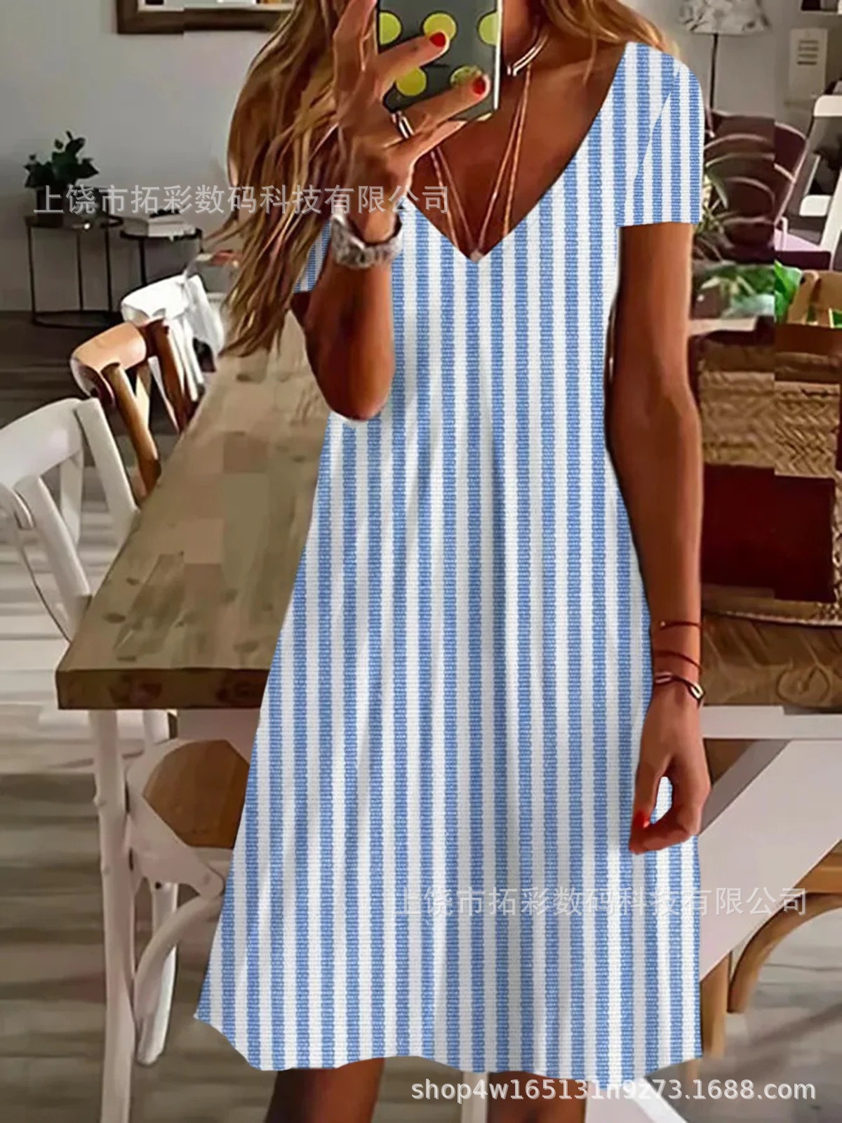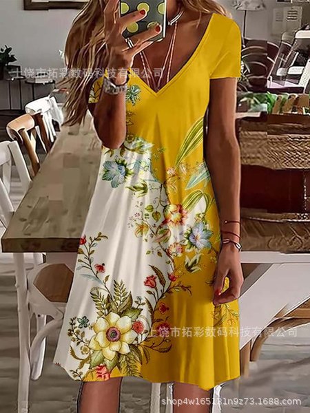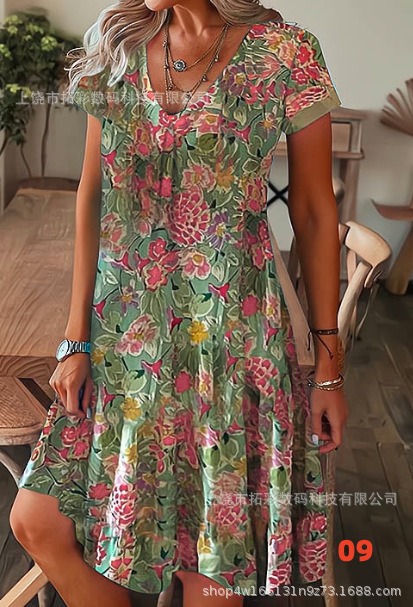 봄 여름 새로운 크로스보더 아마존 독립 스테이션 여성의 느슨한 패션 V 넥 3D 프린트 반소매 드레스스토어 가기