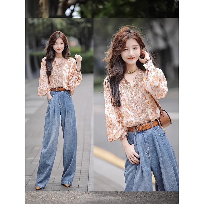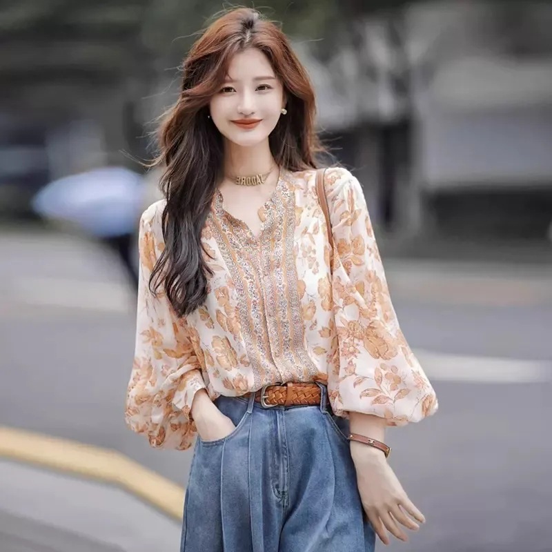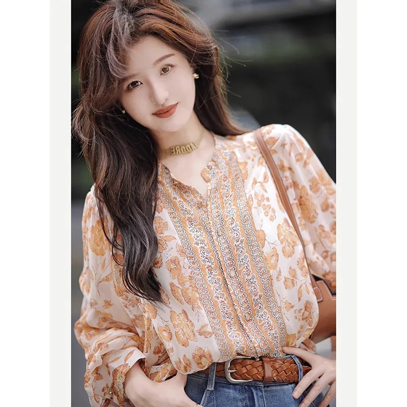 여성을 위한 프렌치 스타일 하이엔드 쉬폰 탑 2025 봄 새로운 스타일의 나이를 줄여주는 디자인 긴팔 꽃무늬 셔츠스토어 가기