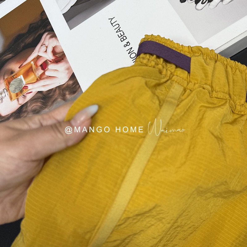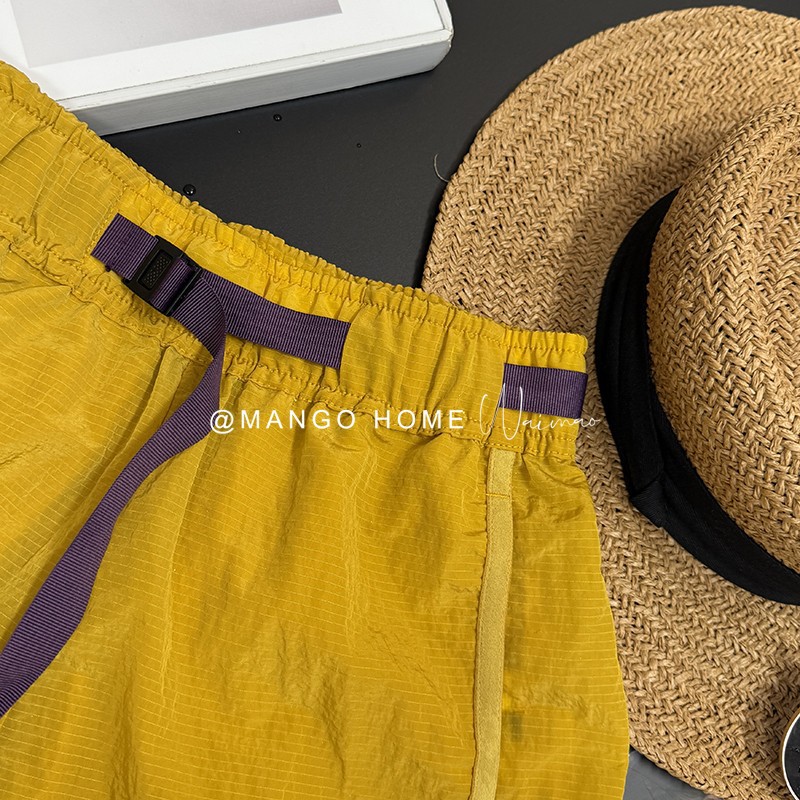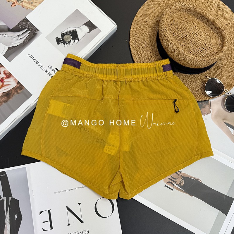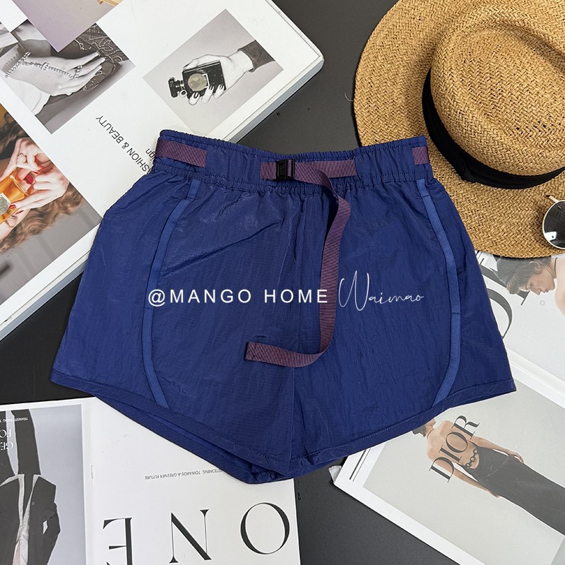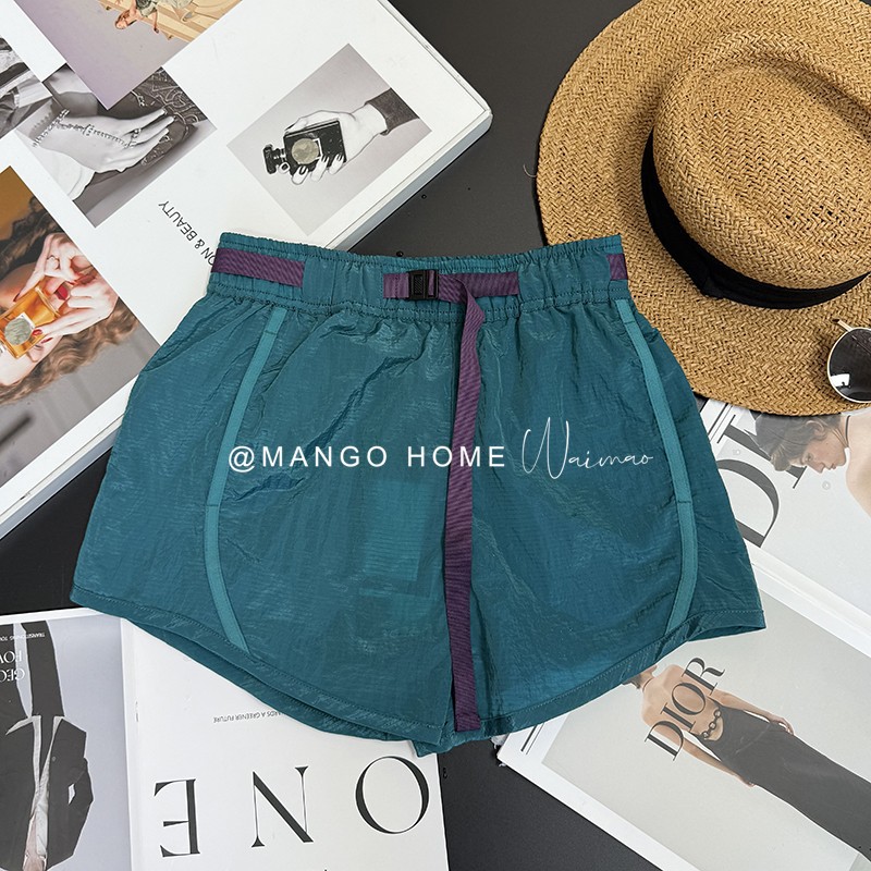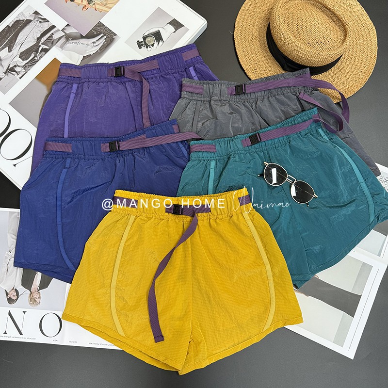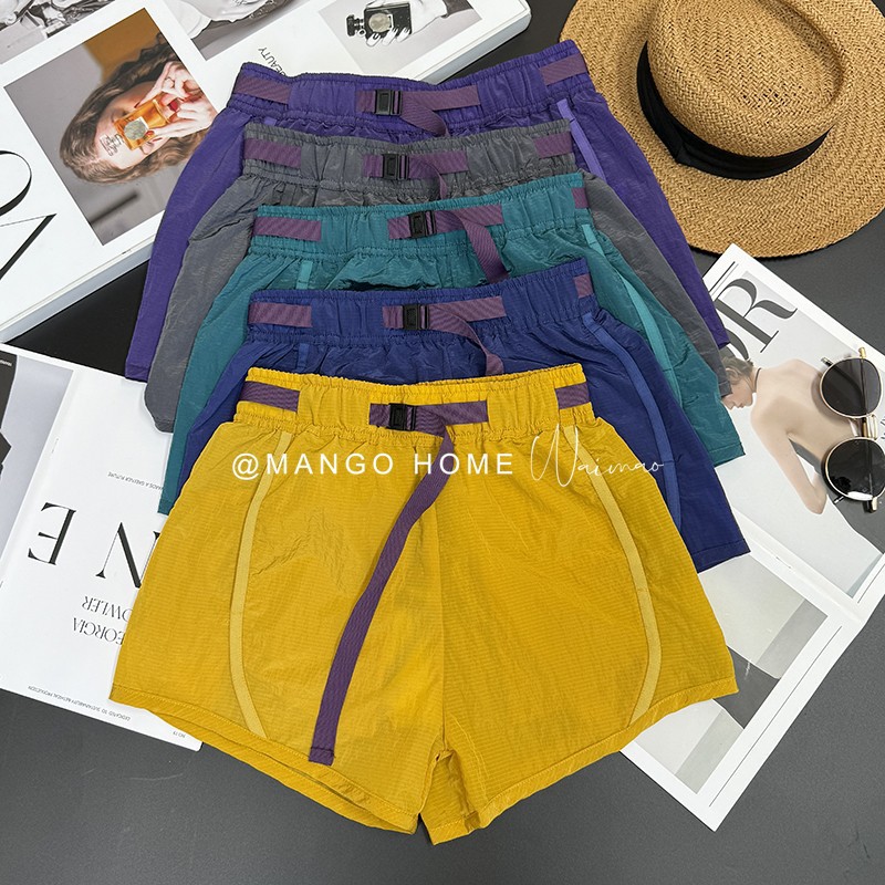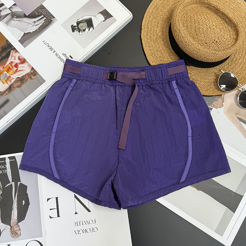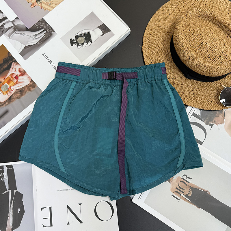 2025년 신상 여름 스타일 메탈릭 광택 대비 컬러 벨트로 살을 커버하고 슬림해 보이고 가볍고 속건성이 뛰어난 여성용 스포츠 3점 반바지