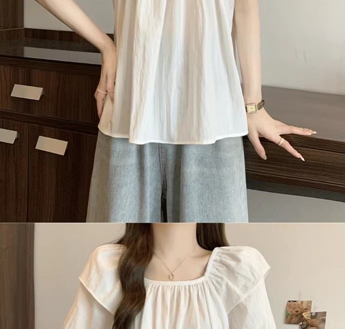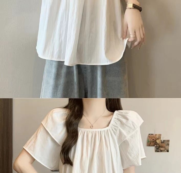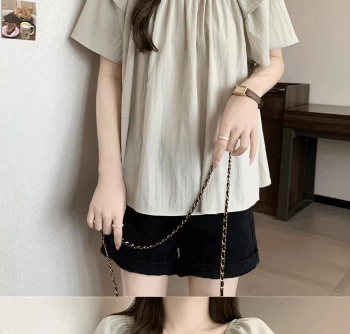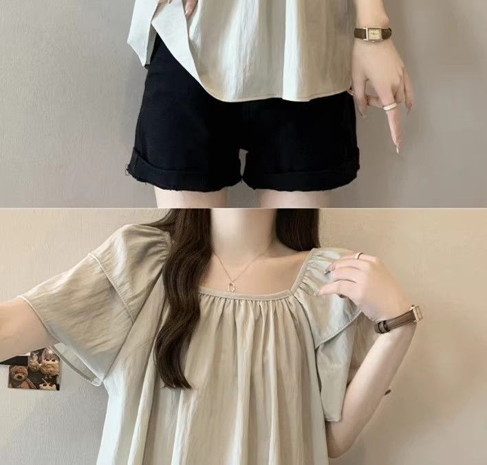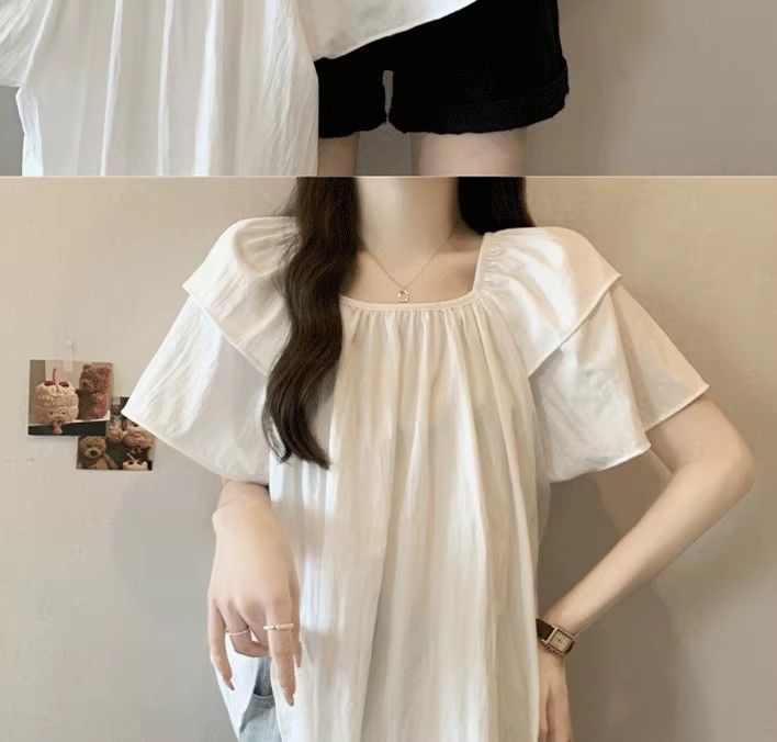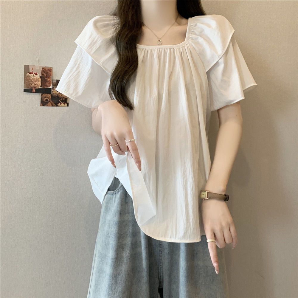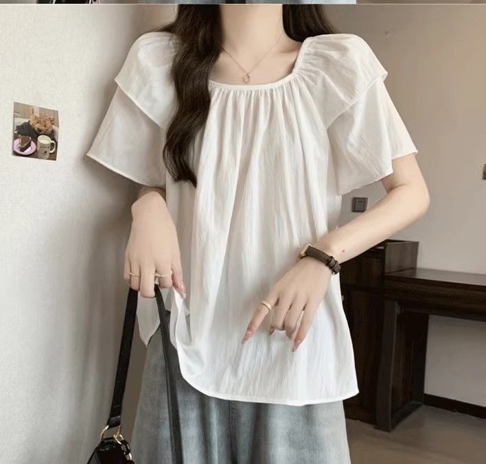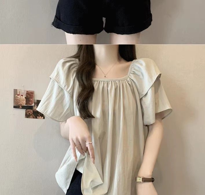 플러스 사이즈, 달콤한 스타일, 레트로 스퀘어 넥 쉬폰 반팔 셔츠, 뚱뚱한 여성을 위한 루즈하고 슬림하며 배를 덮는 다용도 탑스토어 가기