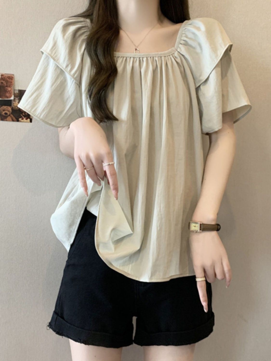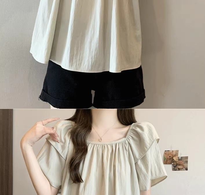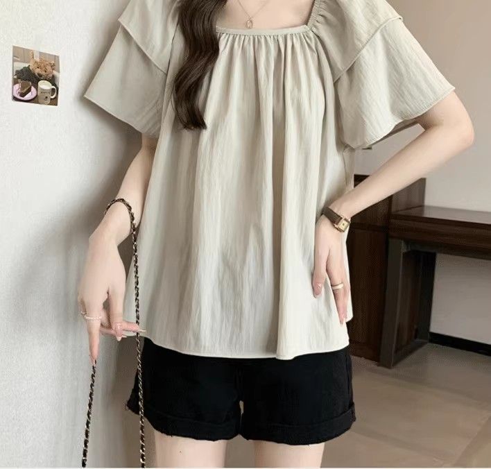 플러스 사이즈, 달콤한 스타일, 레트로 스퀘어 넥 쉬폰 반팔 셔츠, 뚱뚱한 여성을 위한 루즈하고 슬림하며 배를 덮는 다용도 탑