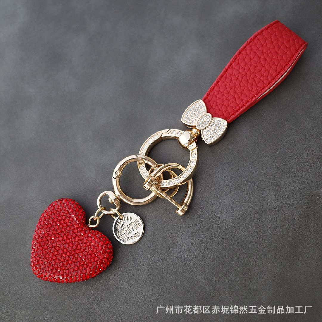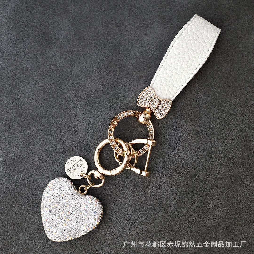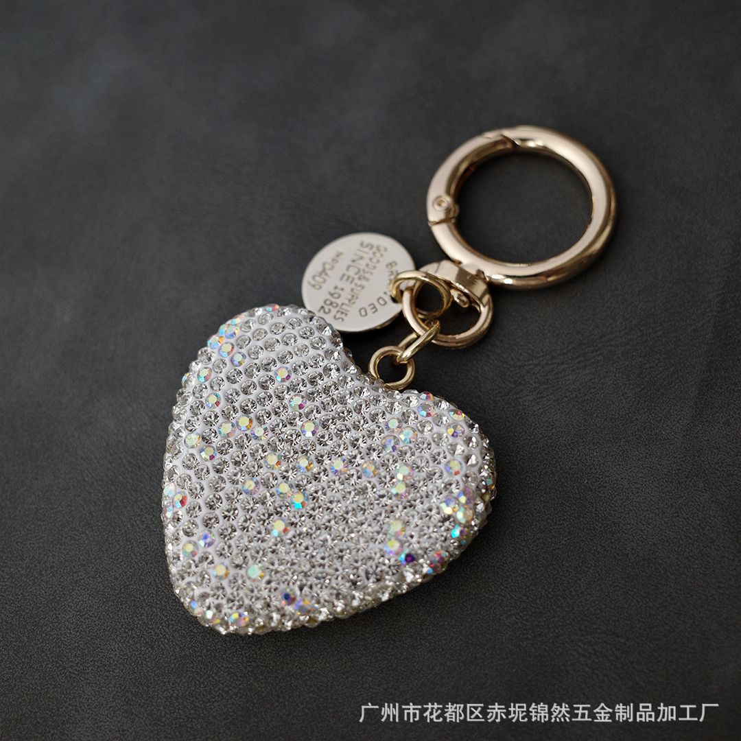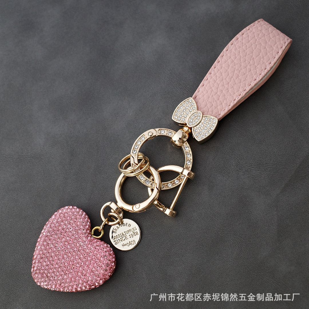 다이아몬드가 박힌 복숭아 하트 점토 열쇠 고리, 다이아몬드가 가득한 자동차 열쇠 펜던트, 보석 가방, 딸기 리본 하트 펜던트