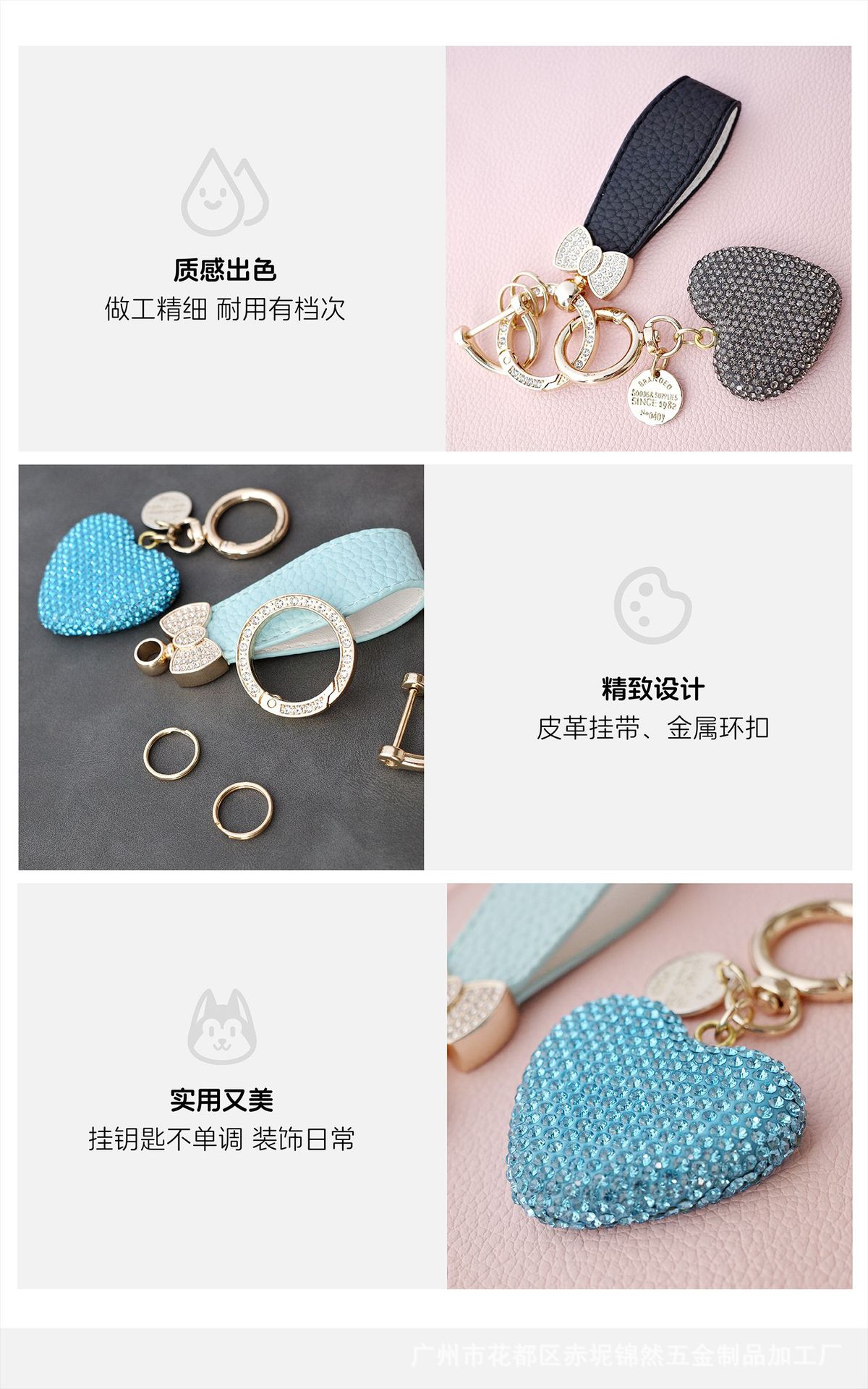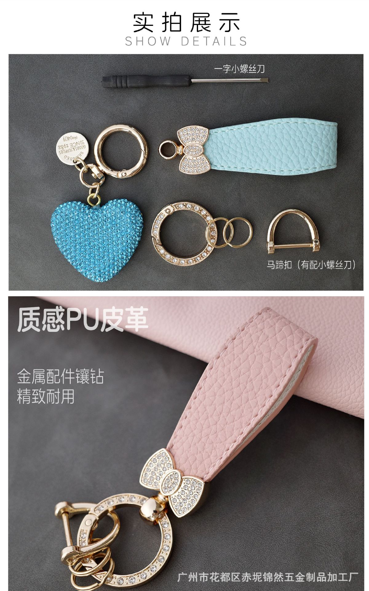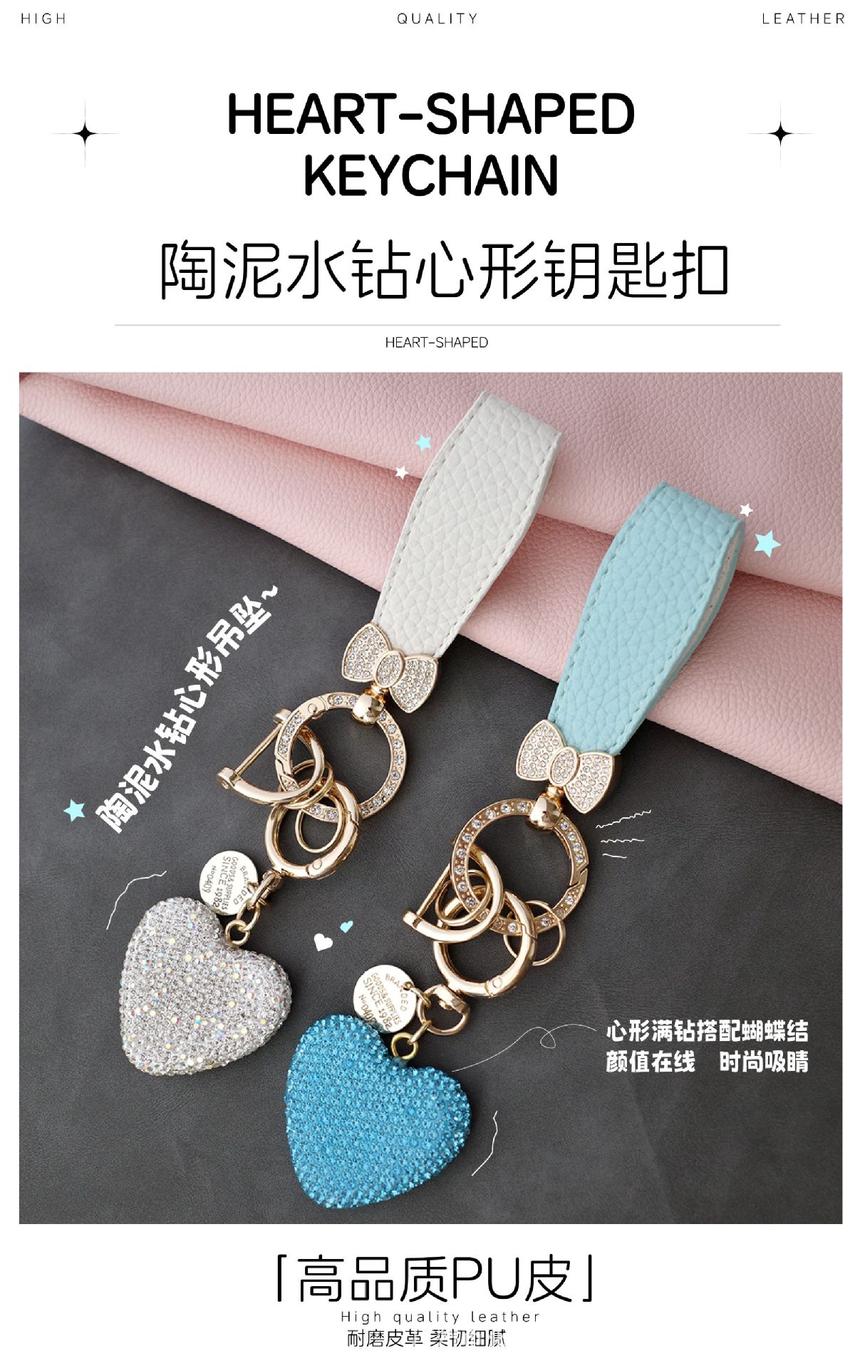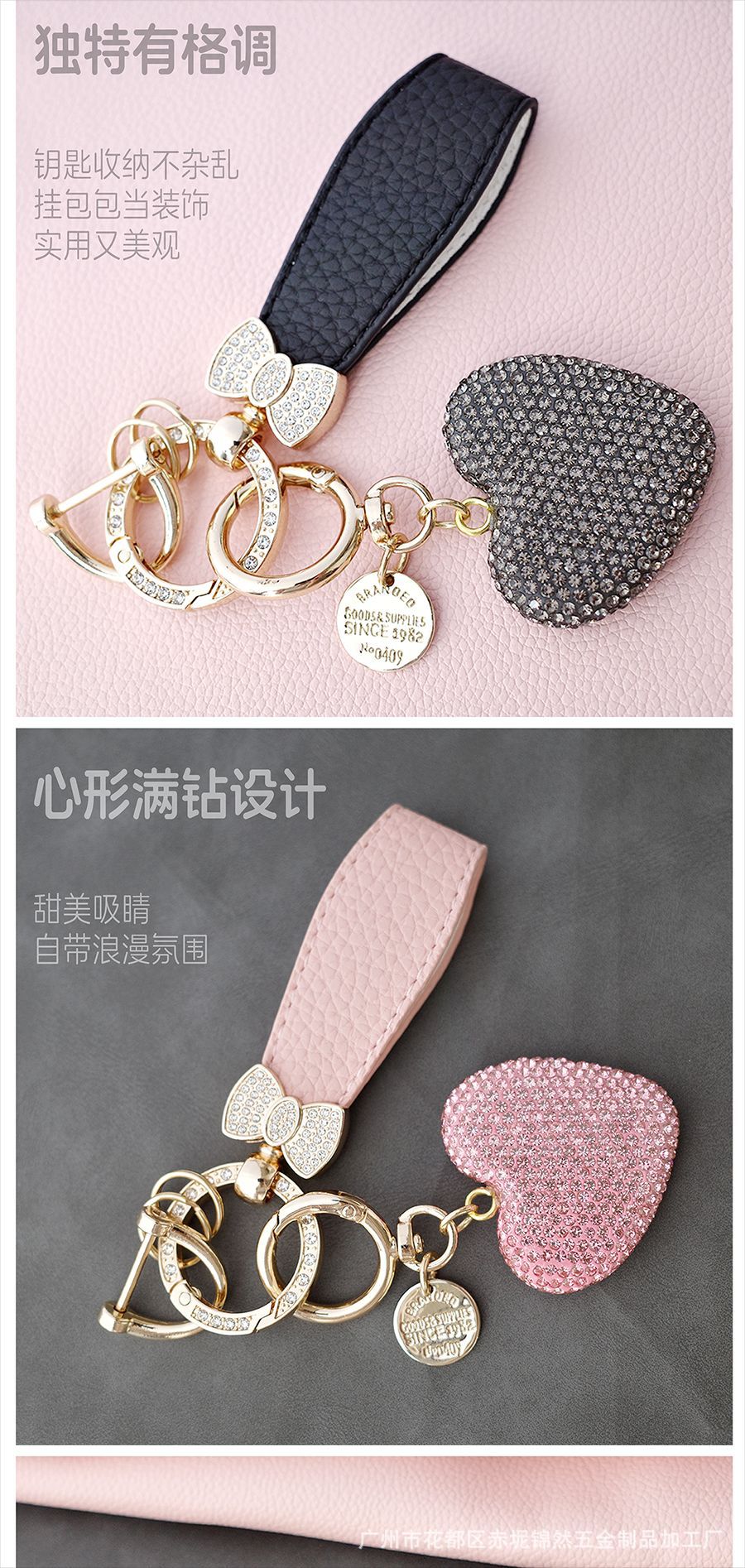 다이아몬드가 박힌 복숭아 하트 점토 열쇠 고리, 다이아몬드가 가득한 자동차 열쇠 펜던트, 보석 가방, 딸기 리본 하트 펜던트