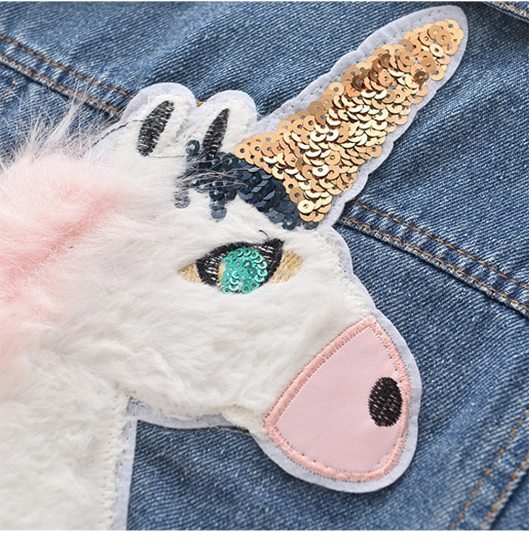 봄과 가을 한국 스타일 소녀 스팽글 긴팔 데님 탑 아기 소녀 유행 유니콘 데님 코트 재킷스토어 가기