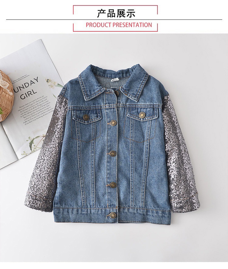 봄과 가을 한국 스타일 소녀 스팽글 긴팔 데님 탑 아기 소녀 유행 유니콘 데님 코트 재킷