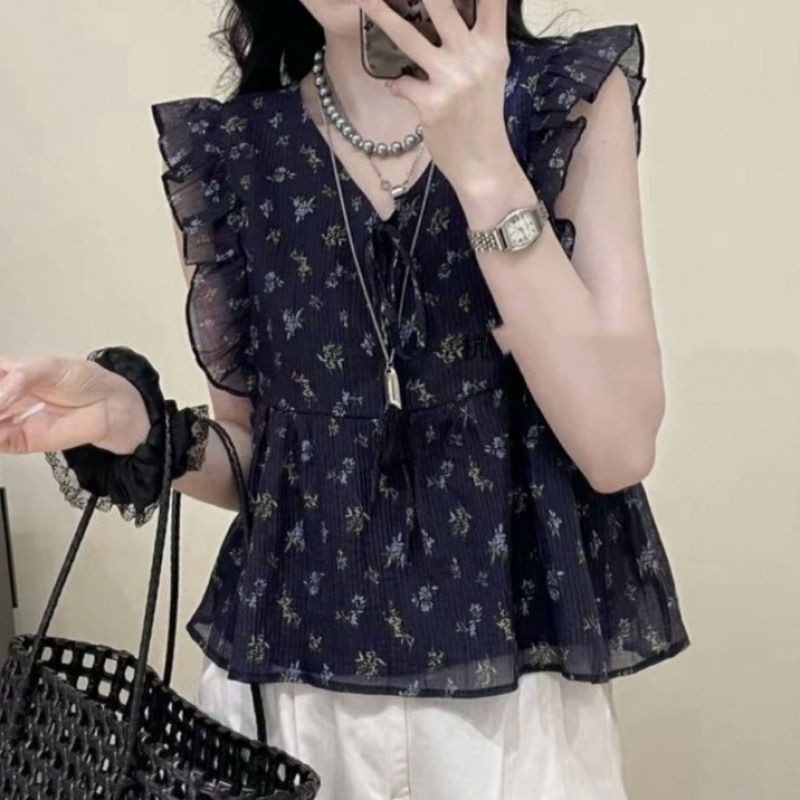 한국 스타일의 러플 플로럴 브이넥 소매가 있는 여성용 셔츠 2025년 여름 신상 패셔너블하고 다재다능한 쉬폰 탑스토어 가기