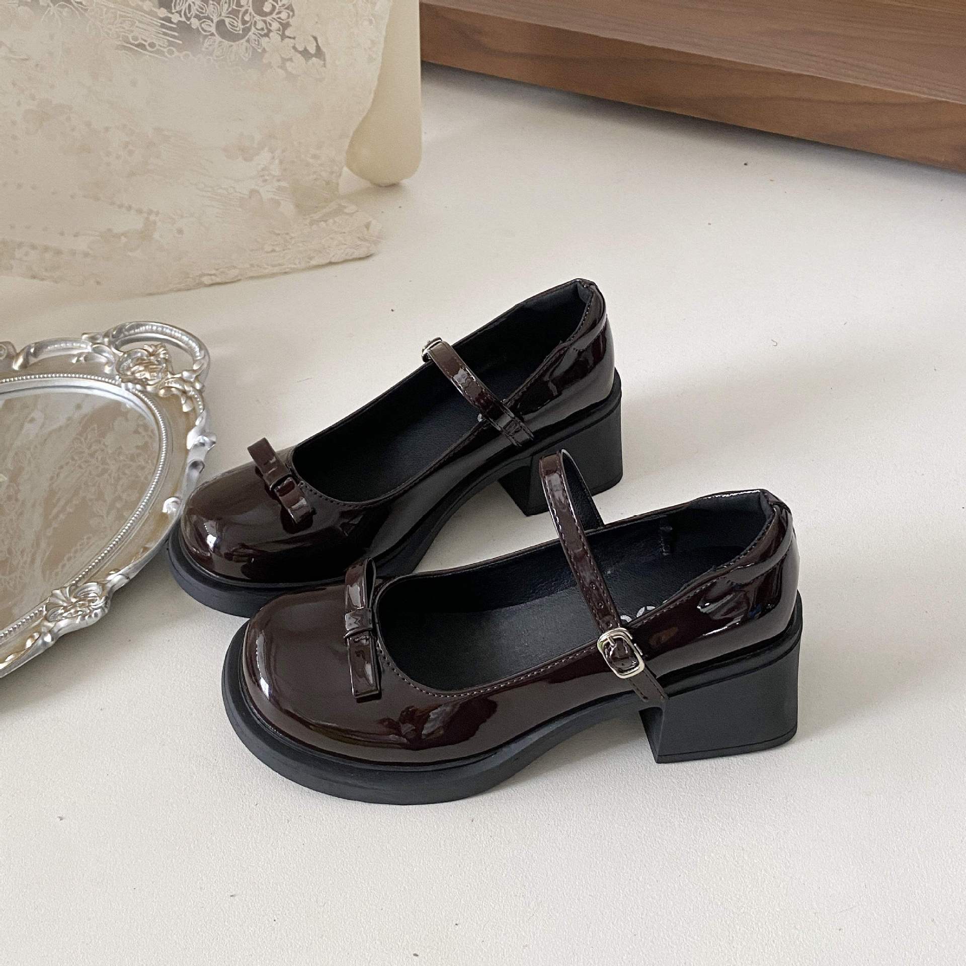 여성을위한 두꺼운 굽 복고풍 메리 제인 신발 2025 가을 새로운 스타일 Bowknot 일본 jk 다목적 갈색 버클 작은 가죽 신발스토어 가기