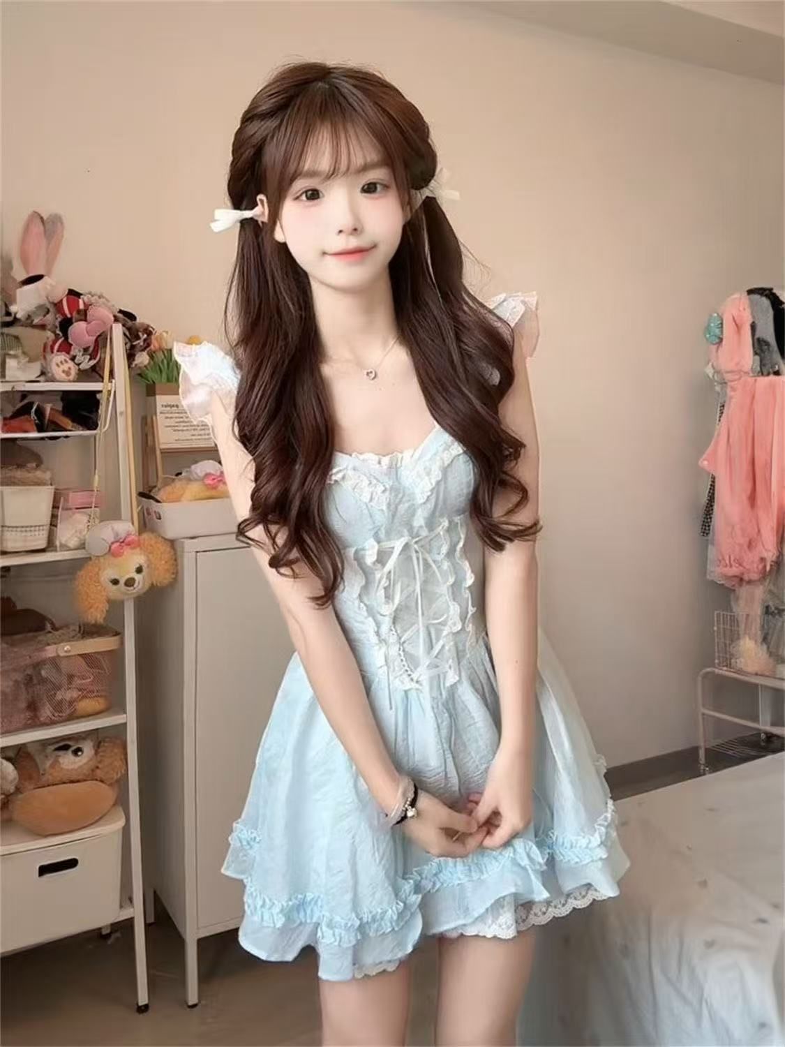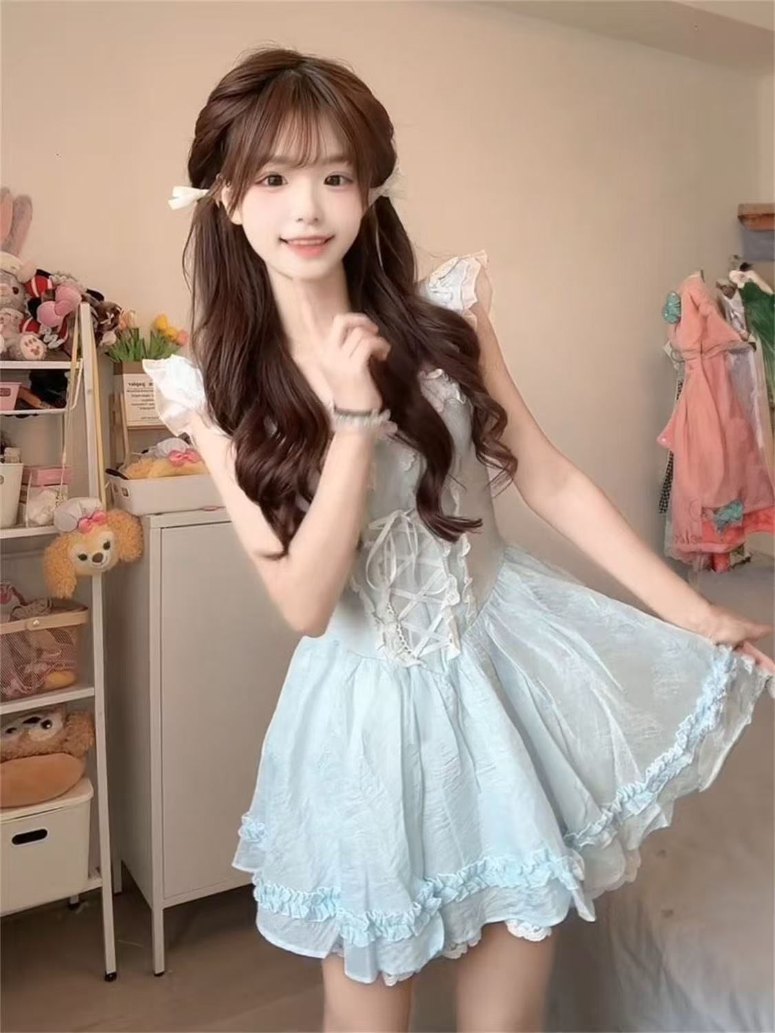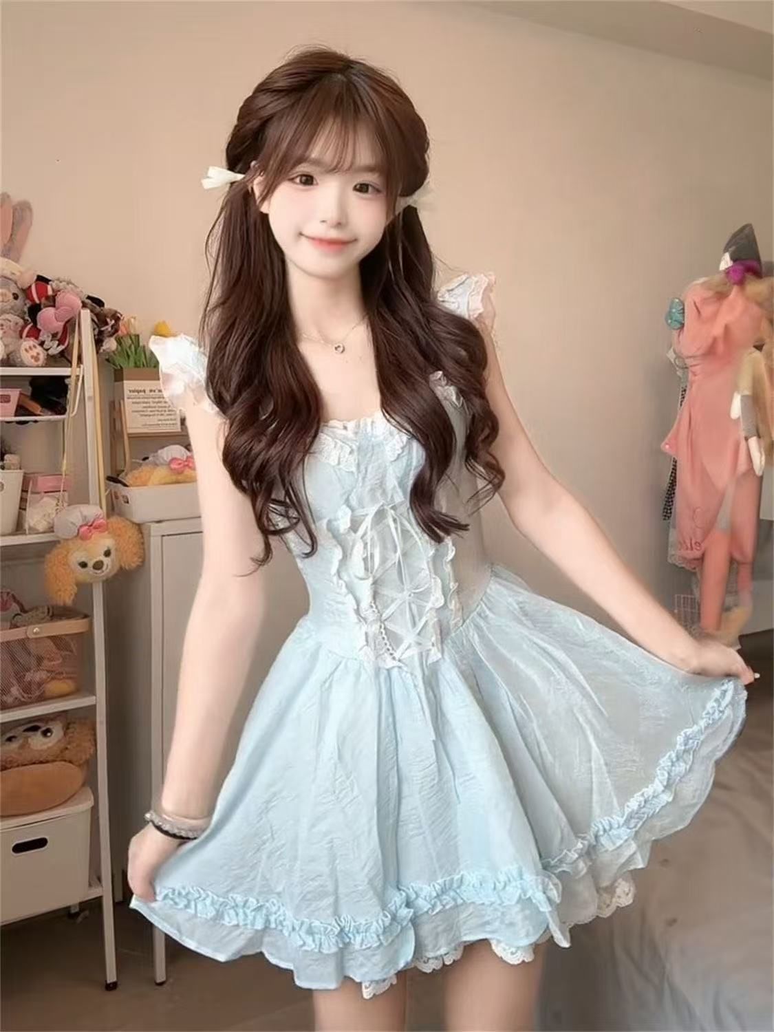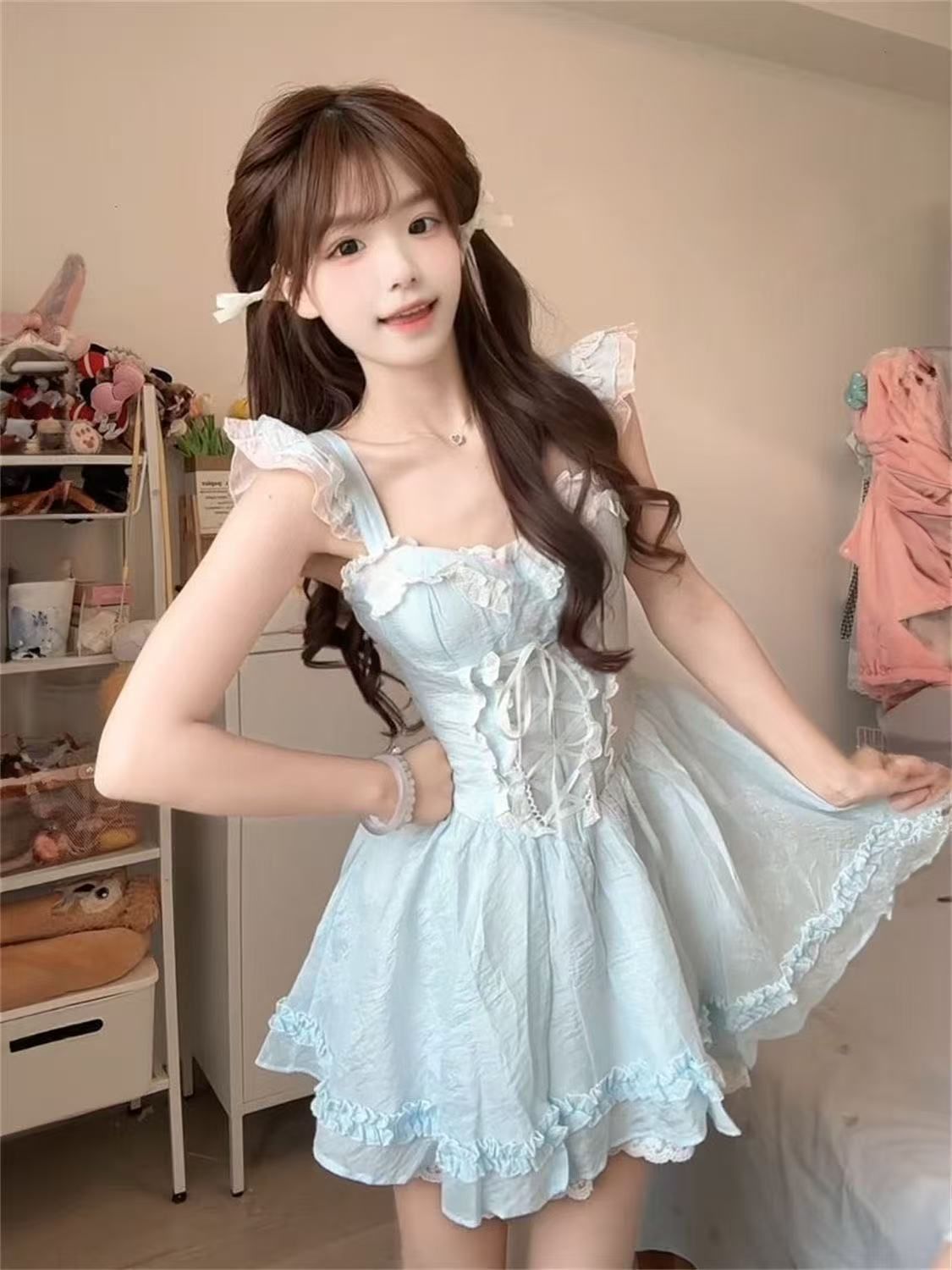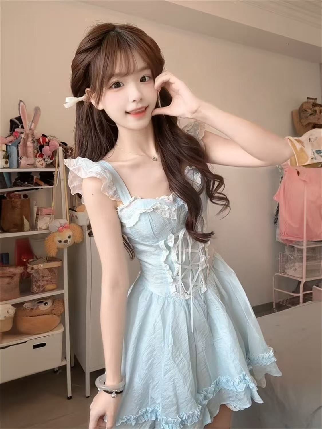프랑스 스타일 귀여운 여성스러운 슈퍼 요정 블루 레이스 스퀘어 칼라 서스펜더 드레스 여성의 새로운 푹신한 스커트스토어 가기