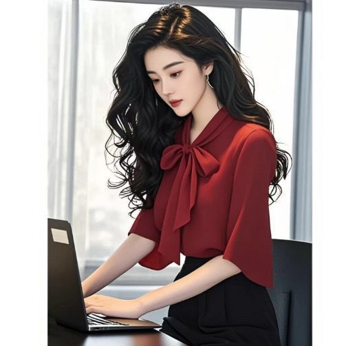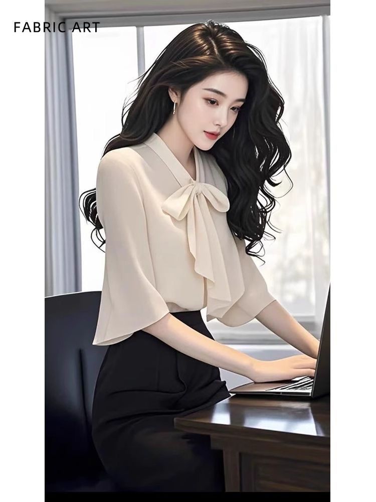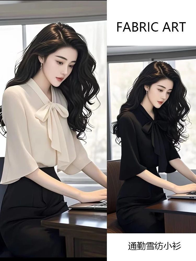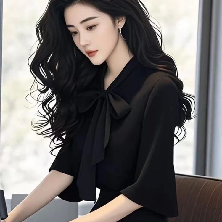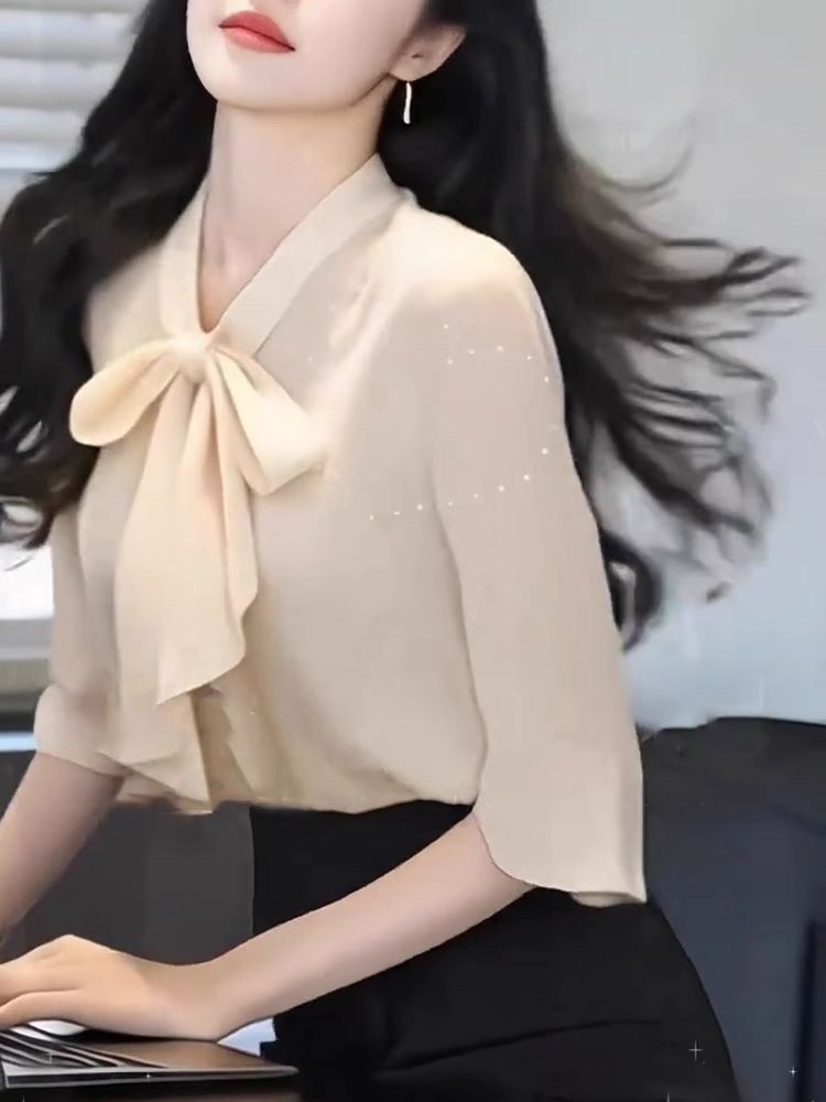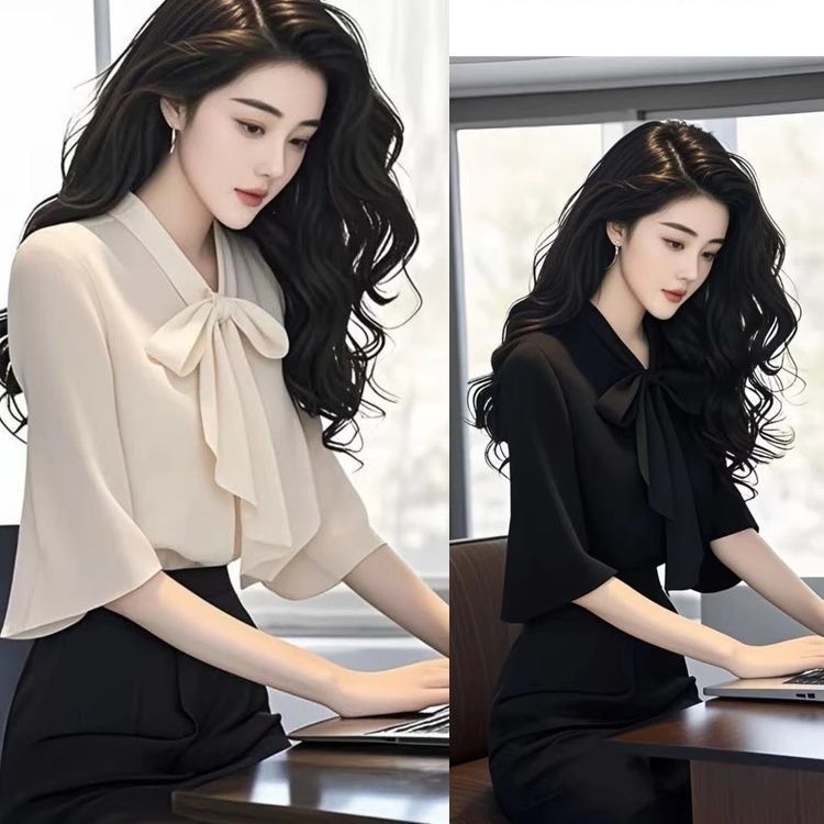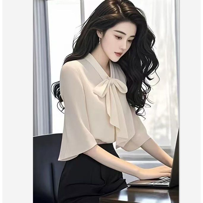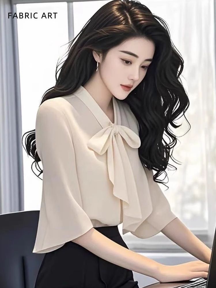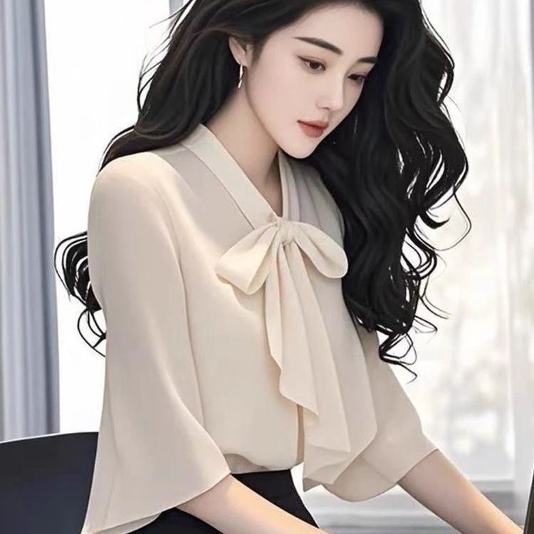 2025 새로운 여름 패션 여성 스타일 슬림 셔츠 여성용 보우 마이크로 플레어 슬리브 쉬폰 셔츠 탑 트렌디스토어 가기