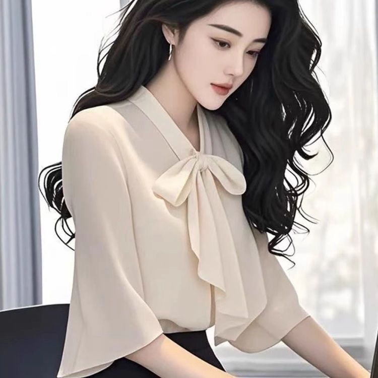 2025 새로운 여름 패션 여성 스타일 슬림 셔츠 여성용 보우 마이크로 플레어 슬리브 쉬폰 셔츠 탑 트렌디