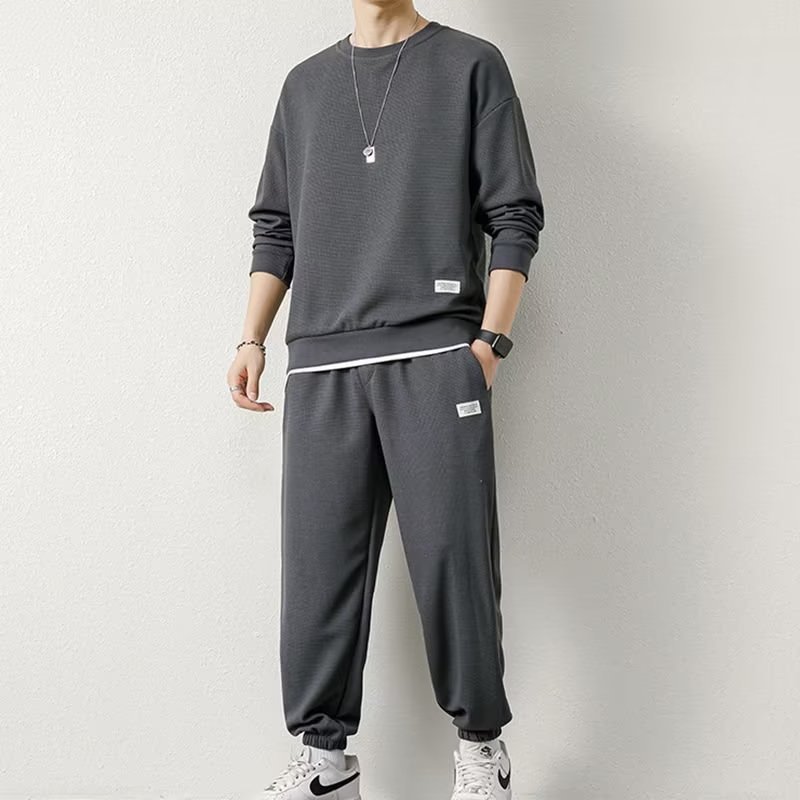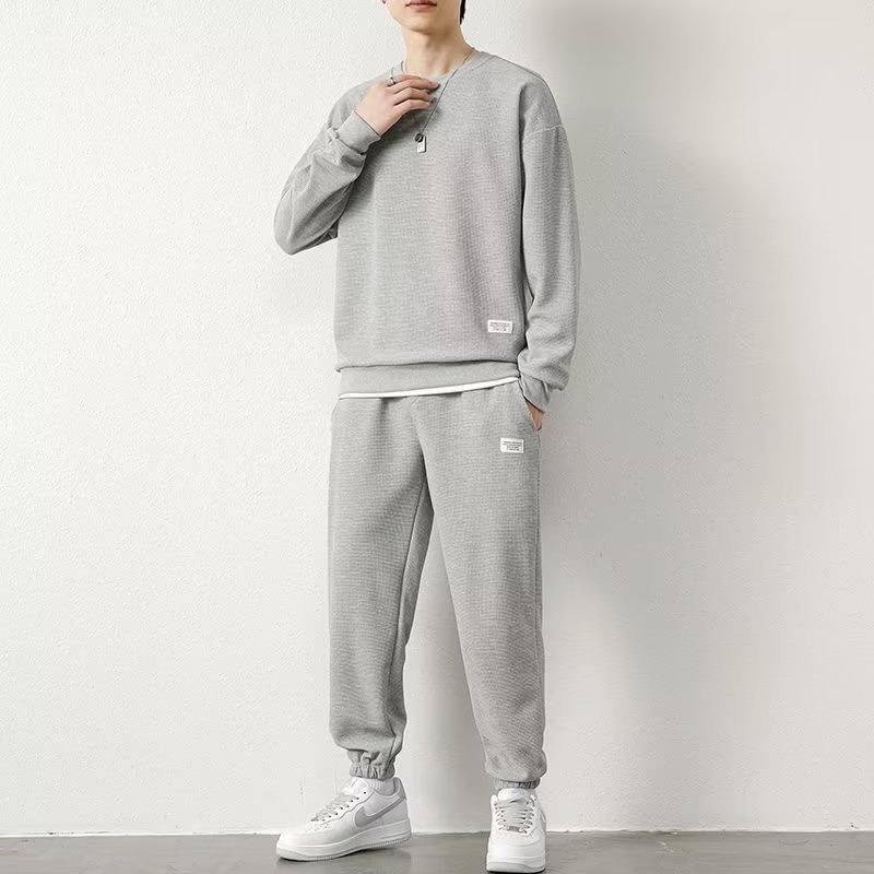 와플 긴팔 세트 남성용 스웨트셔츠와 스웨트팬츠 투피스 세트 봄 가을 트렌디한 단색 남성 스포츠 세트