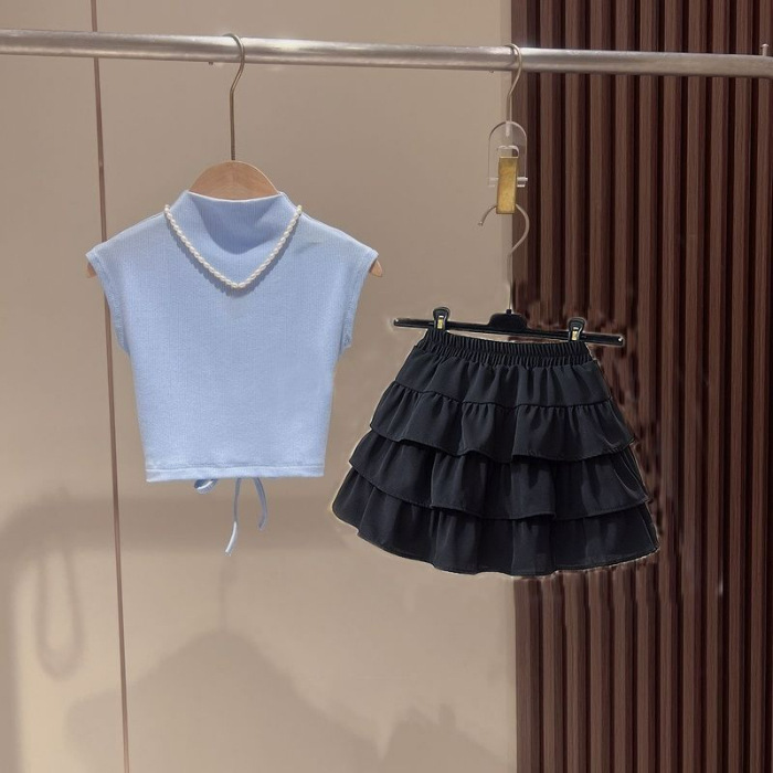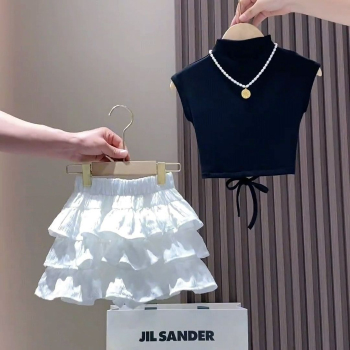 여자 여름 정장 2025 새로운 어린이 반팔 티셔츠 주름 치마 투피스 세트 아기 소녀 치마 바지 서양식 여름 옷