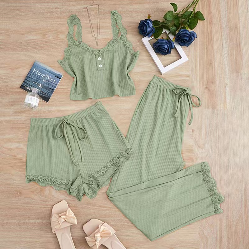여성용 슬림핏 크로스보더 레이스 3피스 슈트 캐미솔 반바지 바지 잠옷